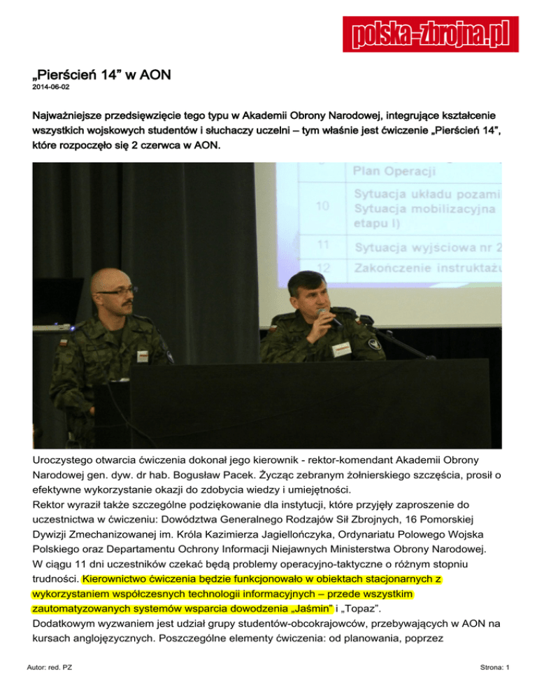„Pierścień 14” w AON 2014-06-02 Najważniejsze przedsięwzięcie tego typu w Akademii Obrony Narodowej, integrujące kształcenie wszystkich wojskowych studentów i słuchaczy uczelni – tym właśnie jest ćwiczenie „Pierścień 14”, które rozpoczęło się 2 czerwca w AON. Uroczystego otwarcia ćwiczenia dokonał jego kierownik - rektor-komendant Akademii Obrony Narodowej gen. dyw. dr hab. Bogusław Pacek. Życząc zebranym żołnierskiego szczęścia, prosił o efektywne wykorzystanie okazji do zdobycia wiedzy i umiejętności. Rektor wyraził także szczególne podziękowanie dla instytucji, które przyjęły zaproszenie do uczestnictwa w ćwiczeniu: Dowództwa Generalnego Rodzajów Sił Zbrojnych, 16 Pomorskiej Dywizji Zmechanizowanej im. Króla Kazimierza Jagiellończyka, Ordynariatu Polowego Wojska Polskiego oraz Departamentu Ochrony Informacji Niejawnych Ministerstwa Obrony Narodowej. W ciągu 11 dni uczestników czekać będą problemy operacyjno-taktyczne o różnym stopniu trudności. Kierownictwo ćwiczenia będzie funkcjonowało w obiektach stacjonarnych z wykorzystaniem współczesnych technologii informacyjnych – przede wszystkim zautomatyzowanych systemów wsparcia dowodzenia „Jaśmin” i „Topaz”. Dodatkowym wyzwaniem jest udział grupy studentów-obcokrajowców, przebywających w AON na kursach anglojęzycznych. Poszczególne elementy ćwiczenia: od planowania, poprzez Autor: red. PZ Strona: 1 prowadzenie odpraw i dokumentacji, aż po stawianie zadań, prowadzone będą w dwóch językach. Ćwiczenia pod kryptonimem „Pierścień” są corocznym przedsięwzięciem dydaktycznym w AON, integrującym z jednej strony wysiłek dydaktyczny wykładowców, a z drugiej strony ukierunkowanym na indywidualne i zespołowe nabywanie kompetencji dowódczo-sztabowych przez oficerów – studentów i słuchaczy, w zakresie rozwiązywania złożonych problemów operacyjno-taktycznych współczesnego pola walki. Tekst: Alademia Obrony Narodowej Autor: red. PZ Strona: 2