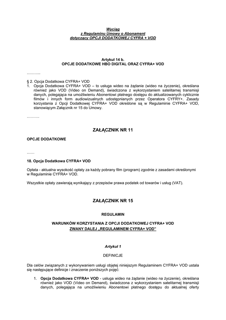 Wyciąg z Regulaminu Umowy o Abonament dotyczący OPCJI DODATKOWEJ CYFRA + VOD Artykuł 14 b. OPCJE DODATKOWE HBO DIGITAL ORAZ CYFRA+ VOD ……….. § 2. Opcja Dodatkowa CYFRA+ VOD 1. Opcja Dodatkowa CYFRA+ VOD – to usługa wideo na żądanie (wideo na życzenie), określana również jako VOD (Video on Demand), świadczona z wykorzystaniem satelitarnej transmisji danych, polegająca na umożliwieniu Abonentowi płatnego dostępu do aktualizowanych cyklicznie filmów i innych form audiowizualnych udostępnianych przez Operatora CYFRY+. Zasady korzystania z Opcji Dodatkowej CYFRA+ VOD określone są w Regulaminie CYFRA+ VOD, stanowiącym Załącznik nr 15 do Umowy. ………. ZAŁĄCZNIK NR 11 OPCJE DODATKOWE …… 18. Opcja Dodatkowa CYFRA+ VOD Opłata - aktualna wysokość opłaty za każdy pobrany film (program) zgodnie z zasadami określonymi w Regulaminie CYFRA+ VOD. Wszystkie opłaty zawierają wynikający z przepisów prawa podatek od towarów i usług (VAT). ZAŁĄCZNIK NR 15 REGULAMIN WARUNKÓW KORZYSTANIA Z OPCJI DODATKOWEJ CYFRA+ VOD ZWANY DALEJ „REGULAMINEM CYFRA+ VOD” Artykuł 1 DEFINICJE Dla celów związanych z wykonywaniem usługi objętej niniejszym Regulaminem CYFRA+ VOD ustala się następujące definicje i znaczenie poniższych pojęć: 1. Opcja Dodatkowa CYFRA+ VOD - usługa wideo na żądanie (wideo na życzenie), określana również jako VOD (Video on Demand), świadczona z wykorzystaniem satelitarnej transmisji danych, polegająca na umożliwieniu Abonentowi płatnego dostępu do aktualnej oferty 2. 3. 4. 5. 6. 7. 8. 9. Operatora CYFRY+ zawierającej aktualizowane cyklicznie filmy i inne formy audiowizualne udostępniane przez Operatora CYFRY+ określone w niniejszym Regulaminie CYFRA+ VOD. Umowa – Umowa o Abonament zawierana przez Operatora CYFRY+ z Abonentem na odbiór programów oferowanych przez Operatora CYFRY+ w ramach Pakietów i Opcji. Regulamin Umowy – regulamin Umowy o Abonament stanowiący jej integralną część. Aktywacja Filmu – złożenie przez Abonenta zamówienia na wybrany Film, powodujące uruchomienie sygnału umożliwiającego Abonentowi korzystanie z Filmu w Okresie Dostępu. Film - poszczególne filmy i inne formy audiowizualne, dostępne w ramach Opcji Dodatkowej CYFRA+ VOD. Okres Dostępu – okres 48 godzin, na jaki Film udostępniany jest przez Operatora CYFRY+, liczony od chwili Aktywacji Filmu. Okres Aktualizacyjny – okres, w jakim Operator CYFRY+ dokonuje ciągłej aktualizacji wszystkich Filmów dostępnych w aktualnej ofercie Opcji Dodatkowej CYFRA+ VOD. Terminal HD PVR – Sprzęt w rozumieniu Umowy, udostępniany Abonentowi przez Operatora CYFRY+ na podstawie Umowy, umożliwiający nagrywanie programów oraz korzystanie z Opcji Dodatkowej CYFRA+ VOD. Opłata VOD - opłata za korzystanie z danego Filmu w ramach Opcji Dodatkowej CYFRA+ VOD określona i dostępna przy użyciu Terminalu HD PVR w menu Opcji Dodatkowej CYFRA+ VOD. Artykuł 2 POSTANOWIENIA OGÓLNE Operator CYFRY+ zobowiązuje się do świadczenia Opcji Dodatkowej CYFRA+ VOD na warunkach określonych w niniejszym Regulaminie CYFRA+ VOD, zaś Abonent zobowiązuje się do ich przestrzegania, w tym do terminowego uiszczania Opłaty VOD. Artykuł 3 ZAKRES I WARUNKI KORZYSTANIA Z OPCJI DODATKOWEJ CYFRA+ VOD 1. Warunkiem korzystania z Opcji Dodatkowej CYFRA+ VOD jest posiadanie przez Abonenta aktualnej Umowy na odbiór Pakietu (z wyłączeniem Pakietu Powitalnego+ oraz Pakietu Startowego) oraz posiadanie przez Abonenta prawidłowo zainstalowanego i działającego, zgodnie z instrukcją, aktywnego Terminalu HD PVR. 2. Przed rozpoczęciem korzystania z Opcji Dodatkowej CYFRA+ VOD, Abonent ma obowiązek zapoznania się z Regulaminem CYFRA+ VOD, który jest dostępny w ramach Regulaminu Umowy, na stronie internetowej Operatora CYFRY+, w Centrum Telefonicznym Abonentów Operatora CYFRY+ oraz u Autoryzowanego Dystrybutora Operatora CYFRY+. 3. Od momentu Aktywacji Filmu Abonent przez Okres Dostępu, korzysta z Filmu w ramach Opcji Dodatkowej CYFRA+ VOD. 4. Operator CYFRY+ udostępnia Filmy, w ramach Opcji Dodatkowej CYFRA+ VOD, na Okres Dostępu z zastrzeżeniem postanowień art. 7 pkt 2. niniejszego Regulaminu. Niemożliwe jest skorzystanie z Filmu po upływie Okresu Dostępu. Operator CYFRY+ może po upływie Okresu Dostępu usunąć Film z aktualnej oferty Opcji Dodatkowej CYFRA+ VOD. 5. Operator CYFRY+ decyduje o aktualnej zawartości oferty Opcji Dodatkowej CYFRA+ VOD. Operator CYFRY+ zastrzega sobie prawo zmiany tytułów Filmów, wycofania lub chwilowego braku Filmów w aktualnej ofercie Opcji Dodatkowej CYFRA+ VOD oraz prawo do zmiany zawartości tej oferty z przyczyn technicznych, o których mowa w art. 7 pkt 2. Regulaminu CYFRA+ VOD lub w związku z aktualizacją Opcji Dodatkowej CYFRA+ VOD. 6. Opis aktualnej zawartości oferty w ramach Opcji Dodatkowej CYFRA+ VOD dostępny będzie przy użyciu Terminalu HD PVR w menu Opcji Dodatkowej CYFRA+ VOD. 7. Operator CYFRY+ zastrzega sobie prawo do wprowadzania innych niż określone w niniejszym Regulaminie CYFRA+ VOD sposobów Aktywacji Filmu oraz sposobów dokonywania zmian w Opcji Dodatkowej CYFRA+ VOD w trakcie korzystania z Opcji Dodatkowej CYFRA+ VOD, w miarę powstawania możliwości technicznych. O zamiarze wprowadzania powyższych zmian, Operator CYFRY+ poinformuje Abonentów z odpowiednim wyprzedzeniem. 8. Korzystanie z Opcji Dodatkowej CYFRA+ VOD nie wyłącza możliwości korzystania przez Abonenta z innych usług świadczonych przez Operatora CYFRY+ w ramach i na warunkach Umowy. 9. Do Opcji Dodatkowej CYFRA+ VOD stosuje się postanowienia Regulaminu Umowy dotyczące Opcji Dodatkowej, o ile postanowienia niniejszego Regulaminu CYFRA+ VOD nie stanowią inaczej. Artykuł 4 AKTYWACJA OPCJI DODATKOWEJ CYFRA+ VOD 1. Aktywacji Filmu dokonuje się na wniosek Abonenta złożony: telefonicznie pod aktualnym numerem telefonu Centrum Telefonicznego Abonentów Operatora CYFRY+, za pomocą SMS lub za pośrednictwem