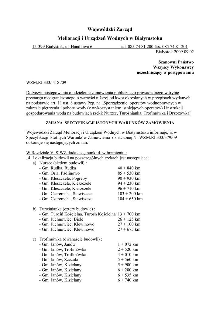 Wojewódzki Zarząd Melioracji i Urządzeń Wodnych w Białymstoku 15-399 Białystok, ul. Handlowa 6 tel. 085 74 81 200 fax. 085 74 81 201 Białystok 2009.09.02 Szanowni Państwo Wszyscy Wykonawcy uczestniczący w postępowaniu WZM.RI.333/ 418 /09 Dotyczy: postępowania o udzielenie zamówienia publicznego prowadzonego w trybie przetargu nieograniczonego o wartości niższej od kwot określonych w przepisach wydanych na podstawie art. 11 ust. 8 ustawy Pzp. na „Sporządzenie operatów wodnoprawnych w zakresie piętrzenia i poboru wody (z wykorzystaniem istniejących operatów) i instrukcji gospodarowania wodą na budowlach rzeki: Nurzec, Turośnianka, Trofimówka i Brzozówka” ZMIANA SPECYFIKACJI ISTONYCH WARUNKÓW ZAMÓWIENIA Wojewódzki Zarząd Melioracji i Urządzeń Wodnych w Białymstoku informuje, iż w Specyfikacji Istotnych Warunków Zamówienia oznaczonej Nr WZM.RI.333/379/09 dokonuje się następujących zmian: W Rozdziale V. SIWZ dodaje się punkt 4. w brzmieniu : „4. Lokalizacja budowli na poszczególnych rzekach jest następująca: a) Nurzec (siedem budowli) : - Gm. Rudka, Rudka 40 + 840 km - Gm. Orla, Padlinowo 85 + 530 km - Gm. Kleszczele, Pogreby 90 + 930 km - Gm. Kleszczele, Kleszczele 94 + 230 km - Gm. Kleszczele, Kleszczele 96 + 710 km - Gm. Czeremcha, Stawiszcze 103 + 200 km - Gm. Czeremcha, Stawiszcze 104 + 650 km b) Turośnianka (cztery budowle) : - Gm. Turośń Kościelna, Turośń Kościelna - Gm. Juchnowiec, Biele - Gm. Juchnowiec, Klewinowo - Gm. Juchnowiec, Klewinowo 13 + 700 km 26 + 125 km 27 + 100 km 27 + 675 km c) Trofimówka (dwanaście budowli) : - Gm. Janów, Janów - Gm. Janów, Trofimówka - Gm. Janów, Trofimówka - Gm. Janów, Szczuki - Gm. Janów, Kizielany - Gm. Janów, Kizielany - Gm. Janów, Kizielany - Gm. Janów, Kizielany 1 + 072 km 2 + 520 km 4 + 010 km 5 + 560 km 5 + 900 km 6 + 280 km 6 + 535 km 6 + 740 km - Gm. Janów, Kizielewszczyzna - Gm. Janów, Kizielewszczyzna - Gm. Janów, Krasne - Gm. Suchowola, Piątak Tablewo 7 + 130 km 9 + 245 km 11 + 430 km 7 + 380 km d) Brzozówka (osiem budowli) : - Gm. Korycin, Brzozowa 26 + 830 km - Gm. Jasionówka, Kamionka 39 + 700 km - Gm. Jasionówka, Jasionówka 42 + 400 km - Gm. Jasionówka, Milewskie 50 + 720 km - Gm. Czarna Białostocka, Brzozówka Koronna 58 + 000 km - Gm. Czarna Białostocka, Brzozówka Koronna 59 + 400 km - Gm. Czarna Białostocka, Brzozówka Koronna 60 + 400 km - Gm. Czarna Białostocka, Niemczyn 61 + 750 km”. Powyższe zmiany stają się częścią Specyfikacji Istotnych Warunków Zamówienia i są wiążące dla Wykonawcy i Zamawiającego. DYREKTOR (-) mgr inż. Robert Żyliński