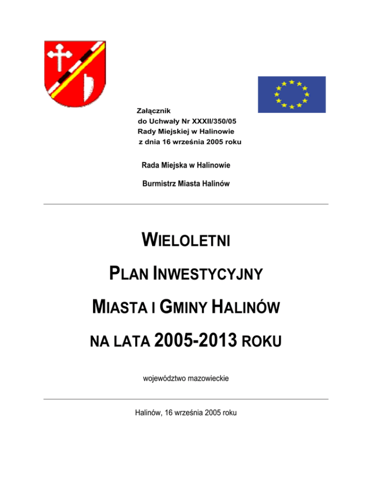 Załącznik do Uchwały Nr XXXII/350/05 Rady Miejskiej w Halinowie z dnia 16 września 2005 roku Rada Miejska w Halinowie Burmistrz Miasta Halinów WIELOLETNI PLAN INWESTYCYJNY MIASTA I GMINY HALINÓW NA LATA 2005-2013 ROKU województwo mazowieckie Halinów, 16 września 2005 roku 1 Radni Rady Miejskiej w Halinowie: WŁODZIMIERZ GRONCZEWSKI - PRZEWODNICZĄCY RADY MIEJSKIEJ TERESA KOWALCZYK – WICEPRZEWODNICZĄCA RADY MIEJSKIEJ, PRZEWODNICZĄCA KOMISJI ZAGOSPODAROWANIA PRZESTRZENNEGO, GOSPODARKI KOMUNALNEJ I INWESTYCJI ROBERT WASIAK – WICEPRZEWODNICZĄCY RADY MIEJSKIEJ, PRZEWODNICZĄCY KOMISJI BUDŻETOWEJ ADAM CISZKOWSKI – PRZEWODNICZĄCY KOMISJI ADAM LUDWINIAK – PRZEWODNICZĄCY KOMISJI OCHRONY ŚRODOWISKA, ROLNICTWA I LEŚNICTWA REGULAMINOWEJ HENRYK FORYŚ MIECZYSŁAW ODALSKI BOGDAN JANCZAREK JAN PAPIS TADEUSZ JANKOWSKI – PRZEWODNICZĄCY KOMISJI LIDIA SIMBIEROWICZ REWIZYJNEJ GRZEGORZ JERZAK MARCIN SUKIENNIK – PRZEWODNICZĄCY KOMISJI DS. MŁODZIEŻY, OŚWIATY, KULTURY, ZDROWIA, SPRAW SPOŁECZNYCH I BEZPIECZEŃSTWA JAN JEZIORSKI STANISŁAW WIECZOREK Burmistrz Miasta Halinów: JOLANTA DAMASIEWICZ Zastępca Burmistrza Miasta Halinów: MAREK CHIBOWSKI Sekretarz Miasta Halinów: JANUSZ KURCZAK Skarbnik Miasta Halinów: TERESA KARWOWSKA Sołectwa i Sołtysi: BRZEZINY – BOGDAN BOGUSZEWSKI KRÓLEWSKIE BRZEZINY – ELŻBIETA KALINOWSKA BUDZISKA – TOMASZ CZERWIŃSKI KRZEWINA – EDYTA SZMIT CISIE – RENATA SŁODOWNIK MICHAŁÓW – WIESŁAW SZULIM CHOBOT – WIESŁAW GADOMSKI MROWISKA – STANISŁAW DOBOSIEWICZ DESNO – BARBARA MARCZAK NOWY KONIK – ANDRZEJ DOBOSIEWICZ DŁUGA KOŚCIELNA – TERESA WIĘCASZEK OKUNIEW – MARIA WYGANOWSKA DŁUGA SZLACHECKA – LESZEK GELO STARY KONIK – MARIA BARTNICKA GRABINA – MIECZYSŁAW ŁABĘDŹ WIELGOLAS BRZEZIŃSKI – JAN SKOLIMOWSKI HIPOLITÓW – TADEUSZ PATOKA WIELGOLAS DUCHNOWSKI – WŁADYSŁAWA ZAWADKA JÓZEFIN – JÓZEF MOLAK ZAGÓRZE – ARKADIUSZ KULMIŃSKI KAZIMIERÓW – JÓZEFA POROSIŁO ŻWIRÓWKA – BARBARA MIROS Opracowanie dokumentu: Dr Jacek Sierak, Dr Marek Ziółkowski Katedra Ekonomiki i Finansów Samorządu Terytorialnego, Kolegium Zarządzania i Finansów, Szkoła Główna Handlowa, Warszawa WIELOLETNI PLAN INWESTYCYJNY MIASTA I GMINY HALINÓW NA LATA 2005-2013 2 Spis treści Wprowadzenie ................................................................................................................. 3 Część I Podstawowe informacje o Gminie Halinów ...................................................................... 6 Część II Istota i cele Wieloletniego Planu Inwestycyjnego Gminy Halinów ........................................ 11 Część III Założenia i zasady tworzenia Wieloletniego Planu Inwestycyjnego Gminy Halinów ............................................................................................................... 14 Część IV Prognoza budżetu Gminy Halinów do 2015 roku ............................................................ 16 Część V Zgłoszone zadania inwestycyjne .................................................................................... 35 Zakończenie ................................................................................................................... 42 Załącznik Nr 1 Lista zadań inwestycyjnych przewidzianych do realizacji w Gminie Halinów w latach 2005-2013 ....................................................................................... 43 WIELOLETNI PLAN INWESTYCYJNY MIASTA I GMINY HALINÓW NA LATA 2005-2013 3 WPROWADZENIE Skuteczne i efektywne rozwiązywanie problemów społeczno-gospodarczych, ekologicznych oraz przestrzennych GMINY HALINÓW w celu: zapewnienia coraz lepszych warunków zamieszkania, obsługi i wypoczynku jego mieszkańców, aktywnej ochrony walorów i zasobów ekologicznych oraz poprawy stanu środowiska przyrodniczego, a także dziedzictwa kulturowego, tworzenia warunków dla rozwoju przedsiębiorczości mieszkańców oraz rozwoju istniejących i lokalizacji nowych podmiotów gospodarczych, wzrostu rangi Gminy w otoczeniu, nie może być oparte na metodach prób i błędów, obliczone na szczęśliwy przypadek, bądź też odbywać się na podstawie nie ukierunkowanych na przyszłość decyzji bieżących. Ponadto ograniczoność środków finansowych znajdujących się w dyspozycji budżetu Gminy wymaga racjonalnych decyzji o sposobie i kierunkach ich wydatkowania. W tej sytuacji Władze GMINY HALINÓW konsekwentnie wprowadzają nowoczesne metody sterowania jego dalszym rozwojem w postaci ZARZĄDZANIA STRATEGICZNEGO. Podstawowymi jego walorami jest to, że: 1) redukuje ono w znacznym stopniu niepewność funkcjonowania i rozwoju Gminy, której źródłem jest otoczenie oraz zwiększa jego zdolność adaptacyjną do zmieniającej się rzeczywistości, 2) stanowi szansę zarówno dla Władz Gminy, jak i pracowników urzędu i miejskich jednostek organizacyjnych „oswojenia” się z działaniem w sytuacji niepewności oraz nieprzewidywalności szeregu zjawisk i procesów w otoczeniu (powiatowym, wojewódzkim, krajowym i europejskim) oraz traktowanie wynikającego z nich ryzyka jako stałego elementu „gry z otoczeniem” o przetrwanie i rozwój Gminy, 3) stwarza takie warunki, które z uwzględnieniem wymagań zmieniającego się otoczenia ułatwiają przełamywanie barier rozwojowych, a także eliminowanie (lub chociaż minimalizowanie) różnorodnych konfliktów wykrywanych w toku diagnozy obecnego poziomu rozwoju Gminy, WIELOLETNI PLAN INWESTYCYJNY MIASTA I GMINY HALINÓW NA LATA 2005-2013 4 4) umożliwia partnerską współpracę Władz Gminy z organizacjami pozarządowymi oraz przedsiębiorcami przy planowaniu i realizowaniu różnorodnych przedsięwzięć rozwojowych, 5) ułatwia profesjonalne przygotowanie wniosków inwestycyjnych przy ubieganiu się o kredyty bankowe (preferencyjne i komercyjne), 6) ułatwia profesjonalne przygotowanie wniosków inwestycyjnych o współfinansowanie zadań inwestycyjnych
