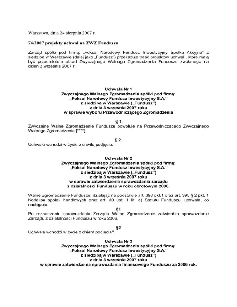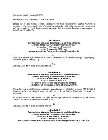 Warszawa, dnia 24 sierpnia 2007 r. 74/2007 projekty uchwał na ZWZ Funduszu Zarząd spółki pod firmą: „Foksal Narodowy Fundusz Inwestycyjny Spółka Akcyjna” z siedzibą w Warszawie (dalej jako „Fundusz”) przekazuje treść projektów uchwał , które mają być przedmiotem obrad Zwyczajnego Walnego Zgromadzenia Funduszu zwołanego na dzień 3 września 2007 r. Uchwała Nr 1 Zwyczajnego Walnego Zgromadzenia spółki pod firmą: „Foksal Narodowy Fundusz Inwestycyjny S.A.” z siedzibą w Warszawie („Fundusz”) z dnia 3 września 2007 roku w sprawie wyboru Przewodniczącego Zgromadzenia § 1. Zwyczajne Walne Zgromadzenie Funduszu powołuje na Przewodniczącego Zwyczajnego Walnego Zgromadzenia [****]. § 2. Uchwała wchodzi w życie z chwilą podjęcia. Uchwała Nr 2 Zwyczajnego Walnego Zgromadzenia spółki pod firmą: „Foksal Narodowy Fundusz Inwestycyjny S.A.” z siedzibą w Warszawie („Fundusz”) z dnia 3 września 2007 roku w sprawie zatwierdzenia sprawozdania zarządu z działalności Funduszu w roku obrotowym 2006. Walne Zgromadzenie Funduszu, działając na podstawie art. 393 pkt.1 oraz art. 395 § 2 pkt. 1 Kodeksu spółek handlowych oraz art. 30 ust. 1 lit. a) Statutu Funduszu, uchwala, co następuje: §1 Po rozpatrzeniu sprawozdania Zarządu Walne Zgromadzenie zatwierdza sprawozdanie Zarządu z działalności Funduszu w roku 2006. §2 Uchwała wchodzi w życie z dniem podjęcia”. Uchwała Nr 3 Zwyczajnego Walnego Zgromadzenia spółki pod firmą: „Foksal Narodowy Fundusz Inwestycyjny S.A.” z siedzibą w Warszawie („Fundusz”) z dnia 3 września 2007 roku w sprawie zatwierdzenia sprawozdania finansowego Funduszu za 2006 rok. Walne Zgromadzenie Funduszu, działając na podstawie art. 393 pkt.1 oraz art. 395 § 2 pkt. 1 Kodeksu spółek handlowych oraz art. 30 ust. 1 lit. a) Statutu Funduszu, uchwala, co następuje: §1 Po rozpatrzeniu sprawozdania finansowego, Walne Zgromadzenie zatwierdza sprawozdanie finansowe za rok obrotowy 2006, na które składa się: 1) wprowadzenie do sprawozdania finansowego za rok obrotowy od dnia 1 stycznia 2006 roku do dnia 31 grudnia 2006 roku, 2) bilans sporządzony na dzień 31 grudnia 2006 roku, który po stronie aktywów i pasywów wykazuje sumę 14.883 tys. zł (słownie: czternaście milionów osiemset osiemdziesiąt trzy tysiące złotych), 3) rachunek zysków i strat za rok obrotowy od dnia 1 stycznia 2006 roku do dnia 31 grudnia 2006 roku, wykazujący zysk netto w kwocie 4.855 tys. zł (słownie: cztery miliony osiemset pięćdziesiąt pięć tysięcy złotych), 4) zestawienie zmian w kapitale własnym za rok obrotowy od dnia 1 stycznia 2006 roku do dnia 31 grudnia 2006 roku, wykazujące zmniejszenie kapitału własnego o kwotę 62.645 tys. zł (słownie: sześćdziesiąt dwa miliony sześćset czterdzieści pięć tysięcy złotych), 5) rachunek przepływów pieniężnych za rok obrotowy od dnia 1 stycznia 2006 roku do dnia 31 grudnia 2006 roku, wykazujący zmniejszenie stanu środków pieniężnych o kwotę 52.838 tys. zł (słownie: pięćdziesiąt dwa miliony osiemset trzydzieści osiem tysięcy złotych), 6) zestawienie portfela inwestycyjnego na dzień 31 grudnia 2006 roku, 7) dodatkowe noty objaśniające. §2 Uchwała wchodzi w życie z dniem podjęcia”. Uchwała Nr 4 Zwyczajnego Walnego Zgromadzenia spółki pod firmą: „Foksal Narodowy Fundusz Inwestycyjny S.A.” z siedzibą w Warszawie („Fundusz”) z dnia 3 września 2007 roku w sprawie podziału zysku za rok 2006 Walne Zgromadzenie Funduszu, działając na podstawie art. 395 § 2 pkt. 2 Kodeksu spółek handlowych oraz art. 30 ust. 1 lit. b) Statutu Funduszu, uchwala, co następuje: §1 Walne Zgromadzenie Funduszu postanawia podzielić zysk netto Funduszu za 2006 rok w wysokości 4.854.813,72 złotych (słownie: cztery miliony osiemset pięćdziesiąt cztery tysiące osiemset trzynaście złotych siedemdziesiąt dwa grosze) i zrealizowanego zysku netto z lat ubiegłych w wysokości 6.298.630,71 złotych (słownie: sześć milionów dwieście dziewięćdziesiąt osiem tysięcy sześćset trzydzieści złotych siedemdziesiąt jeden groszy) w sposób następujący: a) zrealizowany zysk za 2006 rok w wysokości 3.638.526,27 złotych (słownie: trzy miliony sześćset trzydzieści osiem tysięcy pięćset dwadzieścia sześć złotych dwadzieścia siedem groszy) zostanie przeniesiony na kapitał zapasowy, b) zrealizowany zysk z lat ubiegłych w wysokości 6.298.630,71 złotych (słownie: sześć milionów dwieście dziewięćdziesiąt osiem tysięcy sześćset trzydzieści złotych siedemdziesiąt jeden groszy) zostanie przeniesiony na kapitał zapasowy, c) niezrealizowany zysk netto za rok 2006 w wysokości 1.216.287,46 złotych (słownie: jeden milion dwieście szesnaście tysięcy dwieście osiemdziesiąt siedem złotych czterdzieści sześć groszy) zostanie podzielony w następnych okresach sprawozdawczych. §2 Uchwała wchodzi w życie z dniem podjęcia”. Uchwała Nr 5 Zwyczajnego Walnego Zgromadzenia spółki pod firmą: „Foksal Narodowy Fundusz Inwestycyjny S.A.” z siedzibą w Warszawie („Fundusz”) z dnia 3 września 2007 roku w sprawie absolutorium dla Prezesa zarządu Walne Zgromadzenie Funduszu, działając na podstawie art. 393 § 1 pkt. 1) oraz art. 395 § 2 pkt. 3 Kodeksu spółek handlowych oraz art. 30 ust. 1 lit. c) Statutu Funduszu, uchwala, co następuje: §1 Walne Zgromadzenie Funduszu udziela Prezesowi Zarządu Funduszu Elżbiecie Chrzan absolutorium z wykonania przez nią obowiązków za okres od dnia 1 stycznia 2006 roku do dnia 31 grudnia 2006 roku. §2 Uchwała wchodzi w życie z dniem podjęcia”. Uchwała Nr 6 Zwyczajnego Walnego Zgromadzenia spółki pod firmą: „Foksal Narodowy Fundusz Inwestycyjny S.A.” z siedzibą w Warszawie („Fundusz”) z dnia 3 września 2007 roku w sprawie absolutorium dla Członka Zarządu Walne Zgromadzenie Funduszu, działając na podstawie art. 393 § 1 pkt. 1) oraz art. 395 