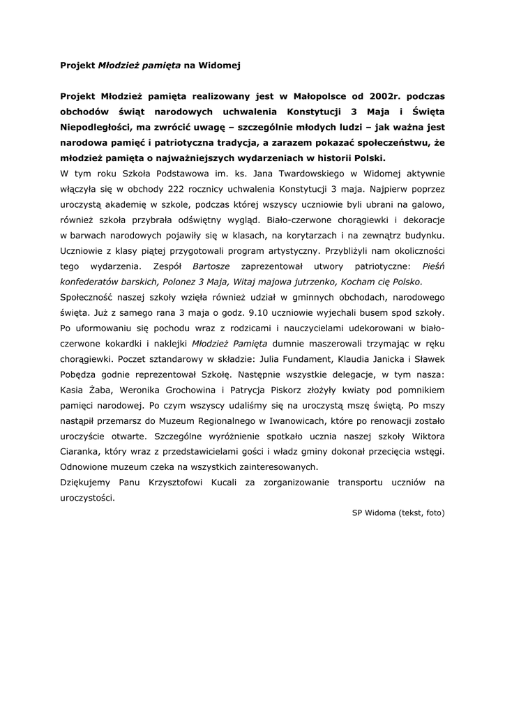 Projekt Młodzież pamięta na Widomej Projekt Młodzież pamięta realizowany jest w Małopolsce od 2002r. podczas obchodów świąt narodowych uchwalenia Konstytucji 3 Maja i Święta Niepodległości, ma zwrócić uwagę – szczególnie młodych ludzi – jak ważna jest narodowa pamięć i patriotyczna tradycja, a zarazem pokazać społeczeństwu, że młodzież pamięta o najważniejszych wydarzeniach w historii Polski. W tym roku Szkoła Podstawowa im. ks. Jana Twardowskiego w Widomej aktywnie włączyła się w obchody 222 rocznicy uchwalenia Konstytucji 3 maja. Najpierw poprzez uroczystą akademię w szkole, podczas której wszyscy uczniowie byli ubrani na galowo, również szkoła przybrała odświętny wygląd. Biało-czerwone chorągiewki i dekoracje w barwach narodowych pojawiły się w klasach, na korytarzach i na zewnątrz budynku. Uczniowie z klasy piątej przygotowali program artystyczny. Przybliżyli nam okoliczności tego wydarzenia. Zespół Bartosze zaprezentował utwory patriotyczne: Pieśń konfederatów barskich, Polonez 3 Maja, Witaj majowa jutrzenko, Kocham cię Polsko. Społeczność naszej szkoły wzięła również udział w gminnych obchodach, narodowego święta. Już z samego rana 3 maja o godz. 9.10 uczniowie wyjechali busem spod szkoły. Po uformowaniu się pochodu wraz z rodzicami i nauczycielami udekorowani w białoczerwone kokardki i naklejki Młodzież Pamięta dumnie maszerowali trzymając w ręku chorągiewki. Poczet sztandarowy w składzie: Julia Fundament, Klaudia Janicka i Sławek Pobędza godnie reprezentował Szkołę. Następnie wszystkie delegacje, w tym nasza: Kasia Żaba, Weronika Grochowina i Patrycja Piskorz złożyły kwiaty pod pomnikiem pamięci narodowej. Po czym wszyscy udaliśmy się na uroczystą mszę świętą. Po mszy nastąpił przemarsz do Muzeum Regionalnego w Iwanowicach, które po renowacji zostało uroczyście otwarte. Szczególne wyróżnienie spotkało ucznia naszej szkoły Wiktora Ciaranka, który wraz z przedstawicielami gości i władz gminy dokonał przecięcia wstęgi. Odnowione muzeum czeka na wszystkich zainteresowanych. Dziękujemy Panu Krzysztofowi Kucali za zorganizowanie transportu uczniów na uroczystości. SP Widoma (tekst, foto)