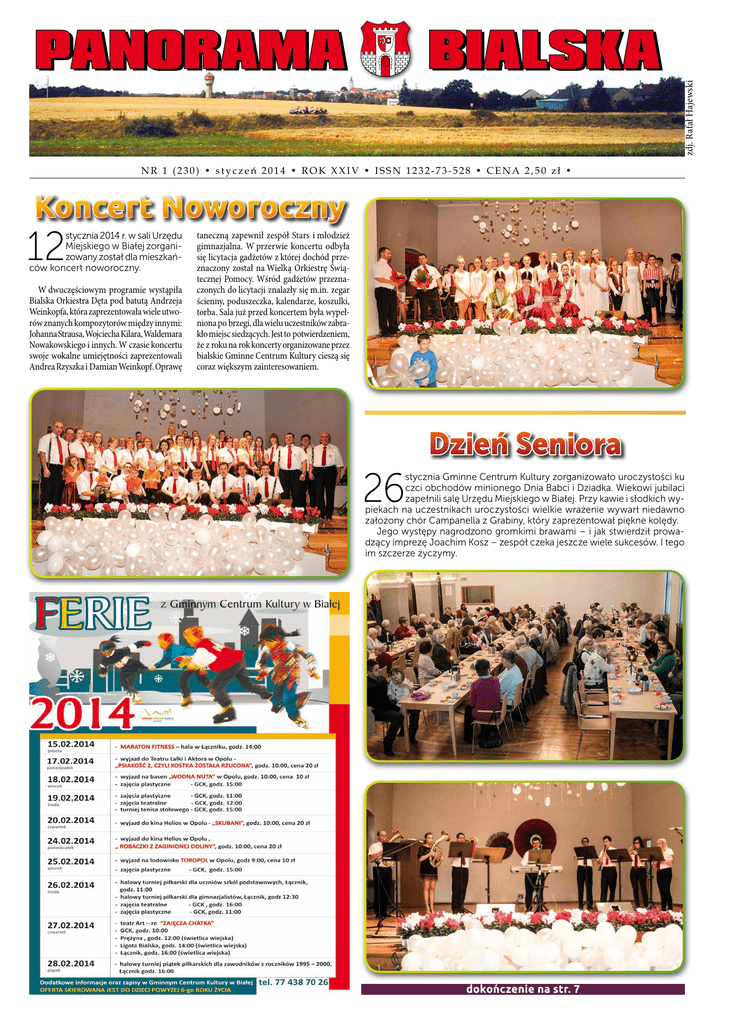 zdj. Rafał Hajewski NR 1 (230) • styczeń 2014 • ROK XXIV • ISSN 1232-73-528 • CENA 2,50 zł • Koncert Noworoczny 12 stycznia 2014 r. w sali Urzędu Miejskiego w Białej zorganizowany został dla mieszkańców koncert noworoczny. W dwuczęściowym programie wystąpiła Bialska Orkiestra Dęta pod batutą Andrzeja Weinkopfa, która zaprezentowała wiele utworów znanych kompozytorów między innymi: Johanna Strausa, Wojciecha Kilara, Waldemara Nowakowskiego i innych. W czasie koncertu swoje wokalne umiejętności zaprezentowali Andrea Rzyszka i Damian Weinkopf. Oprawę taneczną zapewnił zespół Stars i młodzież gimnazjalna. W przerwie koncertu odbyła się licytacja gadżetów z której dochód przeznaczony został na Wielką Orkiestrę Świątecznej Pomocy. Wśród gadżetów przeznaczonych do licytacji znalazły się m.in. zegar ścienny, poduszeczka, kalendarze, koszulki, torba. Sala już przed koncertem była wypełniona po brzegi, dla wielu uczestników zabrakło miejsc siedzących. Jest to potwierdzeniem, że z roku na rok koncerty organizowane przez bialskie Gminne Centrum Kultury cieszą się coraz większym zainteresowaniem. Dzień Seniora 26 stycznia Gminne Centrum Kultury zorganizowało uroczystości ku czci obchodów minionego Dnia Babci i Dziadka. Wiekowi jubilaci zapełnili salę Urzędu Miejskiego w Białej. Przy kawie i słodkich wypiekach na uczestnikach uroczystości wielkie wrażenie wywarł niedawno założony chór Campanella z Grabiny, który zaprezentował piękne kolędy. Jego występy nagrodzono gromkimi brawami – i jak stwierdził prowadzący imprezę Joachim Kosz – zespół czeka jeszcze wiele sukcesów. I tego im szczerze życzymy. dokończenie na str. 7 PANORAMA BIALSKA • STYCZEŃ • 2014 2 Sesja budżetowa BUDŻET GMINY 2014 30 grudnia 2013 r. w sali Gminnego Centrum Kultury w Białej odbyła się ostatnia w minionym roku sesja Rady Miejskiej. Podjęto kilka uchwał dotyczących zagadnień budżetowych. Dochody ogółem zaplanowane zostały w kwocie 29.796.960 zł., w tym: 1. Dochody bieżące – 29.350.382 zł. (98,5% w stosunku do dochodów ogółem) a) subwencje i dotacje – 16.898.671 zł. (57,6% w stosunku do dochodów bieżących), w tym: • subwencje – 14.819.515 zł. • dotacje z budżetu państwa – 2.074.331 zł. • środki europejskie – 4.825 zł. b) dochody własne – 12.451.711 zł. (42,4% w stosunku do dochodów bieżących), w tym: • podatki i opłaty lokalne – 9.943.921 zł. (79,9% w stosunku do dochodów własnych) 2) Dochody majątkowe – 446.578 zł. (1,5% dochodów ogółem) a) dotacje – 196.578 zł. b) sprzedaż mienia – 250.000 zł. Na początku obrad przedstawiciele bialskich władz wręczyli Gabrieli Neugebauer – radnej i jednocześnie sołtysowi Pogórza pamiątkowy dyplom za zajęcie III miejsca w konkursie „Przyjazna wieś” za realizację projektu pod nazwą „Stworzenie Centrum Kulturalnego w Pogórzu”. Przyznana nagroda w kwocie 5.500 zł zostanie przekazana władzom sołeckim na realizację kolejnych przedsięwzięć lokalnych. Podjęte zostały dwie uchwały dotyczące wieloletniej prognozy finansowej Gminy na lata 2014 – 2028, uwzględniające planowane dochody w kolejnych latach. Uchwalony został budżet gminy na 2014 r. Krótką informację o budżecie na ten rok zamieszczamy w oddzielnym materiale. Podjęta została uchwała o nie wygasaniu z końcem 2013 r. kwoty 611.836,65 zł. Na remont basenu kąpielowego w Białej, która to kwota zostanie rozliczona do 28 lutego 2014 r. Uchwalono również Gminny Program Profilaktyki i Rozwiązywania Problemów Alkoholowych oraz Przeciwdziałania Narkomanii na 2014 r. Przewiduje się wydatkowanie na przedsięwzięcia w tym zakresie 170.000 zł, a środki na ten cel zostaną pozyskane z opłat za wydawane zezwolenia na sprzedaż napojów alkoholowych. Najwięcej środków finansowych – 130.760 zł. Przeznaczonych zostanie na finansowanie działalności psychologa, szkolenia i kursy oraz diagnozy lokalnych zagrożeń społecznych. Korzystnym zjawiskiem jest zmniejszenie się w 2013 r. w porównaniu do 2012 r. liczby rodzin z problemem alkoholowym, interwencji domowych, ilości niebieskich kart oraz liczby wniosków o wszczę- cie postępowania wobec osób podejrzanych o nadużywanie alkoholu. Złożona została również informacja o realizacji uchwał w sprawie gospodarowania odpadami w gminie. W tej sprawie od 30 listopada 2012 r. do końca 2013 r. podjętych zostało sześć uchwał. W okresie od lipca do końca listopada 2013 r. zebrano i wywieziono z posesji z terenu gminy 568 ton odpadów, a z Punktu Selektywnej Zbiórki Odpadów Komunalnych – 61,56 ton odpadów. Ogółem zebrano 2.397 deklaracji na zbiórkę selektywną obejmującą 7.743 mieszkańców. W wyniku kontroli nieruchomości wszczęto tylko 16 postępowań. W większości przypadków okazało się, że ponad 500 obiektów nie jest zamieszkałych. Po podliczeniu kosztów funkcjonowania nowego systemu od lica do końca listopada 2013 r. koszty wyniosły 370.019 zł w tym związane z wydatkami na kontenery i remonty. Ściągalność opłat wyniosła w okresie pierwszych pięciu miesięcy jej obowiązywania 93,8%. Zlecono Komisji Rewizyjnej Rady Miejskiej rozpatrzenie dwóch skarg mieszkańców gminy na działalność miejscowego Ośrodka Pomocy Społecznej. Uchwalony został również plan pracy Rady na 2014 r. Przewodniczący Rady Miejskiej Robert Roden i burmistrz Arnold Hindera złożyli radnym i obecnym na sesji sołtysom życzenia noworoczne. Na zakończenie obrad Barbarze Stein – sołtysowi w Gostomi z okazji 50-tej rocznicy urodzin życzenia wraz z symbolicznymi wiązankami kwiatów złożyli Robert Roden i Arnold Hindera oraz przedstawiciele sołtysów. R. Nowak Wydatki ogółem zaplanowane zostały w kwocie 31.747.934 zł., w tym: Wydatki bieżące – 28.760.968 zł. (90,6% w stosunku do wydatków ogółem), w tym m.in. wydatki na: • utrzymanie dróg 