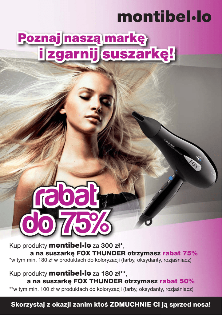 Poznaj naszą markę i zgarnij suszarkę! rabat do 75% Kup produkty za 300 zł*, a na suszarkę FOX THUNDER otrzymasz rabat 75% *w tym min. 180 zł w produktach do koloryzacji (farby, oksydanty, rozjaśniacz) Kup produkty za 180 zł**, a na suszarkę FOX THUNDER otrzymasz rabat 50% **w tym min. 100 zł w produktach do koloryzacji (farby, oksydanty, rozjaśniacz) Skorzystaj z okazji zanim ktoś ZDMUCHNIE Ci ją sprzed nosa! PROFESJONALNA SUSZARKA Z JONIZACJĄ 2100 W 49,75 zł 199 zł 99,50 zł • Trzy ustawienia temperatury powietrza i dwa ustawienia intensywności nadmuchu - zróżnicowana intensywność suszenia • Strumień silnie schłodzonego powietrza pozwalający na utrwalenie fryzury • Generator jonów ujemnych - blue ray - eliminacja elektrostatyczności podczas układania fryzury • Niezwykle cicha praca, dzięki wyjątkowo lekkiej konstrukcji • Nadmuch powietrza turbo • Wielokrotnie potwierdzone właściwości jonów ujemnych polegające na ochronie włosów przed uszkodzeniami, rozdwajaniem się końcówek i puszeniem się. • Smukła dysza koncentrująca strumień powietrza • Przewód zasilający z uchwytem do zawieszenia o długości 2,7 m Oferta dostępna od 28 maja do 29 czerwca 2012 r. lub do wyczerpania zapasów. Ceny zawierają należny podatek VAT. Więcej informacji u dystrybutorów marki montibel.lo, których lista znajduje się na www.montibello.pl. www.montibello.pl