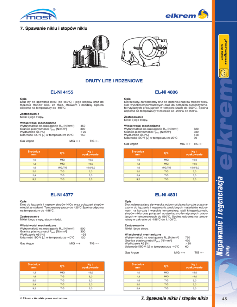 7. Spawanie niklu i stopów niklu DRUTY LITE I RDZENIOWE EL-Ni 4155 EL-Ni 4806 Opis Drut lity do spawania niklu (do 450°C) i jego stopów oraz do łączenia stopów niklu ze stalą, staliwem i miedzią. Spoina odporna na temperatury do -196°C. Opis Nierdzewny, żaroodporny drut do łączenia i napraw stopów niklu, stali wysokotemperaturowych oraz do połączeń austenitycznoferrytycznych pracujących w temperaturach do 550°C. Spoina odporna na temperatury w zakresie od -269°C do 900°C. Zastosowanie Nikiel i jego stopy. Zastosowanie Nikiel i jego stopy. MIG =+ 620 380 >35 90 TIG =– Gaz Argon MIG =+ TIG =– Średnica mm Typ Kg / opakowanie Średnica mm Typ Kg / opakowanie 1,0 MIG 15,0 1,0 MIG 15,0 1,2 MIG 15,0 1,2 MIG 15,0 1,6 MIG/TIG 15,0/5,0 1,6 MIG/TIG 15,0/5,0 2,0 TIG 5,0 2,0 TIG 5,0 2,4 TIG 5,0 2,4 TIG 5,0 3,2 TIG 5,0 3,2 TIG 5,0 EL-Ni 4377 EL-Ni 4831 Opis Drut do łączenia i napraw stopów NiCu oraz połączeń stopów miedzi ze stalami. Temperatury pracy do 425°C.Spoina odporna na temperatury do -196°C. Opis Drut odznaczający się wysoką odpornością na korozję przeznaczony do łączenia i napawania podobnych materiałów odpornych na korozję i wysokie temperatury, stali kriogenicznych, stopów niklu oraz połączeń austenityczno-ferrytycznych pracujących w temperaturach do 550°C. Spoina odporna na temperatury w zakresie od -196°C do 1.100°C. Zastosowanie Nikiel i jego stopy, stopy miedzi. Właściwości mechaniczne Wytrzymałość na rozciąganie Rm [N/mm²] Granica plastyczności Rp0,2 [N/mm²] Wydłużenie A5 [%] Udarność ISO-V [J] w temperaturze -40°C Gaz Argon Zastosowanie Nikiel i jego stopy. 500 300 >35 120 MIG =+ TIG =– Właściwości mechaniczne Wytrzymałość na rozciąganie Rm [N/mm²] Granica plastyczności Rp0,2 [N/mm²] Wydłużenie A5 [%] Udarność ISO-V [J] w temperaturze -40°C Gaz Argon 760 420 >30 60 MIG =+ TIG =– Średnica mm Typ Kg / opakowanie Średnica mm Typ Kg / opakowanie 1,2 MIG 15,0 1,0 MIG 15,0 1,6 TIG 5,0 1,2 MIG 15,0 2,0 TIG 5,0 1,6 TIG 5,0 2,4 TIG 5,0 2,0 TIG 5,0 3,2 TIG 5,0 2,4 TIG 5,0 © Elkrem – Wszelkie prawa zastrzeżone. 7. Spawanie niklu i stopów niklu Druty Gaz Argon Właściwości mechaniczne Wytrzymałość na rozciąganie Rm [N/mm²] Granica plastyczności Rp0,2 [N/mm²] Wydłużenie A5 [%] Udarność ISO-V [J] w temperaturze 20°C 450 300 >25 150 Napawanie i regeneracja Właściwości mechaniczne Wytrzymałość na rozciąganie Rm [N/mm²] Granica plastyczności Rp0,2 [N/mm²] Wydłużenie A5 [%] Udarność ISO-V [J] w temperaturze 20°C 45 DRUTY RDZENIOWE EL-Ni 4886 Opis Nierdzewny drut do łączenia i napraw stopów niklu, stali wysokotemperaturowych oraz do ich połączeń ze stalami niskostopowymi, wysokostopowymi i staliwem. Temperatury pracy do 400°C. Spoina odporna na temperatury do -196°C. Zastosowanie Nikiel i jego stopy, do łączenia i napraw stopów niklu, stali wysokotemperaturowych oraz do ich połączeń ze stalami niskostopowymi. Właściwości mechaniczne Wytrzymałość na rozciąganie Rm [N/mm2] Granica plastyczności Rp0,2 [N/mm2] Wydłużenie A5 [%] Twardość [HB] 46 Opis Napoiny Ni-, Si-, Cr-, B- na bazie niklu o charakterystyce odpowiadającej napoinom stellitowym, zwłaszcza pod kątem twardości, odporności na korozję, temperaturę, ścieranie i szoki termiczne. Zastosowanie Przemysł chemiczny, nuklearny, nikiel i jego stopy. Właściwości mechaniczne Twardość [HRC] Twardość [HRC] Twardość [HRC] Twardość [HRC] 33-36 41-43 45-48 55-60 Gaz I1, M13: 98-99% Argon na 1 - 2 % tlenu =+ MIG =+ TIG =– Średnica mm Typ Kg / opakowanie Średnica mm Napięcie V Prąd A Kg/opak. 1,2 MIG 15,0 1,6 20-26 160-260 15,0 1,6 TIG 5,0 2,0 22-27 220-280 15,0 2,0 TIG 5,0 2,4 24-28 260-340 15,0 2,4 TIG 5,0 2,8 25-29 300-400 15,0 3,2 TIG 5,0 Druty Napawanie i regeneracja Gaz Argon (TIG), Argon/HE (MIG) 780 500 >25 230 po napawaniu (400 po zgniocie) EL-Ni 21 / EL-Ni 6 EL-Ni 12 / EL-Ni 1 7. Spawanie niklu i stopów niklu © Elkrem – Wszelkie prawa zastrzeżone.