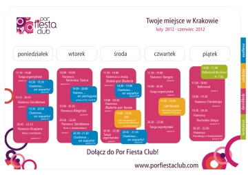 Twoje miejsce w Krakowie luty 2012 - czerwiec 2012 GODZINA 17.30 - 19.00 Tango argentyńskie poziom A+ 18.30 - 19.30 Charlemos ... en español 18.00 - 19.00 Flamenco Technika Tańca poziom A/A+ 19.15 - 20.45 Flamenco Sevillanas 19.30 - 20.30 Charlemos ... en español poziom A1+ 20.45 - 22.15 Flamenco Guajiara Taniec z wachlarzem poziom B+/C 19.00 - 20.30 Flamenco Alegrías 18.00 - 19.00 Charlemos ... en español 19.00 - 20.30 20.30 - 22.00 Flamenco Sevillanas Kurs z kastanietami 20.30 - 21.30 Charlemos ... en español poziom C1/C2 16.00 - 17.00 Bollywood dla dzieci 4 - 7 lat 17.00 - 18.00 Bollywood poziom A Tango argentyńskie poziom B 19.00 - 20.30 Flamenco 19.00 - 23.00 18.00 - 19.30 Flamenco Fandango Café Madrid Bulería por fiesta poziom B+ Poziom A poziom B poziom B1/B2 poziom C piątek 17.30 - 19.00 Flamenco Tangos Soleá por Bulería poziom B+/C poziomy A1/A2 oraz B1/B2 czwartek 17.30 - 19.00 Flamenco z chustą 19.00 - 20.00 Falemos ... en portugues poziom A2 poziom A środa konwersacje językowe Español & Portugues 19.00 - 22.00 DKF kina iberyjskiego & latynoamerykańskiego co dwa tygodnie 20.30 - 22.00 Tango argentyńskie 20.30 - 22.00 20.45 - 21.45 Tango argentyńskie Charlemos ... en español poziom A poziom B+ poziom A+ 19.30 - 20.30 Flamenco Technika Stepu poziom B+/C 20.30 - 22.00 Flamenco Fandango z kastanietami poziom A1 Dołącz do Por Fiesta Club! www.porfiestaclub.com poziom A +/B family&kids wtorek poniedziałek