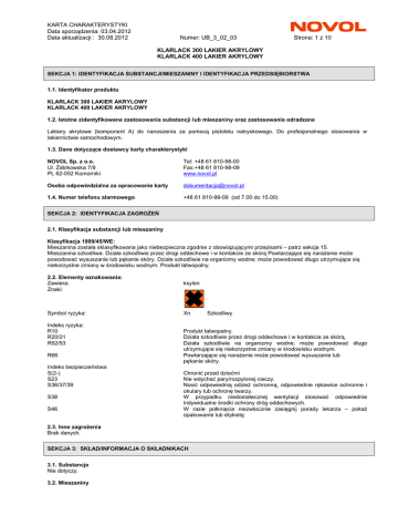 KARTA CHARAKTERYSTYKI Data sporządzenia: 03.04.2012 Data aktualizacji : 30.08.2012 Numer: UB_3_02_03 Strona: 1 z 10 KLARLACK 300 LAKIER AKRYLOWY KLARLACK 400 LAKIER AKRYLOWY SEKCJA 1: IDENTYFIKACJA SUBSTANCJI/MIESZANINY I IDENTYFIKACJA PRZEDSIĘBIORSTWA 1.1. Identyfikator produktu KLARLACK 300 LAKIER AKRYLOWY KLARLACK 400 LAKIER AKRYLOWY 1.2. Istotne zidentyfikowane zastosowania substancji lub mieszaniny oraz zastosowania odradzane Lakiery akrylowe (komponent A) do nanoszenia za pomocą pistoletu natryskowego. Do profesjonalnego stosowania w lakiernictwie samochodowym. 1.3. Dane dotyczące dostawcy karty charakterystyki NOVOL Sp. z o.o. Ul. śabikowska 7/9 PL 62-052 Komorniki Tel: +48 61 810-98-00 Fax:+48 61 810-98-09 www.novol.pl Osoba odpowiedzialna za opracowanie karty [email protected] 1.4. Numer telefonu alarmowego +48 61 810-99-09 (od 7.00 do 15.00) SEKCJA 2: IDENTYFIKACJA ZAGROśEŃ 2.1. Klasyfikacja substancji lub mieszaniny Klasyfikacja 1999/45/WE: Mieszanina została sklasyfikowana jako niebezpieczna zgodnie z obowiązującymi przepisami – patrz sekcja 15. Mieszanina szkodliwa. Działa szkodliwie przez drogi oddechowe i w kontakcie ze skórą Powtarzające się naraŜenie moŜe powodować wysuszanie lub pękanie skóry. Działa szkodliwie na organizmy wodne; moŜe powodować długo utrzymujące się niekorzystne zmiany w środowisku wodnym. Produkt łatwopalny. 2.2. Elementy oznakowania: Zawiera: Znaki: ksylen Symbol ryzyka: Xn Indeks ryzyka: R10 R20/21 R52/53 R66 Indeks bezpieczeństwa: S(2-) S23 S36/37/39 S38 S46 Produkt łatwopalny. Działa szkodliwie przez drogi oddechowe i w kontakcie ze skórą. Działa szkodliwie na organizmy wodne; moŜe powodować długo utrzymujące się niekorzystne zmiany w środowisku wodnym. Powtarzające się naraŜenie moŜe powodować wysuszanie lub pękanie skóry. Chronić przed dziećmi Nie wdychać pary/rozpylonej cieczy. Nosić odpowiednią odzieŜ ochronną, odpowiednie rękawice ochronne i okulary lub ochronę twarzy. W przypadku niedostatecznej wentylacji stosować odpowiednie indywidualne środki ochrony dróg oddechowych. W razie połknięcia niezwłocznie zasięgnij porady lekarza – pokaŜ opakowanie lub etykietę. 2.3. Inne zagroŜenia Brak danych. SEKCJA 3: SKŁAD/INFORMACJA O SKŁADNIKACH 3.1. Substancje Nie dotyczy. 3.2. Mieszaniny Szkodliwy KARTA CHARAKTERYSTYKI Data sporządzenia: 03.04.2012 Data aktualizacji : 30.08.2012 Numer: UB_3_02_03 Strona: 2 z 10 KLARLACK 300 LAKIER AKRYLOWY KLARLACK 400 LAKIER AKRYLOWY SEKCJA 3: SKŁAD/INFORMACJA O SKŁADNIKACH c.d. Identyfikator produktu KLARLACK 300 LAKIER AKRYLOWY KLARLACK 400 LAKIER AKRYLOWY Nazwa substancji Numery identyfikacyjne Klasyfikacja i oznakowanie StęŜenie [% wag.] Ksylen WE: 215-535-7 CAS: 1330-20-7 Nr Indeksu: 601-022-00-9 Nr rejestracji: -- Klasyfikacja 67/548/EWG: R10, Xn; R20/21 Xi; R38 Oznakowanie: 15-19 Klasyfikacja 1272/2008/WE: Flam. Liq. 3; H226; Acute Tox. 4; H332 Acute Tox. 4; H312 Skin Irrit.2; H315 Oznakowanie: GHS02, GHS07; Wng; H226, H332, H312, H315 Octan butylu WE: 204-658-1 CAS: 123-86-4 Nr Indeksu: 607-025-00-1 Nr rejestracji: -- Klasyfikacja 67/548/EWG: R10, R66-67 Klasyfikacja 1272/2008/WE: Flam. Liq. 3; H226; STOT SE 3; H336 Oznakowanie: GHS02 GHS07; Wng; H226, H336, EUH066 15-20 Octan 1-metoksy –2propylu WE: 203-603-9 CAS: 108-65-6 Nr Indeksu: 607-195-00-7 Nr rejestracji: -- Klasyfikacja 67/548/EWG: R10 Klasyfikacja 1272/2008/WE: Flam. Liq. 3; H226; Oznakowanie: GHS02 Wng; H226 5-10 Solwent nafta naftowa), zawierająca węglowodory aromatyczne WE: 265-199-0 CAS: 64742-95-6 Nr Indeksu: 649-356-00-4 Nr rejestracji: -- Klasyfikacja 67/548/EWG: z uwzględnieniem Noty H i Noty P zawartość wagowa benzenu (EINECS nr 200-753-7) mniej niŜ <0,1%: R10 Xn; R65 Xi; R37 N; R51/53 R66-67 5-<10 (ropa lekka Klasyfikacja 1272/2008/WE: Carc. 1B; H350 Muta. 1B; H340 Asp. Tox. 1; H304 Oznakowanie: GHS08; Dgr; H350, H340, H304 Etylobenzen WE: 202-849-4 CAS: 100-41-4 Nr Indeksu: 601-023-00-4 Nr rejestracji: -- Klasyfikacja 67/548/EWG: F; R11 Xn; R20 Klasyfikacja 1272/2008/WE: Flam. Liq. 2; H225 Acute Tox. 4; H332 Oznakowanie: GHS02, GHS07; Dgr; H225, H332 2-3 KARTA CHARAKTERYSTYKI Data sporządzenia: 03.04.2012 Data aktualizacji : 30.08.2012 Numer: UB_3_02_03 Strona: 3 z 10 KLARLACK 300 LAKIER AKRYLOWY KLARLACK 400 LAKIER AKRYLOWY SEKCJA 3: SKŁAD/INFORMACJA O SKŁADNIKACH c.d. Nazwa substancji Numery identyfikacyjne Klasyfikacja i oznakowanie StęŜenie [% wag.] bis(2,2,6,6-tetramethyl4-piperidyl) sebacate WE: 258-207-9 CAS: 52829-07-9 Nr Indeksu: Nr rejestracji: -- Klasyfikacja 67/548/EWG Xi, R36, N, R50/53 0-0,5 Klasyfikacja 1272/2008/WE: Eye Irrit. 2 H319, Aquatic Chronic 2 H411 Pełne znaczenie zwrotów wskazujących rodzaj zagroŜenia i zwrotów R zamieszczono w sekcji 16. SEKCJA 4: ŚRODKI PIERWSZEJ POMOCY 4.1. Opis środków pierwszej pomocy: Ogólne wskazówki: Patrz sekcja 11 Karty Charakterystyki. Drogi oddechowe: Wyprowadzić poszkodowanego na świeŜe powietrze, zapewnić spokój, w razie braku oddechu zastosować sztuczne oddychanie. Wezwać lekarza. Skóra: Zdjąć zabrudzoną odzieŜ. SkaŜoną skórę zmyć duŜą ilością letniej wody przez około 15 min. gdy podraŜnienie nie ustępuje skonsultować się z lekarzem. Oczy: Natychmiast przemyć duŜą ilością wody przez minimum około 15 min, unikać silnego strumienia-niebezpieczeństwo uszkodzenia rogówki, skonsultować się z lekarzem. Układ pokarmowy: Nie powodować wymiotów (niebezpieczeństwo zachłyśnięcia). Przemyć usta wodą. Przytomnej osobie podać 1-2 szklanki ciepłej wody. Wezwać lekarza. Osoby udzielające pierwszej pomocy powinny posiadać rękawiczki medyczne. 4.2. NajwaŜniejsze ostre i opóźnione objawy oraz skutki naraŜenia Pary mogą wywoływać uczucie senności i zawroty głowy. Powtarzające się naraŜenie moŜe powodować wysuszanie lub pękanie skóry. 4.3. Wskazania dotyczące wszelkiej natychmiastowej pomocy lekarskiej i szczególnego postępowania z p