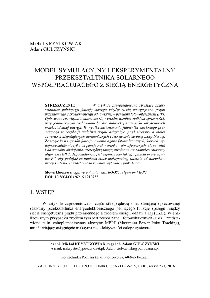 Michał KRYSTKOWIAK Adam GULCZYŃSKI MODEL SYMULACYJNY I EKSPERYMENTALNY PRZEKSZTAŁTNIKA SOLARNEGO WSPÓŁPRACUJĄCEGO Z SIECIĄ ENERGETYCZNĄ STRESZCZENIE W artykule zaprezentowano strukturę przekształtnika pełniącego funkcję sprzęgu między siecią energetyczną prądu przemiennego a źródłem energii odnawialnej – panelami fotowoltaicznymi (PV). Opisywane rozwiązanie odznacza się wysokim współczynnikiem sprawności, przy jednoczesnym zachowaniu bardzo dobrych parametrów jakościowych przekształcanej energii. W wyniku zastosowania falownika sieciowego pracującego w regulacji nadążnej prądu osiągnięto prąd sieciowy o małej zawartości niepożądanych harmonicznych i teoretycznie zerowej mocy biernej. Ze względu na sposób funkcjonowania ogniw fotowoltaicznych, których wydajność zależy nie tylko od panujących warunków atmosferycznych, ale również i od sposobu obciążenia, szczególną uwagę zwrócono na zaimplementowany algorytm MPPT. Jego zadaniem jest zapewnienie takiego punktu pracy ogniwa PV, aby podążać za punktem mocy maksymalnej zależnie od warunków pracy systemu. Przedstawiono również wybrane wyniki badań. Słowa kluczowe: ogniwa PV, falownik, BOOST, algorytm MPPT DOI: 10.5604/00326216.1210755 1. WSTĘP W artykule zaprezentowano część silnoprądową oraz sterującą opracowanej struktury przekształtnika energoelektronicznego pełniącego funkcję sprzęgu między siecią energetyczną prądu przemiennego a źródłem energii odnawialnej (OZE). W analizowanym przypadku źródłem tym jest zespół paneli fotowoltaicznych (PV). Przedstawiono m.in. zaimplementowany algorytm MPPT (Maximum Power Point Tracking), umożliwiający osiągnięcie maksymalnej efektywności całego systemu. dr inż. Michał KRYSTKOWIAK, mgr inż. Adam GULCZYŃSKI e-mail: [email protected], [email protected] Politechnika Poznańska, ul Piotrowo 3a, 60-965 Poznań PRACE INSTYTUTU ELEKTROTECHNIKI, ISSN-0032-6216, LXIII, zeszyt 273, 2016 96 M. Krystkowiak, A. Gulczyński Ponadto, w celu zapewnienia wysokiej jakości parametrów energii oddawanej do sieci, zastosowano falownik tranzystorowy o sinusoidalnym prądzie wyjściowym, który umożliwia jednocześnie stabilizację napięcia na szynie stałoprądowej DC systemu. W artykule zaprezentowano także zbudowany na bazie przeprowadzonych wcześniej badań symulacyjnych model eksperymentalny opisywanego przekształtnika z uwzględnieniem sposobu emulacji pracy ogniwa fotowoltaicznego, która umożliwiła wstępną ocenę poprawności funkcjonowania zaimplementowanego algorytmu MPPT. 2. SCHEMAT BLOKOWY I OGÓLNA IDEA DZIAŁANIA SYSEMU PRZETWARZANIA ENERGII SOLARNEJ Schemat blokowy opracowanego systemu umożliwiającego przekazywanie (i przekształcanie) energii z zespołu paneli fotowoltaicznych do sieci energetycznej prądu przemiennego zaprezentowano na rysunku 1. Rys. 1. Schemat blokowy systemu przekształcania i przesyłu energii solarnej Możemy wyróżnić w tym przypadku następujące bloki, a mianowicie: zespół paneli fotowoltaicznych PV, sieć energetyczną prądu przemiennego, bloki przekształtnika energoelektronicznego pełniącego funkcję sprzęgu DC/AC, w skład którego wchodzą: - przekształtnik DC/DC typu BOOST, - obwód pośredniczący DC/DC, - blok przekształtnika sieciowego DC/AC (falownik sieciowy). W rozważanym przypadku założono wykorzystanie zespołu paneli fotowoltaicznych o zakresie zmienności napięcia wyjściowego (zależnego m.in. od temperatury, stopnia obciążenia oraz natężenia padającego światła słonecznego) od 150 do 450 V. Przykładową rodzinę charakterystyk prądowo-napięciowych zespołu ogniw fotowoltaicznych PV przedstawiono na rysunku 2 [1]. Jak z nich wynika, moc uzyskiwana z baterii słonecznej jest zależna w dużym stopniu od sposobu obciążenia. W konsekwencji istnieje taka wartość napięcia i prądu, dla których moc uzyskiwana ze źródła energii odnawialnej jest maksymalna (tzw. punkt mocy maksymalnej – rys. 2). Z tego też powodu, w celu zapewnienia optymalnych warunków pracy całego systemu, w układzie sterowania przekształtnikiem DC/DC należało zaimplementować algorytm MPPT. Jego zadaniem jest zapewnienie takiego punktu pracy ogniwa, aby podążać za punktem mocy maksymalnej zależnie od aktualnych warunków pracy systemu (m.in. temperatury otoczenia, natężenia padającego światła słonecznego). Opracowany i zaimplementowany algorytm MPPT [2, 3] przedstawiono w dalszej części artykułu. Model symulacyjny i eksperymentalny przekształtnika solarnego… 97 Rys. 2. Rodzina charakterystyk prądowo-napięciowych zespołu ogni fotowoltaicznych [1] 3. OBWÓD STAŁOPRĄDOWY DC/DC SYSTEMU SOLARNEGO 3.1. Część silnoprądowa Ze względu na przyjęty zakres napięć wyjściowych ogniw fotowoltaicznych PV (150 V – 450 V) oraz wymaganą minimalną wartość napięcia na szynie DC, która powinna być w rozważanym przypadku większa od amplitudy napięcia sieciowego, część silnoprądowa przekształtnika DC/DC bazuje na układzie impulsowym typu BOOST (rys. 3). Rys. 3. Schemat ideowy przekształtnika DC/DC typu BOOST 98 M. Krystkowiak, A. Gulczyński Zadaniem tego przekształtnika jest podwyższanie wartości napięcia wyjściowego zespołu paneli fotowoltaicznych i dostarczanie (doładowywanie) zespołu kondensatorów wchodzących w skład obwodu pośredniczący DC/DC. Na rysunku 3 pominięto zaimplementowaną w układzie docelowym tzw. diodę bypass. Umożliwia ona przekazywanie energii z ogniw PV do kondensatorów wejściowych falownika sieciowego z pominięciem układu typu BOOST. Sytuacja ta jest jednak możliwa tylko wtedy, kiedy wartość chwilowa napięcia wyjściowego ogniw PV jest wyższa od wymaganej wartości napięcia na kondensatorach wejściowych przekształtnika sieciowego (falownika o sinusoidalnym prądzie sieci). 3.2. Algorytm sterowania przekształtnikiem BOOST systemu solarnego – algorytm MPPT Zadaniem przekształtni