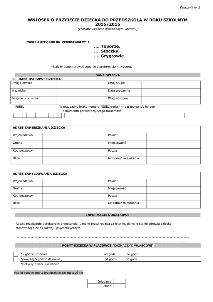 Załącznik nr 2 WNIOSEK O PRZYJĘCIE DZIECKA DO PRZEDSZKOLA W ROKU SZKOLNYM 2015/2016 (Prosimy wypełnić drukowanymi literami) Proszę o przyjęcie do Przedszkola w* : .... Toporze, .... Stoczku, …. Grygrowie *Należy ponumerować zgodnie z preferencjami wyboru. DANE DZIECKA I. DANE OSOBOWE DZIECKA Imię pierwsze Imię drugie Nazwisko Data urodzenia Miejsce urodzenia Województwo PSEEL W przypadku braku numeru PESEL-seria i nr paszportu lub innego dokumentu potwierdzającego tożsamość ADRES ZAMIESZKANIA DZIECKA Województwo Powiat Gmina Miejscowość Kod pocztowy Poczta Ulica Nr domu/ mieszkania ADRES ZAMELDOWANIA DZIECKA Województwo Powiat Gmina Miejscowość Kod pocztowy Poczta Ulica Nr domu/ mieszkania INFORMACJE DODATKOWE Rodzic przekazuje dyrektorowi przedszkola, uznane przez rodzica za istotne, dane: o stanie zdrowia dziecka, stosowanej diecie i rozwoju psychofizycznym: …………………………………………………………………………………………………………………………………………………………………………………………………… ……………………………………………………………………………………………………………………………………………………………………………………….…………. POBYT DZIECKA W PLACÓWCE (ZAZNACZYĆ WŁAŚCIWE) *5 godzin dziennie : od godz. ……… do godz. ……… *powyżej 5 godzin dziennie ; od godz. …….. do godz. ……. *Dotyczy dzieci 3-4 letnich Posiłki spożywane w przedszkolu (zaznaczyć x): śniadanie obiad DANE RODZICÓW II. DANE OSOBOWE RODZICÓW DANE OSOBOWE MATKI/ OPIEKUNKI PRAWNEJ Imiona Nazwisko ADRES ZAMIESZKANIA MATKI/ OPIEKUNKI PRAWNEJ Gmina Miejscowość Kod pocztowy Poczta Ulica Nr domu/mieszkania DANE KONTAKTOWE MATKI/ OPIEKUNKI PRAWNEJ Telefon Adres e-mail DANE OSOBOWE OJCA/ OPIEKUNA PRAWNEGO Imiona Nazwisko ADRES ZAMIESZKANIA OJCA/ OPIEKUNA PRAWNEGO Gmina Miejscowość Kod pocztowy Poczta Ulica Nr domu/mieszkania DANE KONTAKTOWE OJCA/ OPIEKUNA PRAWNEGO Telefon Adres e-mail III. DEKLARACJA UDZIAŁU W ZAJĘCIACH RELIGII Deklaruję, że moje dziecko będzie uczestniczyć w zajęciach religii TAK NIE OŚWIADCZENIE INFORMACJE DOTYCZĄCE DANYCH OSOBOWYCH DZIECKA I JEGO RODZINY: Oświadczam, że dane przedłożone w niniejszej deklaracji są zgodne ze stanem faktycznym i jestem odpowiedzialności karnej za złożenie fałszywych informacji. Niniejszym przyjmuję do wiadomości i wyrażam zgodę na przetwarzanie danych osobowych zawartych w dokumencie w celach statystycznych i sprawach związanych z opieką przedszkolną nad dzieckiem oraz do zobowiązań finansowych wobec przedszkola. Przetwarzanie danych odbywać się będzie zgodnie z ustawą sierpnia 1997 r. o ochronie danych osobowych (Dz. U. z 2002 r., Nr 101, poz. 926 z późn. zm.) Zostałem pouczony o prawie wglądu do moich/naszych danych oraz zmiany tych danych. Podpis rodzica świadomy niniejszym rozliczania z dnia 29 Do wniosku dołączam (właściwe zaznaczyć x): -Oświadczenie dot. wielodzietność rodziny kandydata. - Dokumenty potwierdzające niepełnosprawność kandydata. -Dokumenty potwierdzające niepełnosprawność jednego z rodziców kandydata lub obojga rodziców kandydata. -Dokumenty potwierdzające niepełnosprawność rodzeństwa kandydata. - Oświadczenie o samotnym wychowywaniu kandydata w rodzinie. -Dokumenty potwierdzające objęcie kandydata pieczą zastępczą. -Oświadczenie obojga rodziców kandydata, że pracują, wykonują pracę na podstawie umowy cywilnoprawnej, prowadzą gospodarstwo rolne lub pozarolniczą działalność gospodarczą. - Oświadczenie rodzica, że rodzeństwo kandydata, jest już wychowankiem przedszkola lub uczęszcza do szkoły podstawowej. -Oświadczenie o zgłoszeniu dziecka na pobyt całodzienny -Zaświadczenie o nadzorze kuratorskim lub objęciu opieką asystenta rodziny -Inne *Niepotrzebne skreślić Łączna ilość punktów uzyskanych w postępowaniu rekrutacyjnym