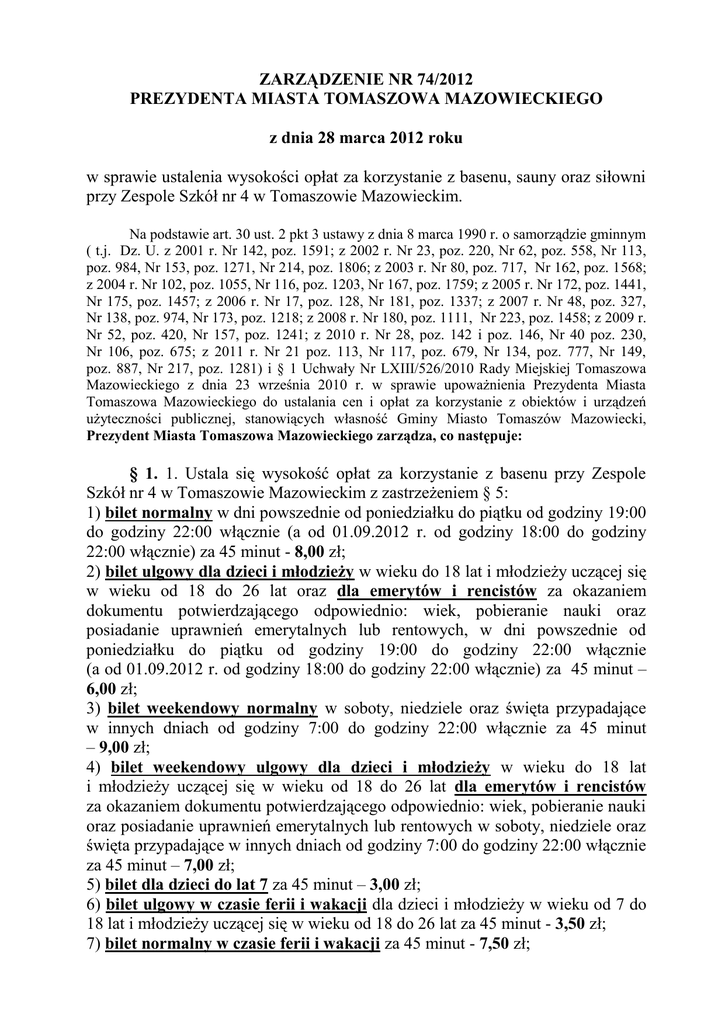 ZARZĄDZENIE NR 74/2012 PREZYDENTA MIASTA TOMASZOWA MAZOWIECKIEGO z dnia 28 marca 2012 roku w sprawie ustalenia wysokości opłat za korzystanie z basenu, sauny oraz siłowni przy Zespole Szkół nr 4 w Tomaszowie Mazowieckim. Na podstawie art. 30 ust. 2 pkt 3 ustawy z dnia 8 marca 1990 r. o samorządzie gminnym ( t.j. Dz. U. z 2001 r. Nr 142, poz. 1591; z 2002 r. Nr 23, poz. 220, Nr 62, poz. 558, Nr 113, poz. 984, Nr 153, poz. 1271, Nr 214, poz. 1806; z 2003 r. Nr 80, poz. 717, Nr 162, poz. 1568; z 2004 r. Nr 102, poz. 1055, Nr 116, poz. 1203, Nr 167, poz. 1759; z 2005 r. Nr 172, poz. 1441, Nr 175, poz. 1457; z 2006 r. Nr 17, poz. 128, Nr 181, poz. 1337; z 2007 r. Nr 48, poz. 327, Nr 138, poz. 974, Nr 173, poz. 1218; z 2008 r. Nr 180, poz. 1111, Nr 223, poz. 1458; z 2009 r. Nr 52, poz. 420, Nr 157, poz. 1241; z 2010 r. Nr 28, poz. 142 i poz. 146, Nr 40 poz. 230, Nr 106, poz. 675; z 2011 r. Nr 21 poz. 113, Nr 117, poz. 679, Nr 134, poz. 777, Nr 149, poz. 887, Nr 217, poz. 1281) i § 1 Uchwały Nr LXIII/526/2010 Rady Miejskiej Tomaszowa Mazowieckiego z dnia 23 września 2010 r. w sprawie upoważnienia Prezydenta Miasta Tomaszowa Mazowieckiego do ustalania cen i opłat za korzystanie z obiektów i urządzeń użyteczności publicznej, stanowiących własność Gminy Miasto Tomaszów Mazowiecki, Prezydent Miasta Tomaszowa Mazowieckiego zarządza, co następuje: § 1. 1. Ustala się wysokość opłat za korzystanie z basenu przy Zespole Szkół nr 4 w Tomaszowie Mazowieckim z zastrzeżeniem § 5: 1) bilet normalny w dni powszednie od poniedziałku do piątku od godziny 19:00 do godziny 22:00 włącznie (a od 01.09.2012 r. od godziny 18:00 do godziny 22:00 włącznie) za 45 minut - 8,00 zł; 2) bilet ulgowy dla dzieci i młodzieży w wieku do 18 lat i młodzieży uczącej się w wieku od 18 do 26 lat oraz dla emerytów i rencistów za okazaniem dokumentu potwierdzającego odpowiednio: wiek, pobieranie nauki oraz posiadanie uprawnień emerytalnych lub rentowych, w dni powszednie od poniedziałku do piątku od godziny 19:00 do godziny 22:00 włącznie (a od 01.09.2012 r. od godziny 18:00 do godziny 22:00 włącznie) za 45 minut – 6,00 zł; 3) bilet weekendowy normalny w soboty, niedziele oraz święta przypadające w innych dniach od godziny 7:00 do godziny 22:00 włącznie za 45 minut – 9,00 zł; 4) bilet weekendowy ulgowy dla dzieci i młodzieży w wieku do 18 lat i młodzieży uczącej się w wieku od 18 do 26 lat dla emerytów i rencistów za okazaniem dokumentu potwierdzającego odpowiednio: wiek, pobieranie nauki oraz posiadanie uprawnień emerytalnych lub rentowych w soboty, niedziele oraz święta przypadające w innych dniach od godziny 7:00 do godziny 22:00 włącznie za 45 minut – 7,00 zł; 5) bilet dla dzieci do lat 7 za 45 minut – 3,00 zł; 6) bilet ulgowy w czasie ferii i wakacji dla dzieci i młodzieży w wieku od 7 do 18 lat i młodzieży uczącej się w wieku od 18 do 26 lat za 45 minut - 3,50 zł; 7) bilet normalny w czasie ferii i wakacji za 45 minut - 7,50 zł; 8) wynajęcie jednego toru za 45 minut – 46,00 zł; 9)wynajęcie basenu sportowego w dni wolne od pracy lub ustalone z zarządzającym za 45 minut – 277,00 zł; 10) wynajęcie basenu rekreacyjnego za 45 minut – 133,00 zł; 11) wynajęcie całego basenu-sportowego i rekreacyjnego za 45 minut 410,00 zł. 2. Dziecko do lat 7 korzysta z basenu wraz z osobą dorosłą. 3. Opłata za wynajęcie instruktora pływania zatrudnionego na basenie: 1) w czasie jego godzin pracy - 35,00 zł/h; 2) poza jego godzinami pracy - 45,00 zł/h. § 2. Ceny karnetów indywidualnych 30 dniowych uprawniających do korzystania z basenu przez dziesięć godzin przypadających w dowolne dni wynoszą: 1) karnet normalny – 72,00 zł; 2) karnet ulgowy dla dzieci i młodzieży w wieku do 18 lat i młodzieży uczącej się w wieku od 18 do 26 lat oraz dla emerytów i rencistów za okazaniem dokumentu potwierdzającego odpowiednio: wiek, pobieranie nauki oraz posiadanie uprawnień emerytalnych lub rentowych – 54,00 zł. § 3. 1. Cena biletu za wejście na siłownię w dni powszednie od poniedziałku do piątku włącznie za 60 minut – 9,00 zł. 2. Bilet 30 dniowy za wejście na siłownię w dni powszednie od poniedziałku do piątku włącznie – 100,00 zł. 3. Karnet ( 12-wejściowy ) 30 dniowy na siłownię w dni powszednie od poniedziałku do piątku włącznie – 75,00 zł. § 4. 1. Cena biletu indywidualnego za korzystanie z sauny na basenie przez 1 minutę wynosi 0,34 zł. 2. Cena karnetu indywidualnego 30 dniowego uprawniającego do korzystania z sauny przez 1 godzinę – 18,00 zł. 3. Cena karnetu indywidualnego 30 dniowego uprawniającego do korzystania z sauny przez 10 godzin – 175,00 zł. 4. Cena za udostępnienie całej sauny na 1 godzinę wynosi 175,00 zł. 5. Karnet 30-dniowy „3 w 1” (basen, sauna, siłownia) – 12 wejść (12 godzin) – 80,00 zł. § 5. 1. W dniach od poniedziałku do piątku w godzinach od 7:00 do 19:00, a od 01.09.2012 r. w godzinach od 7:00 do 18:00 zezwala się na nieodpłatne korzystanie z basenu przy Zespole Szkół nr 4, przez: 1) uczniów przedszkoli i szkół, dla których organem prowadzącym jest Gmina Miasto Tomaszów Mazowiecki; 2) osoby niepełnosprawne posiadające orzeczenie o niepełnosprawności; 3) Uczniowskie Kluby Sportowe oraz inne stowarzyszenia sportowe; 4) płetwonurków z Sekcji Ochotniczej Straży Pożarnej; 5) osoby dotknięte bezrobociem i wykluczeniem społecznym – skierowane przez Powiatowy Urząd Pracy i Miejski Ośrodek Pomocy Społecznej – dwa razy w tygodniu po 90 min; 6) uczniów szkół prowadzonych przez powiat tomaszowski. 2. Ust. 1 pkt 2 – 5 dotyczy osób i podmiotów z terenu Miasta Tomaszowa Mazowieckiego. 3. W godzinach pracy basenu określonych w ust. 1 zezwala się na korzystanie z siłowni przez osoby, o których mowa w § 5 ust. 1. § 6. Wykonanie zarządzenia powierza się Dyrektorowi Zespołu Szkół nr 4 w Tomaszowie Mazowieckim. § 7.
