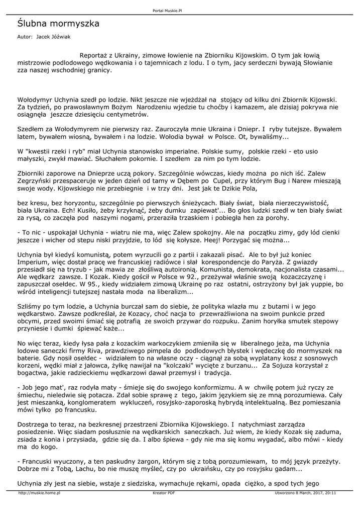 Portal Muskie.Pl Ślubna mormyszka Autor: Jacek Jóźwiak Reportaż z Ukrainy, zimowe łowienie na Zbiorniku Kijowskim. O tym jak łowią mistrzowie podlodowego wędkowania i o tajemnicach z lodu. I o tym, jacy serdeczni bywają Słowianie zza naszej wschodniej granicy. Wołodymyr Uchynia szedł po lodzie. Nikt jeszcze nie wjeżdżał na stojący od kilku dni Zbiornik Kijowski. Za tydzień, po prawosławnym Bożym Narodzeniu wjedzie tu choćby i kamazem, ale dzisiaj pokrywa nie osiągnęła jeszcze dziesięciu centymetrów. Szedłem za Wołodymyrem nie pierwszy raz. Zauroczyła mnie Ukraina i Dniepr. I ryby tutejsze. Bywałem latem, bywałem wiosną, bywałem i na lodzie. Wołodia bywał w Polsce. Ot, bywaliśmy... W "kwestii rzeki i ryb" miał Uchynia stanowisko imperialne. Polskie sumy, polskie rzeki - eto usio małyszki, zwykł mawiać. Słuchałem pokornie. I szedłem za nim po tym lodzie. Zbiorniki zaporowe na Dnieprze uczą pokory. Szczególnie wówczas, kiedy można po nich iść. Zalew Zegrzyński przespaceruje w jeden dzień od tamy w Dębem po Cupel, przy którym Bug i Narew mieszają swoje wody. Kijowskiego nie przebiegnie i w trzy dni. Jest jak te Dzikie Pola, bez kresu, bez horyzontu, szczególnie po pierwszych śnieżycach. Biały świat, biała nierzeczywistość, biała Ukraina. Ech! Kusiło, żeby krzyknąć, żeby dumku zapiewat'... Bo głos ludzki szedł w ten biały świat za rysą, co zaczęła pod naszymi nogami, przeraziła trzaskiem i pobiegła hen za porohy. - To nic - uspokajał Uchynia - wiatru nie ma, więc Zalew spokojny. Ale na początku zimy, gdy lód cienki jeszcze i wicher od stepu niski przyjdzie, to lód się kołysze. Heej! Porzygać się można... Uchynia był kiedyś komunistą, potem wyrzucili go z partii i zakazali pisać. Ale to był już koniec Imperium, więc dostał pracę we francuskiej radiówce i słał korespondencje do Paryża. Z gwiazdy przesiadł się na tryzub - jak mawia ze złośliwą autoironią. Komunista, demokrata, nacjonalista czasami... Ale wędkarz zawsze. I Kozak. Kiedy gościł w Polsce w 92., przeżywał właśnie swoją kozaczczyznę i zapuszczał osełdec. W 95., kiedy widziałem zimową Ukrainę po raz ostatni, ostrzyżony był jak yuppie, bo wśród inteligencji tutejszej nastała moda na liberalizm... Szliśmy po tym lodzie, a Uchynia burczał sam do siebie, że polityka wlazła mu z butami i w jego wędkarstwo. Zawsze podkreślał, że Kozacy, choć nacja to przewrażliwiona na swoim punkcie przed obcymi, przed swoimi śmiać się potrafią ze swoich przywar do rozpuku. Zanim horyłka smutek stepowy przyniesie i dumki śpiewać każe... No więc teraz, kiedy łysa pała z kozackim warkoczykiem zmieniła się w liberalnego jeża, ma Uchynia lodowe saneczki firmy Riva, prawdziwego pimpela do podlodowych błystek i wędeczkę do mormyszek na baterie. Gdy nosił osełdec - widziałem to na własne oczy - ciągnął za sobą wyplatany kosz z sosnowych korzeni, wędki miał z jałowca, żyłkę nawijał na "kolczaki" wycięte z burzanu... Za Sojuza korzystał z bogactwa, jakie radzieckiemu wędkarzowi dawał przemysł i tradycja. - Job jego mat', raz rodyła maty - śmieje się do swojego konformizmu. A w chwilę potem już ryczy ze śmiechu, nieledwie się potacza. Zdał sobie sprawę z tego, jakim językiem się ze mną porozumiewa. Cały jest mieszanką, konglomeratem wykluczeń, rosyjsko-zaporoską hybrydą intelektualną. Bez pomieszania mówi tylko po francusku. Dostrzega to teraz, na bezkresnej przestrzeni Zbiornika Kijowskiego. I natychmiast zarządza posiedzenie. Więc siadam posłusznie na wędkarskich saneczkach. Już wiem, że kiedy Kozak się zaduma, zsiada z konia i przysiada, gdzie się da. I albo śpiewa - gdy nie ma się komu wygadać, albo mówi - kiedy ma do kogo. - Francuski wyuczony, a ten paskudny żargon, którym się z tobą porozumiewam, to mój język przeżyty. Dobrze mi z Tobą, Lachu, bo nie muszę myśleć, czy po ukraińsku, czy po rosyjsku gadam... Uchynia zły jest na siebie, wstaje z siedziska, wymachuje rękami, opada ciężko, a spod tych jego http://muskie.home.pl Kreator PDF Utworzono 8 March, 2017, 20:11 Portal Muskie.Pl wątpliwości wybiega z trzaskiem kolejne pęknięcie i ucieka grzmotem w Zalew. - Znajdź wspólny mianownik, to uspokaja - mruczę do niego. Książki Canettiego to nasz wspólny mianownik. Kiedy tu był jeszcze Związek Sowiecki, on się uczył polskiego i przyjeżdżał po te książki do Warszawy. Więc wie, że rzucam tekstem z Canettiego, mistrza aforyzmu. Jedność z haczykiem... Do tego wniosku dojdzie Uchynia po dwóch kwadransach posiadu. Kimkolwiek by był, czy nie był, kogokolwiek by udawał, czy nie udawał, jakąkolwiek wędkę trzymał by w dłoni, ma Wołodymyr coś, co zawsze jest takie same i prawdziwe. To pudełko korkiem wyściełane i kolekcja podlodowych przynęt. Siedzimy na środku Zbiornika Kijowskiego i obracamy w palcach to nasze wędkarskie sedno, które powala się pogodzić z popieprzoną rzeczywistością. Kropla cyny na miedzianej blaszeczce, wypolerowanej do połysku. I cienki, wyczynowy hak, który przywiózł kiedyś z jakiejś służbowej delegacji do Skandynawii. Kropla cyny na blaszeczce mosiężnej, na blaszeczce srebrnej. Ten mosiądz, śmieje się Uchynia do własnych wspomnień, uzyskiwało się przez sklepywanie na kowadełku przykrętek do medali i odznaczeń. Żadna inna blaszka nie trzymała normy tak, jak wytwór państwowej mennicy. Za garść tych przykrętek płaciło się na wędkarskiej giełdzie majątek. Więc pracownicy mennicy wynosili te garście za bramę. I bohaterowie wojenni i gieroje socjalistycznego trudu odkręcali blaszki od swoich medali i handlowali nimi na giełdzie. Bo order mogła przytrzymać przedziurawiona i nagwintowana kopiejka, a błysku rozklepanej przykrętki nic nie zastąpiło. Nie wierzę? Więc Uchynia tu, na środku Zalewu, w miejscu, w którym nigdy nie łowił, wykręca dziurę, uzbra