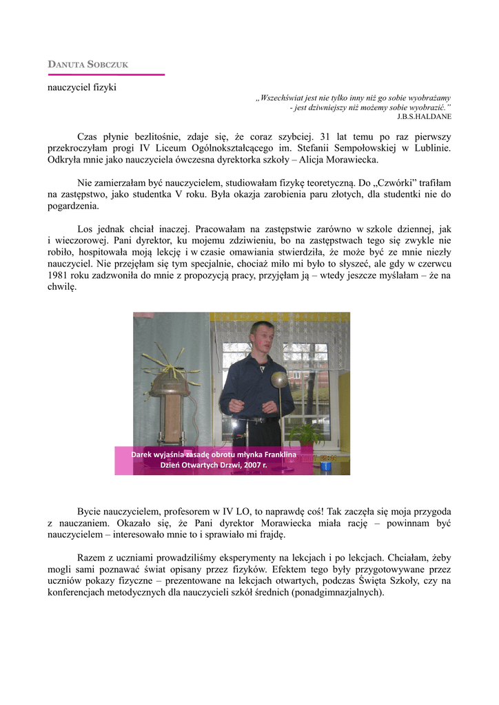 DANUTA SOBCZUK nauczyciel fizyki „Wszechświat jest nie tylko inny niż go sobie wyobrażamy - jest dziwniejszy niż możemy sobie wyobrazić.” J.B.S.HALDANE Czas płynie bezlitośnie, zdaje się, że coraz szybciej. 31 lat temu po raz pierwszy przekroczyłam progi IV Liceum Ogólnokształcącego im. Stefanii Sempołowskiej w Lublinie. Odkryła mnie jako nauczyciela ówczesna dyrektorka szkoły – Alicja Morawiecka. Nie zamierzałam być nauczycielem, studiowałam fizykę teoretyczną. Do „Czwórki” trafiłam na zastępstwo, jako studentka V roku. Była okazja zarobienia paru złotych, dla studentki nie do pogardzenia. Los jednak chciał inaczej. Pracowałam na zastępstwie zarówno w szkole dziennej, jak i wieczorowej. Pani dyrektor, ku mojemu zdziwieniu, bo na zastępstwach tego się zwykle nie robiło, hospitowała moją lekcję i w czasie omawiania stwierdziła, że może być ze mnie niezły nauczyciel. Nie przejęłam się tym specjalnie, chociaż miło mi było to słyszeć, ale gdy w czerwcu 1981 roku zadzwoniła do mnie z propozycją pracy, przyjęłam ją – wtedy jeszcze myślałam – że na chwilę. Darek wyjaśnia zasadę obrotu młynka Franklina Dzień Otwartych Drzwi, 2007 r. Bycie nauczycielem, profesorem w IV LO, to naprawdę coś! Tak zaczęła się moja przygoda z nauczaniem. Okazało się, że Pani dyrektor Morawiecka miała rację – powinnam być nauczycielem – interesowało mnie to i sprawiało mi frajdę. Razem z uczniami prowadziliśmy eksperymenty na lekcjach i po lekcjach. Chciałam, żeby mogli sami poznawać świat opisany przez fizyków. Efektem tego były przygotowywane przez uczniów pokazy fizyczne – prezentowane na lekcjach otwartych, podczas Święta Szkoły, czy na konferencjach metodycznych dla nauczycieli szkół średnich (ponadgimnazjalnych). Klasa IV A w pracowni fizycznej z p. Danutą Sobczuk, 2002 r. Innym efektem tych prac była możliwość wyłowienia talentów. Uczniów, którzy podejmowali wyzwanie, jakim była olimpiada fizyczna, było niewielu. Z tych, którzy startowali, byłam zawsze bardzo dumna. Podziwiałam ich za ogrom pracy, jaką wkładali, żeby się do zawodów przygotować. To ważne, że nie bali się przyrządów, urządzeń pomiarowych, budowania układów doświadczalnych. Ich praca niejednokrotnie była nagradzana zakwalifikowaniem się do zawodów II stopnia (okręgowych) olimpiady fizycznej. Byli to między innymi: 1989/90 – klasa IIIa – Marcin Zawistowski-Lulek, Arkadiusz Piekarski i Robert Gałczyński (zakwalifikował się do doświadczalnych zawodów II stopnia olimpiady fizycznej); 2000/2001 – klasa IVa – Michał Bartler i Albert Zając; 2001/2002 – klasa IVa – Paweł Choina, Marcin Fus, Tomasz Koryszko, Anna Siemińska i Sebastian Żuławski. Moi uczniowie brali też udział w konkursach: „Rok przed maturą”, „Lwiątko” czy w Ogólnopolskim Konkursie Na Pracę z Fizyki Cząstek im. prof. G. Białkowskiego. W tym ostatnim, w 1998 roku, została wyróżniona praca Marka Chruścickiego. W roku szkolnym 2005/06 trzech uczniów startowało w XLIX Olimpiadzie Astronomicznej: Krzysztof Kowalczyk z klasy IIIa, Michał Kowalik z klasy Ib, Michał Wąsowicz z klasy IIb. Do zawodów II stopnia zakwalifikował się Krzysztof Kowalczyk . W czerwcu 2006 roku uczniowie klasy IIb: Maciej Paluch i Michał Wąsowicz wystartowali w konkursie na projekt robota „ROBOT DEMO”, organizowanym przez Akademię GórniczoHutniczą w Krakowie. Zakwalifikowali się do II etapu konkursu. Uważam to za ich wielki sukces. Mam nadzieję spotkać na uroczystościach stulecia szkoły wielu swoich uczniów i przywitać ich słowami, które wypowiadała przy takich okazjach moja nauczycielka łaciny prof. Maria Nemetti: Salvetae, Carissimi discipuli mei! – Witajcie, najdrożsi moi uczniowie. Można by wspominać i wspominać… Moje doświadczenie z uczniami to ponad ćwierć wieku – prawie 1/3 wieku szkoły. Od początku bardzo ciepło zostałam przyjęta przez Grono Pedagogiczne. Bardzo dobrze mi się w IV LO pracowało. Dziękuję za to wszystkim Państwu Dyrektorom oraz Państwu Profesorom, z którymi los mnie zetknął w latach 1980-2012. Myślę też o tych, którzy niestety już odeszli na zawsze. Dziękuję moim młodszym koleżankom – moim uczennicom, które teraz stoją ze mną po tej samej stronie katedry. One pozwalają mi wierzyć, że swoją misję nauczyciela – wychowawcy wypełniałam dobrze. Dziękuję też swoim uczniom, których dowody sympatii i wdzięczności odczuwam na co dzień. W nich żyje mój wysiłek i długoletnia praca. Wszystkim uczestnikom uroczystości setnej rocznicy powstania szkoły życzę wielu niezatartych wspomnień i uśmiechu na co dzień.