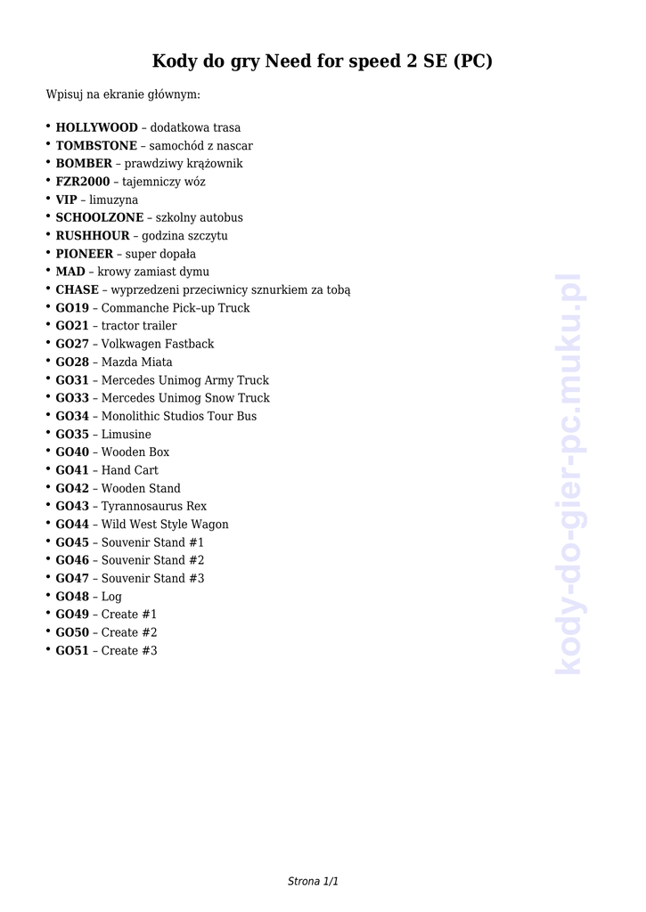 Kody do gry Need for speed 2 SE (PC) ● HOLLYWOOD – dodatkowa trasa ● TOMBSTONE – samochód z nascar ● BOMBER – prawdziwy krążownik ● FZR2000 – tajemniczy wóz ● VIP – limuzyna ● SCHOOLZONE – szkolny autobus ● RUSHHOUR – godzina szczytu ● PIONEER – super dopała ● MAD – krowy zamiast dymu ● CHASE – wyprzedzeni przeciwnicy sznurkiem za tobą ● GO19 – Commanche Pick–up Truck ● GO21 – tractor trailer ● GO27 – Volkwagen Fastback ● GO28 – Mazda Miata ● GO31 – Mercedes Unimog Army Truck ● GO33 – Mercedes Unimog Snow Truck ● GO34 – Monolithic Studios Tour Bus ● GO35 – Limusine ● GO40 – Wooden Box ● GO41 – Hand Cart ● GO42 – Wooden Stand ● GO43 – Tyrannosaurus Rex ● GO44 – Wild West Style Wagon ● GO45 – Souvenir Stand #1 ● GO46 – Souvenir Stand #2 ● GO47 – Souvenir Stand #3 ● GO48 – Log ● GO49 – Create #1 ● GO50 – Create #2 ● GO51 – Create #3 Strona 1/1 kody-do-gier-pc.muku.pl Wpisuj na ekranie głównym: