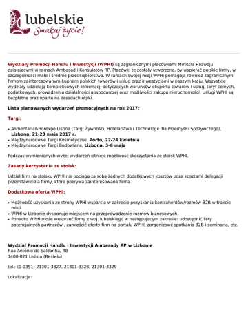 Wydziały Promocji Handlu i Inwestycji (WPHI) są zagranicznymi placówkami Ministra Rozwoju działającymi w ramach Ambasad i Konsulatów RP. Placówki te zostały utworzone, by wspierać polskie firmy, w szczególności małe i średnie przedsiębiorstwa. W ramach swojej misji WPHI pomagają również zagranicznym firmom zainteresowanym kupnem polskich towarów i usług oraz inwestycjami w naszym kraju. Wszystkie wydziały udzielają kompleksowych informacji dotyczących warunków eksportu towarów i usług, taryf celnych, podatkowych, prowadzenia działalności gospodarczej oraz możliwości zakupu nieruchomości. Usługi WPHI są bezpłatne oraz oparte na zasadach etyki. Lista planowanych wydarzeń promocyjnych na rok 2017: Targi: ● ● ● Alimentaria&Horexpo Lisboa (Targi Żywności, Hotelarstwa i Technologii dla Przemysłu Spożywczego), Lizbona, 21-23 maja 2017 r. Międzynarodowe Targi Kosmetyczne, Porto, 22-24 kwietnia Międzynarodowe Targi Budowlane, Lizbona, 3-6 maja Podczas wymienionych wyżej wydarzeń istnieje możliwość skorzystania ze stoisk WPHI. Zasady korzystania ze stoisk: Udział firm na stoisku WPHI nie pociąga za sobą żadnych dodatkowych kosztów poza kosztami delegacji przedstawiciela firmy, które pokrywa zainteresowana firma. Dodatkowa oferta WPHI: ● ● ● Możliwość uzyskania ze strony WPHI wsparcia w zakresie pozyskania kontrahentów/rozmów B2B w trakcie misji. WPHI w Lizbonie dysponuje miejscem na przeprowadzenie rozmów biznesowych. Ponadto WPHI może wesprzeć firmy z woj. lubelskiego w następującym zakresie: udostępnić listy potencjalnych partnerów , zamieścić oferty firm na portalu WPHI, zorganizowć spotkania B2B i seminaria, etc. Wydział Promocji Handlu i Inwestycji Ambasady RP w Lizbonie Rua António de Saldanha, 48 1400-021 Lisboa (Restelo) tel.: (0-0351) 21301-3327, 21301-3328, 21301-3329 Lokalizacja: Rodzaj: WPHI Strona internetowa: http://www.lisbon.trade.gov.pl [1] Drukuj [2] Pobierz PDF [3] Pobierz DOC [4] Źródło: http://www.invest.lubelskie.pl/pl/wydzial-promocji-handlu-i-inwestycji-ambasady-rp-w-lizbonie Odnośniki [1] http://www.lisbon.trade.gov.pl [2] http://www.invest.lubelskie.pl/pl/print/925 [3] http://www.invest.lubelskie.pl/pl/printpdf/925 [4] http://www.invest.lubelskie.pl/pl/print/925?type=doc