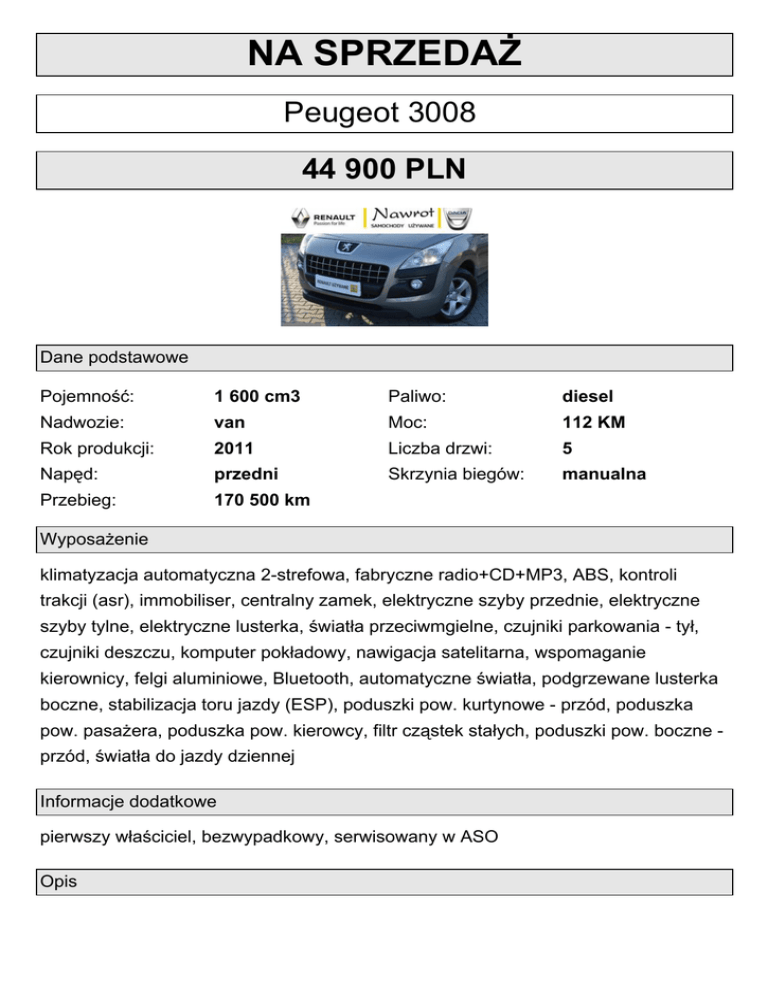 NA SPRZEDAŻ Peugeot 3008 44 900 PLN Dane podstawowe Pojemność: 1 600 cm3 Paliwo: diesel Nadwozie: van Moc: 112 KM Rok produkcji: 2011 Liczba drzwi: 5 Napęd: przedni Skrzynia biegów: manualna Przebieg: 170 500 km Wyposażenie klimatyzacja automatyczna 2-strefowa, fabryczne radio+CD+MP3, ABS, kontroli trakcji (asr), immobiliser, centralny zamek, elektryczne szyby przednie, elektryczne szyby tylne, elektryczne lusterka, światła przeciwmgielne, czujniki parkowania - tył, czujniki deszczu, komputer pokładowy, nawigacja satelitarna, wspomaganie kierownicy, felgi aluminiowe, Bluetooth, automatyczne światła, podgrzewane lusterka boczne, stabilizacja toru jazdy (ESP), poduszki pow. kurtynowe - przód, poduszka pow. pasażera, poduszka pow. kierowcy, filtr cząstek stałych, poduszki pow. boczne przód, światła do jazdy dziennej Informacje dodatkowe pierwszy właściciel, bezwypadkowy, serwisowany w ASO Opis Polski salo, pierwszy właściciel, serwisowany w ASO. Faktura VAT 23% Wyposażenie: ESP / ABS 6 poduszek powietrznych czujnik zmierzchu czujnik deszczu system nawigacji klimatyzacja elektroniczna 2-strefowa fabryczne radio Bluetooth z zestawem głośnomówiącym komputer pokładowy wspomaganie układu kierowniczego szyby przednie i tylne regulowane elektrycznie lusterka regulowane elektrycznie, ogrzewane felgi aluminiowe czujniki parkowania z tyłu Kontakt: Tomasz Hubczak 663-333-444 hubczak(małpka)nawrot.pl Mateusz Falkowski 693-88-58-58 m.falkowski(małpka)nawrot.pl Niniejsza specyfikacja nie stanowi oferty w rozumieniu Kodeksu Cywilnego. Przed podjęciem decyzji o zakupie prosimy o kontakt telefoniczny z handlowcem w celu potwierdzenia dostępności oferty. Kontakt: Tomasz Hubczak 663-333-444 hubczak(małpka)nawrot.pl Mateusz Falkowski 693-88-58-58 m.falkowski(małpka)nawrot.pl Niniejsza specyfikacja nie stanowi oferty w rozumieniu Kodeksu Cywilnego. Przed podjęciem decyzji o zakupie prosimy o kontakt telefoniczny z handlowcem w celu potwierdzenia dostępności oferty.