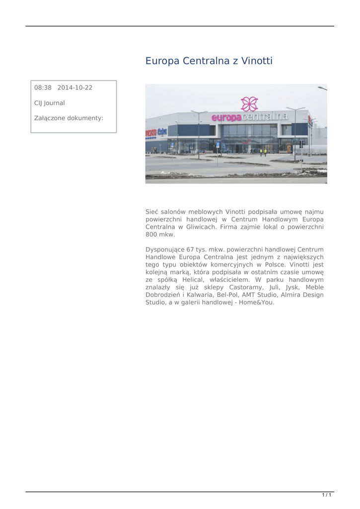 Europa Centralna z Vinotti 08:38 2014-10-22 CIJ Journal Załączone dokumenty: Sieć salonów meblowych Vinotti podpisała umowę najmu powierzchni handlowej w Centrum Handlowym Europa Centralna w Gliwicach. Firma zajmie lokal o powierzchni 800 mkw. Dysponujące 67 tys. mkw. powierzchni handlowej Centrum Handlowe Europa Centralna jest jednym z największych tego typu obiektów komercyjnych w Polsce. Vinotti jest kolejną marką, która podpisała w ostatnim czasie umowę ze spółką Helical, właścicielem. W parku handlowym znalazły się już sklepy Castoramy, Juli, Jysk, Meble Dobrodzień i Kalwaria, Bel-Pol, AMT Studio, Almira Design Studio, a w galerii handlowej - Home&You. 1/1