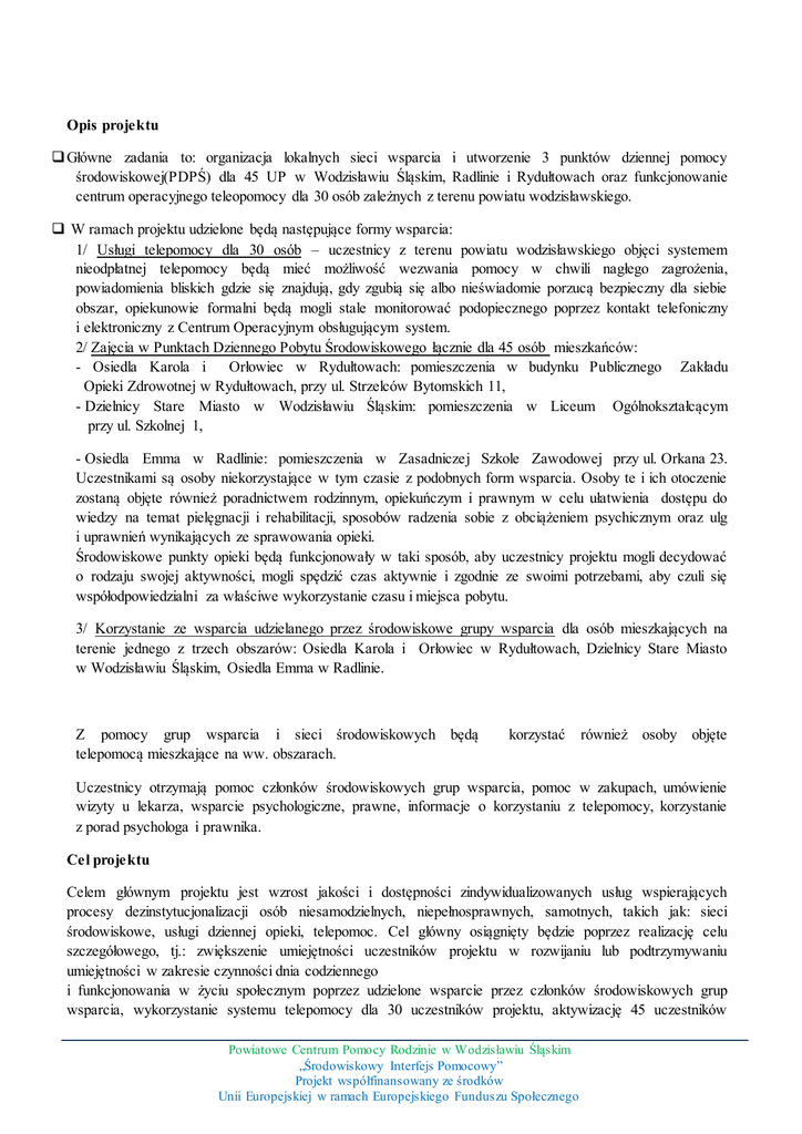 Opis projektu Główne zadania to: organizacja lokalnych sieci wsparcia i utworzenie 3 punktów dziennej pomocy środowiskowej(PDPŚ) dla 45 UP w Wodzisławiu Śląskim, Radlinie i Rydułtowach oraz funkcjonowanie centrum operacyjnego teleopomocy dla 30 osób zależnych z terenu powiatu wodzisławskiego. W ramach projektu udzielone będą następujące formy wsparcia: 1/ Usługi telepomocy dla 30 osób – uczestnicy z terenu powiatu wodzisławskiego objęci systemem nieodpłatnej telepomocy będą mieć możliwość wezwania pomocy w chwili nagłego zagrożenia, powiadomienia bliskich gdzie się znajdują, gdy zgubią się albo nieświadomie porzucą bezpieczny dla siebie obszar, opiekunowie formalni będą mogli stale monitorować podopiecznego poprzez kontakt telefoniczny i elektroniczny z Centrum Operacyjnym obsługującym system. 2/ Zajęcia w Punktach Dziennego Pobytu Środowiskowego łącznie dla 45 osób mieszkańców: - Osiedla Karola i Orłowiec w Rydułtowach: pomieszczenia w budynku Publicznego Zakładu Opieki Zdrowotnej w Rydułtowach, przy ul. Strzelców Bytomskich 11, - Dzielnicy Stare Miasto w Wodzisławiu Śląskim: pomieszczenia w Liceum Ogólnokształcącym przy ul. Szkolnej 1, - Osiedla Emma w Radlinie: pomieszczenia w Zasadniczej Szkole Zawodowej przy ul. Orkana 23. Uczestnikami są osoby niekorzystające w tym czasie z podobnych form wsparcia. Osoby te i ich otoczenie zostaną objęte również poradnictwem rodzinnym, opiekuńczym i prawnym w celu ułatwienia dostępu do wiedzy na temat pielęgnacji i rehabilitacji, sposobów radzenia sobie z obciążeniem psychicznym oraz ulg i uprawnień wynikających ze sprawowania opieki. Środowiskowe punkty opieki będą funkcjonowały w taki sposób, aby uczestnicy projektu mogli decydować o rodzaju swojej aktywności, mogli spędzić czas aktywnie i zgodnie ze swoimi potrzebami, aby czuli się współodpowiedzialni za właściwe wykorzystanie czasu i miejsca pobytu. 3/ Korzystanie ze wsparcia udzielanego przez środowiskowe grupy wsparcia dla osób mieszkających na terenie jednego z trzech obszarów: Osiedla Karola i Orłowiec w Rydułtowach, Dzielnicy Stare Miasto w Wodzisławiu Śląskim, Osiedla Emma w Radlinie. Z pomocy grup wsparcia i sieci środowiskowych będą telepomocą mieszkające na ww. obszarach. korzystać również osoby objęte Uczestnicy otrzymają pomoc członków środowiskowych grup wsparcia, pomoc w zakupach, umówienie wizyty u lekarza, wsparcie psychologiczne, prawne, informacje o korzystaniu z telepomocy, korzystanie z porad psychologa i prawnika. Cel projektu Celem głównym projektu jest wzrost jakości i dostępności zindywidualizowanych usług wspierających procesy dezinstytucjonalizacji osób niesamodzielnych, niepełnosprawnych, samotnych, takich jak: sieci środowiskowe, usługi dziennej opieki, telepomoc. Cel główny osiągnięty będzie poprzez realizację celu szczegółowego, tj.: zwiększenie umiejętności uczestników projektu w rozwijaniu lub podtrzymywaniu umiejętności w zakresie czynności dnia codziennego i funkcjonowania w życiu społecznym poprzez udzielone wsparcie przez członków środowiskowych grup wsparcia, wykorzystanie systemu telepomocy dla 30 uczestników projektu, aktywizację 45 uczestników Powiatowe Centrum Pomocy Rodzinie w Wodzisławiu Śląskim „Środowiskowy Interfejs Pomocowy” Projekt współfinansowany ze środków Unii Europejskiej w ramach Europejskiego Funduszu Społecznego projektu w punktach dziennego pobytu środowiskowego oraz poradnictwo psychologiczne i prawne. Projekt skierowany jest do 75 osób wykluczonych lub zagrożonych ubóstwem lub wykluczeniem społecznym ( niesamodzielnych, samotnych oraz co najmniej 8 osób niepełnosprawnych w stopniu znacznym lub umiarkowanym) z terenu powiatu wodzisławskiego. Planowane efekty: 1. Przygotowanie środowisk do objęcia usługami społecznymi świadczonymi w interesie ogólnym osób zagrożonych ubóstwem lub wykluczeniem społecznym. 2. Podniesienie lub nabycie podstawowych kompetencji cyfrowych oraz świadczenie specjalistycznej usługi telepomocy. 3. Gotowość świadczenia usług społecznych dla 45 osób zagrożonych ubóstwem lub wykluczeniem społecznym oraz świadczenia usług w środowiskach lokalnych przez 3 mentorów środowiskowych prowadzących sieci wsparcia środowiskowego w Wodzisławiu Śląskim, Radlinie i Rydułtowach. Wartość projektu: 946 774,19 zł Wkład Funduszy Europejskich 804 758,06 zł Środowiskowy Interfejs Pomocowy Powiatowe Centrum Pomocy Rodzinie w Wodzisławiu Śląskim „Środowiskowy Interfejs Pomocowy” Projekt współfinansowany ze środków Unii Europejskiej w ramach Europejskiego Funduszu Społecznego
