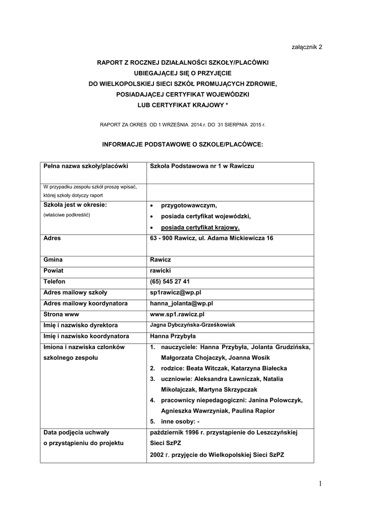 załącznik 2 RAPORT Z ROCZNEJ DZIAŁALNOŚCI SZKOŁY/PLACÓWKI UBIEGAJĄCEJ SIĘ O PRZYJĘCIE DO WIELKOPOLSKIEJ SIECI SZKÓŁ PROMUJĄCYCH ZDROWIE, POSIADAJĄCEJ CERTYFIKAT WOJEWÓDZKI LUB CERTYFIKAT KRAJOWY * RAPORT ZA OKRES OD 1 WRZEŚNIA 2014.r. DO 31 SIERPNIA 2015 r. INFORMACJE PODSTAWOWE O SZKOLE/PLACÓWCE: Pełna nazwa szkoły/placówki Szkoła Podstawowa nr 1 w Rawiczu W przypadku zespołu szkół proszę wpisać, której szkoły dotyczy raport Szkoła jest w okresie: przygotowawczym, (właściwe podkreślić) posiada certyfikat wojewódzki, posiada certyfikat krajowy. Adres 63 - 900 Rawicz, ul. Adama Mickiewicza 16 Gmina Rawicz Powiat rawicki Telefon (65) 545 27 41 Adres mailowy szkoły [email protected] Adres mailowy koordynatora [email protected] Strona www www.sp1.rawicz.pl Imię i nazwisko dyrektora Jagna Dybczyńska-Grześkowiak Imię i nazwisko koordynatora Hanna Przybyła Imiona i nazwiska członków 1. nauczyciele: Hanna Przybyła, Jolanta Grudzińska, szkolnego zespołu Małgorzata Chojaczyk, Joanna Wosik 2. rodzice: Beata Witczak, Katarzyna Białecka 3. uczniowie: Aleksandra Ławniczak, Natalia Mikołajczak, Martyna Skrzypczak 4. pracownicy niepedagogiczni: Janina Polowczyk, Agnieszka Wawrzyniak, Paulina Rapior 5. inne osoby: - Data podjęcia uchwały październik 1996 r. przystąpienie do Leszczyńskiej o przystąpieniu do projektu Sieci SzPZ 2002 r. przyjęcie do Wielkopolskiej Sieci SzPZ 1 1. Opis podjętych działań w zakresie diagnozowania potrzeb społeczności szkolnej. 1. Narzędzia użyte do diagnozy: Arkusz I. DIAGNOZA DZIAŁAŃ SZKOŁY W ZAKRESIE ZDROWEGO ŻYWIENIA Wyniki diagnozy - wyłonione problemy: Zbyt małe zainteresowanie rodziców edukacją własną w zakresie żywienia dzieci. Brak dostępu uczniów do bezpłatnej wody pitnej. Wybrany spośród ww. problemów, problem priorytetowy. Zbyt małe zainteresowanie rodziców edukacją własną w zakresie żywienia dzieci. Brak dostępu uczniów do bezpłatnej wody pitnej. 2. 3. 2. Plan działań w zakresie promocji zdrowia – załączyć do raportu. UWAGA! W planie powinny znaleźć się wyłącznie działania mające na celu rozwiązanie problemu/ów priorytetowych 3. Sprawozdanie z realizacji podjętych działań, ujętych w załączonym do raportu planie działań. Opisać krótko, w jaki sposób zostały zrealizowane poszczególne punkty planu działań dotyczące problemu/ów priorytetowych/ Zadania wynikające z realizacji projektu „Szkoła promująca zdrowie” przekazywaliśmy na bieżąco społeczności szkolnej i lokalnej poprzez umieszczanie informacji o programie, planie pracy oraz o aktualnie podejmowanych działaniach w szkolnym serwisie WWW; prowadziliśmy stałą tablicę pod nazwą „Promocja zdrowia”, która dostarczała wiadomości na temat zdrowego odżywiania, zdrowej żywności, porad i przepisów kulinarnych. Angażowaliśmy rodziców w działania dotyczące zmiany sposobu odżywiania dzieci w szkole i w domu, zachęcaliśmy do współpracy. Nauczyciele przedstawili ofertę swoich działań i zaproponowali rodzicom włączenie się w proponowane działania, bądź przedstawienie swoich pomysłów, co zaowocowało szeregiem wspólnie realizowanych projektów. 7 listopada 2014r. cała społeczność szkolna spożywała zdrowe śniadanie w ramach programu „ Śniadanie daje moc”, również w listopadzie wzięliśmy udział w konkursie pt. „Kulinarni odkrywcy”. Zorganizowaliśmy konkurs na prezentację multimedialną w klasach VI i V pt.: „Cukier? Nie dziękuję”. Tegoroczne warsztaty szkolne pod hasłem „Zdrowie na talerzu” były dla uczniów SP 1 wspaniałą zabawą, która jednocześnie wyposażyła uczniów w wiedzę i umiejętności niezbędne do podejmowania właściwych wyborów żywieniowych. Nauczycieli i rodziców przeszkolono w zakresie zaburzeń stanu zdrowia i rozwoju w związku z nieprawidłowym odżywianiem (otyłość, niedobór masy ciała, anoreksja, bulimia). Tematem spotkań było rozpoznanie symptomów choroby, szukanie pomocy i zwrócenie uwagi na dzieci przewlekle chore w szkole. Edukacji dokonała dietetyczka p. Martyna Chuda. Zorganizowaliśmy festyn szkolny z okazji Dnia Dziecka, podczas którego królowały stragany ze zdrową żywnością, a naszą ofertę (w związku z upałami) poszerzyliśmy o soki owocowo – warzywne i koktajle owocowe. Dzięki staraniom Dyrektora Szkoły rozwiązaliśmy drugi z problemów priorytetowych i zapewniliśmy uczniom dostęp do bezpłatnej wody pitnej dzięki zakupowi dystrybutora wody. Propagowaniu zdrowych nawyków żywieniowych służyło również uczestnictwo społeczności szkolnej w ogólnopolskich programach edukacyjnych promujących zdrowe odżywianie: ,,Szklanka mleka’’, „Owoce w szkole” oraz „Trzymaj formę”. 4. Monitorowanie podjętych działań, ujętych w załączonym do raportu planie działań. 1. Sposób monitorowania podjętych działania: Odnotowywanie w protokole z zebrań klasowych, analiza wyników ankiet, analiza dokumentacji szkolnej, wszystkie wydarzenia szkolne związane ze zdrowiem dokumentowane w formie wpisów na stronie WWW szkoły. 2. Odpowiedzialni za monitorowanie poszczególnych działań: członkowie Szkolnego Zespołu SzPZ. 5. Informacja na temat ewaluacji podjętych działań, ujętych w załączonym do raportu planie działań. 1. Sposób przeprowadzenia ewaluacji: Sposób sprawdzenia czy osiągnięto cel: co wskaże, że osiągnięto cel: Liczba rodziców biorących udział Jak sprawdzimy (narzędzia) Lista obecności kto i kiedy sprawdzi ? Nauczyciele wychowawcy klas I – VI 2 w spotkaniu ze specjalistą w zakresie właściwego odżywiania koordynator szkolny SzPZ – H. Przybyła Diagnoza: VI 2015 Liczba pozytywnych odpowiedzi rodziców Ankieta dla rodziców Liczba uczniów spożywających zdrowy posiłek podczas przerwy śniadaniowej Rejestr uczniów Nauczyciele wychowawcy klas I – VI szkolny zespół promocji zdrowia Diagnoza: VI 2015 Samorząd ucz
