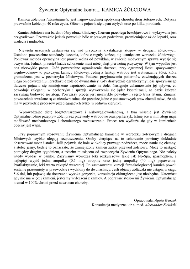 Żywienie Optymalne kontra... KAMICA ŻÓŁCIOWA Kamica żółciowa (cholelithiasis) jest najpowszechniej spotykaną chorobą dróg żółciowych. Dotyczy przeważnie kobiet po 40 roku życia. Głównie pojawia się u pań otyłych oraz po kilku porodach. Kamica żółciowa ma bardzo różny obraz kliniczny. Czasem przebiega bezobjawowo i wykrywana jest przypadkowo. Przeważnie jednak powoduje bóle w prawym podżebrzu, promieniujące aż do łopatki, oraz wzdęcia i nudności. Niewielu uczonych zastanawia się nad przyczyną krystalizacji złogów w drogach żółciowych. Ustalono powszechne standardy leczenia, które z reguły kończą się usunięciem woreczka żółciowego. Ponieważ metoda operacyjna jest prawie wolna od powikłań, w świecie medycznym sprawa wydaje się oczywista. Jednak, przecież każde schorzenie musi mieć jakąś pierwotną przyczynę. W tym wypadku jest ona niezwykle prosta. Otóż powszechne ograniczenie tłuszczu, przy ogromnej ilości spożywanych węglowodanów to przyczyna kamicy żółciowej. Jedną z funkcji wątroby jest wytwarzanie żółci, która gromadzona jest w pęcherzyku żółciowym. Podczas przyjmowania pokarmów zawierających tłuszcz ulega on obkurczeniu i przekazuje żółć do dwunastnicy. Gdy drastycznie ograniczymy ilość spożywanego tłuszczu pojawia się zmniejszone zapotrzebowanie na żółć. Następuje zahamowanie jej spływu, co powoduje zaleganiu w pęcherzyku i sprzyja wytworzeniu się jąder krystalizacji, na bazie których zaczynają budować się złogi. Powyższy proces jest niezwykle powolny i często trwa latami. Zmiany, powszechnie uważane są za nieodwracalne, ale przecież jedno z podstawowych praw chemii mówi, że nie ma w przyrodzie procesów przebiegających tylko w jednym kierunku. Wprowadzając dietę bogatotłuszczową i niskowęglowodanową, a tym właśnie jest Żywienie Optymalne rośnie przepływ żółci przez przewody wątrobowe oraz pęcherzyk. Istniejące w nim złogi mają możliwość mechanicznego i chemicznego rozpuszczania. Proces ten wydłuża się gdy w kamieniach obecny jest wapń. Przy poprawnym stosowaniu Żywienia Optymalnego kamienie w woreczku żółciowym i drogach żółciowych szybko ulegają rozpuszczeniu. Osoby cierpiące na to schorzenie powinny dokładnie obserwować mocz i stolec. Jeśli pojawią się bóle w okolicy prawego podżebrza, mocz stanie się ciemny, a stolec jasny, będzie to oznaczało, że zmniejszony kamień zatkał przewód żółciowy. Może to nastąpić pomiędzy drugim tygodniem, a trzecim miesiącem od rozpoczęcia Żywienia Optymalnego. Nie należy wtedy wpadać w panikę. Zażywamy wówczas leki rozkurczowe takie jak No-Spa, spasmophen, a najlepiej wypić jedną ampułkę (0,5 mg) atropiny oraz jedną ampułkę (40 mg) papaweriny. Profilaktycznie, leki warto zakupić wcześniej. Po zastosowaniu kuracji farmakologicznej kamień powoli zostanie przesunięty w przewodzie i wydalony do dwunastnicy. Jeśli objawy żółtaczki nie ustąpią w ciągu 5-6 dni, lub pojawią się dreszcze i wysoka gorączka, konsultacja chirurgiczna jest niezbędna. Natomiast gdy nie ma więcej kamieni, jesteśmy wyleczeni z kamicy. A poprawne stosowani Żywienia Optymalnego niemal w 100% chroni przed nawrotem choroby. Opracowała: Agata Waszak Konsultacja medyczna: dr n. med. Aleksander Zieliński