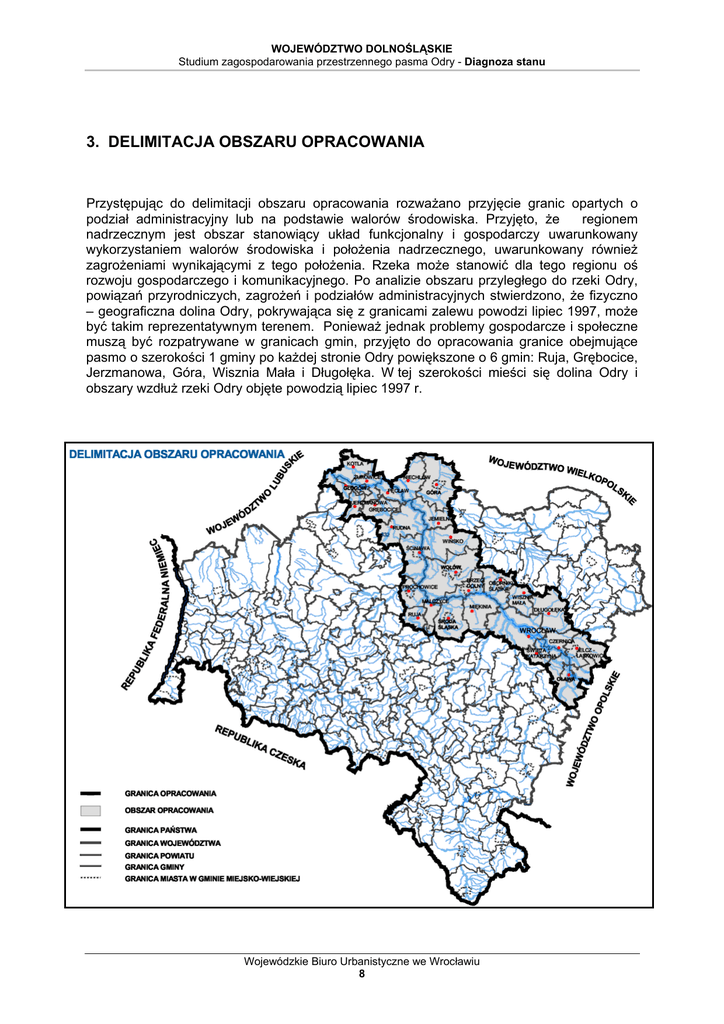 WOJEWÓDZTWO DOLNOŚLĄSKIE Studium zagospodarowania przestrzennego pasma Odry - Diagnoza stanu 3. DELIMITACJA OBSZARU OPRACOWANIA Przystępując do delimitacji obszaru opracowania rozważano przyjęcie granic opartych o podział administracyjny lub na podstawie walorów środowiska. Przyjęto, że regionem nadrzecznym jest obszar stanowiący układ funkcjonalny i gospodarczy uwarunkowany wykorzystaniem walorów środowiska i położenia nadrzecznego, uwarunkowany również zagrożeniami wynikającymi z tego położenia. Rzeka może stanowić dla tego regionu oś rozwoju gospodarczego i komunikacyjnego. Po analizie obszaru przyległego do rzeki Odry, powiązań przyrodniczych, zagrożeń i podziałów administracyjnych stwierdzono, że fizyczno – geograficzna dolina Odry, pokrywająca się z granicami zalewu powodzi lipiec 1997, może być takim reprezentatywnym terenem. Ponieważ jednak problemy gospodarcze i społeczne muszą być rozpatrywane w granicach gmin, przyjęto do opracowania granice obejmujące pasmo o szerokości 1 gminy po każdej stronie Odry powiększone o 6 gmin: Ruja, Grębocice, Jerzmanowa, Góra, Wisznia Mała i Długołęka. W tej szerokości mieści się dolina Odry i obszary wzdłuż rzeki Odry objęte powodzią lipiec 1997 r. Wojewódzkie Biuro Urbanistyczne we Wrocławiu 8