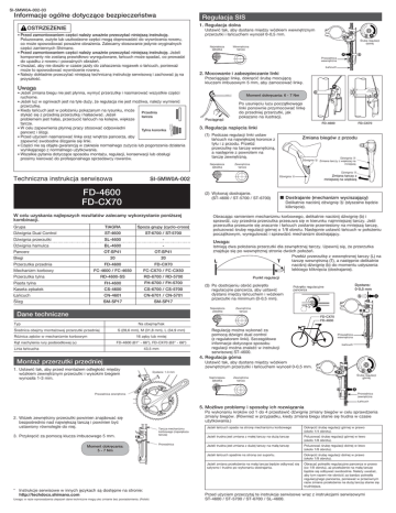 SI-5MW0A-002-03 Informacje ogólne dotyczące bezpieczeństwa Regulacja SIS 1. Regulacja dolna OSTRZEŻENIE • Przed zamontowaniem części należy uważnie przeczytać niniejszą instrukcję. Poluzowane, zużyte lub uszkodzone części mogą doprowadzić do wywrócenia roweru, co może spowodować poważne obrażenia. Zalecamy stosowanie jedynie oryginalnych części zamiennych Shimano. • Przed zamontowaniem części należy uważnie przeczytać niniejszą instrukcję. Jeżeli komponenty nie zostaną prawidłowo wyregulowane, łańcuch może spadać, co prowadzi do upadku z roweru i poważnych obrażeń. • Uważać, aby nie doszło w czasie jazdy do zahaczenia nogawek o łańcuch, ponieważ może to spowodować wywrócenie roweru. • Należy dokładnie przeczytać niniejszą techniczną instrukcję serwisową i zachować ją na przyszłość. Ustawić tak, aby dystans między wózkiem wewnętrznym przerzutki i łańcuchem wynosił 0-0,5 mm. Śruba regulacji dolnej Największa zębatka Wewnętrzna tarcza Prowadnica wewnętrzna Łańcuch 2. Mocowanie i zabezpieczanie linki Przeciągając linkę, dokręcić śrubę mocującą kluczem imbusowym 5 mm, aby zamocować linkę. Uwaga • Jeżeli zmiana biegu nie jest płynna, wymyć przerzutkę i nasmarować wszystkie części Moment dokręcania: 6 - 7 Nm ruchome. • Jeżeli luz w ogniwach jest na tyle duży, że regulacja nie jest możliwa, należy wymienić przerzutkę. • Kiedy łańcuch jest w położeniu pokazanym na rysunku, może Przednia tarcza stykać się z przednią przerzutką i hałasować. Jeżeli problemem jest hałas, przerzucić łańcuch na kolejne, większe tarcze. • W celu zapewnienia płynnej pracy stosować odpowiedni Tylna koronka pancerz i ślizgi. • Przed użyciem nasmarować linkę oraz wnętrze pancerza, aby zapewnić swobodne ślizganie się linki. • Części nie są objęte gwarancją w zakresie normalnego zużycia lub pogorszenia działania wynikającego z normalnego użytkowania. • Wszelkie pytania dotyczące sposobu montażu, regulacji, konserwacji lub obsługi prosimy kierować do profesjonalnego sprzedawcy rowerów. Pociągnąć Po usunięciu luzu początkowego linki ponownie przymocować linkę do przedniej przerzutki, jak pokazano na ilustracji. FD-4600 FD-CX70 3. Regulacja napięcia linki (1) Podczas regulacji linki ustaw łańcuch na największej koronce z tyłu i z przodu. Przełóż przerzutkę na tarczę wewnętrzną, a następnie z powrotem na tarczę zewnętrzną. Największa zębatka Zmiana biegów z przodu Dźwignia a Dźwignia b Zmiana tarczy z większej na mniejszą Zewnętrzna tarcza Dźwignia a Techniczna instrukcja serwisowa FD-4600 FD-CX70 (2) Wykonaj dostrajanie. (ST-4600 / ST-5700 / ST-6700) W celu uzyskania najlepszych rezultatów zalecamy wykorzystanie poniższej kombinacji. Grupa TIAGRA Spoza grupy (cyclo-cross) Dźwignia Dual Control ST-4600 ST-6700 / ST-5700 Dźwignia przerzutki SL-4600 - Dźwignia hamulca BL-4600 - Pancerz OT-SP41 OT-SP41 20 20 Przerzutka przednia FD-4600 FD-CX70 Mechanizm korbowy FC-4600 / FC-4650 FC-CX70 / FC-CX50 RD-4600-SS RD-6700 / RD-5700 Piasta tylna FH-4600 FH-6700 / FH-5700 Kaseta zębatek CS-4600 CS-6700 / CS-5700 Łańcuch CN-4601 CN-6701 / CN-5701 Ślizg SM-SP17 SM-SP17 Biegi Przerzutka tylna ■ Dostrajanie (mechanizm wyciszający) Delikatnie naciśnij dźwignię b (słyszalne będzie kliknięcie). Obracając ramieniem mechanizmu korbowego, delikatnie naciśnij dźwignię (b) i sprawdź, czy przednia przerzutka przesuwa się w kierunku najmniejszej tarczy. Jeśli przerzutka przesunie się znacznie i łańcuch zostanie przeniesiony na mniejszą tarczę, poluzować śrubę regulacji górnej o 1/8 obrotu. Następnie ustawić łańcuch w położeniu początkowym, wyregulować i sprawdzić mechanizm dostrajający. Uwaga: Istnieją dwa położenia przerzutki dla zewnętrznej tarczy. Upewnij się, że przerzutka znajduje się po wewnętrznej stronie dwóch położeń. Przełóż przerzutkę z wewnętrznej tarczy (L) na tarczę wewnętrzną (T), a następnie delikatnie naciśnij dźwignię (b) do momentu usłyszenia lekkiego kliknięcia (dostrajanie). Punkt regulacji (3) Po dostrojeniu obróć pokrętło regulacyjne pancerza, aby ustawić dystans między łańcuchem i wózkiem przerzutki na minimum (0-0,5 mm). Największa zębatka Dane techniczne Zmiana tarczy z mniejszej na większą Dźwignia a SI-5MW0A-002 Dystans: 0-0,5 mm Pokrętło regulacyjne pancerza Zewnętrzna tarcza FD-CX70 FD-4600 Na obejmę/hak Typ Średnica obejmy montażowej przerzutki przedniej S (28,6 mm), M (31,8 mm), L (34,9 mm) Różnica zębów w mechanizmie korbowym 16 zęby lub mniej Kąt nachylenia rury podsiodłowej (C) FD-4600 (61° - 66°), FD-CX70 (63° - 66°) Linia łańcucha 43,5 mm Prowadnica wewnętrzna Łańcuch 4. Regulacja górna Montaż przerzutki przedniej 1. Ustawić tak, aby przed montażem odległość między wózkiem zewnętrznym przerzutki i wysokim biegiem wynosiła 1-3 mm. Regulację można wykonać za pomocą dźwigni dual control (z regulatorem linki). Szczegółowe informacje dotyczące sposobu regulacji można znaleźć w instrukcji serwisowej ST-4600. Ustawić tak, aby dystans między wózkiem zewnętrznym przerzutki i łańcuchem wynosił 0-0,5 mm. Dystans: 1-3 mm Najmniejsza zębatka Zewnętrzna tarcza Śruba regulacji górnej Prowadnica zewnętrzna Prowadnica zewnętrzna Łańcuch 5. Możliwe problemy i sposoby ich rozwiązania 2. Wózek zewnętrzny przerzutki powinien znajdować się bezpośrednio nad największą tarczą i powinien być ustawiony równolegle do niej. 3. Przykręcić za pomocą klucza imbusowego 5 mm. Moment dokręcania: 5 - 7 Nm * Instrukcje serwisowe w innych językach są dostępne na stronie: http://techdocs.shimano.com Uwaga: w razie wprowadzenia ulepszeń dane techniczne mogą ulec zmianie bez powiadomienia. (Polish) Po wykonaniu kroków od 1 do 4 przestawić dźwignię zmiany biegów w celu sprawdzenia zmiany biegów. (Ró