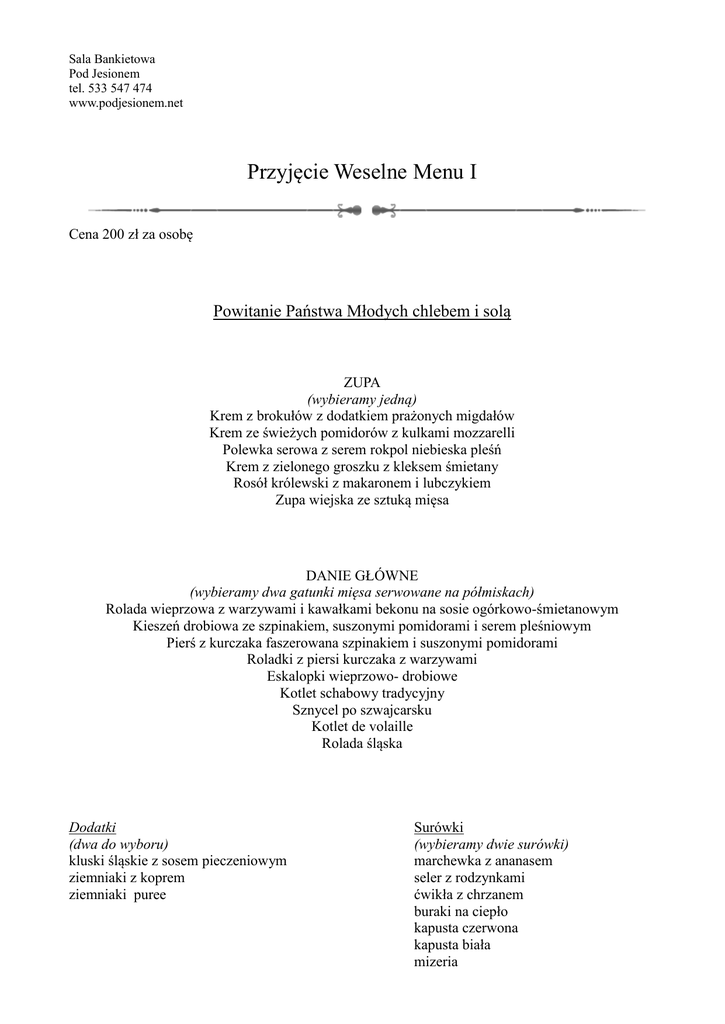 Przyjęcie Weselne Menu I - SALA BANKIETOWA