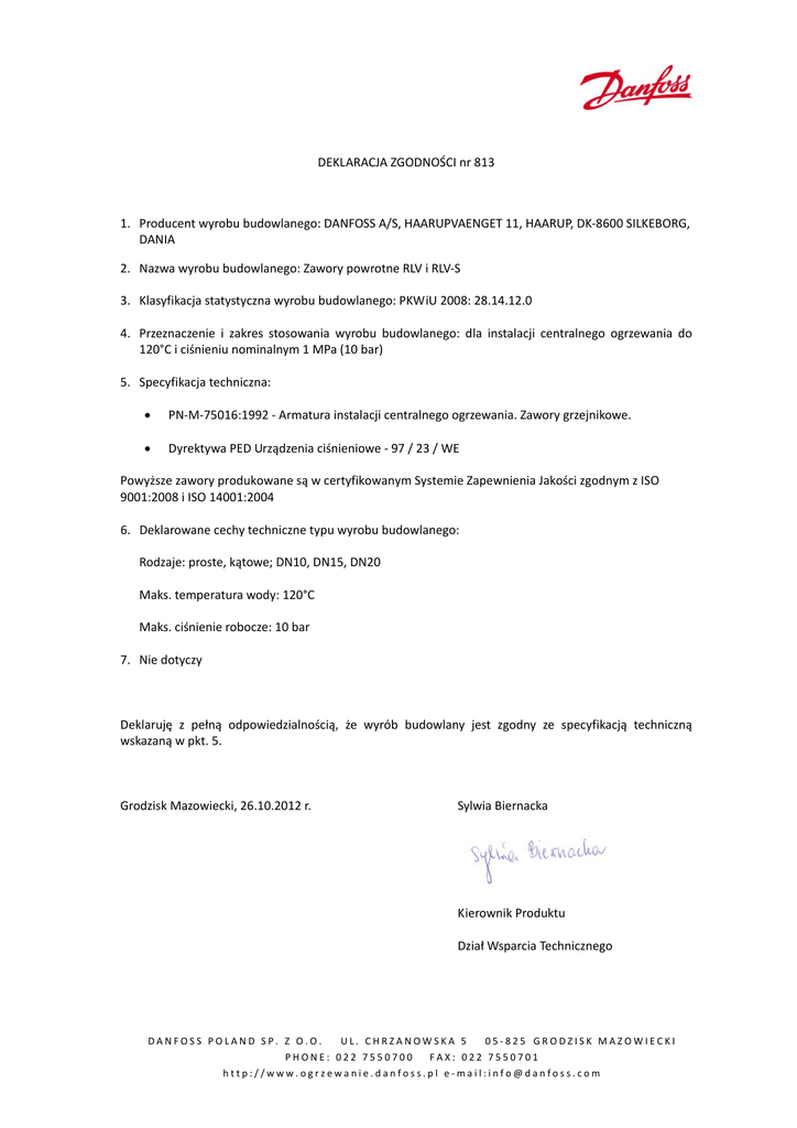 DEKLARACJA ZGODNOŚCI nr 813 1. Producent wyrobu budowlanego: DANFOSS A/S, HAARUPVAENGET 11, HAARUP, DK‐8600 SILKEBORG, DANIA 2. Nazwa wyrobu budowlanego: Zawory powrotne RLV i RLV‐S 3. Klasyfikacja statystyczna wyrobu budowlanego: PKWiU 2008: 28.14.12.0 4. Przeznaczenie i zakres stosowania wyrobu budowlanego: dla instalacji centralnego ogrzewania do 120°C i ciśnieniu nominalnym 1 MPa (10 bar) 5. Specyfikacja techniczna: PN‐M‐75016:1992 ‐ Armatura instalacji centralnego ogrzewania. Zawory grzejnikowe. Dyrektywa PED Urządzenia ciśnieniowe ‐ 97 / 23 / WE Powyższe zawory produkowane są w certyfikowanym Systemie Zapewnienia Jakości zgodnym z ISO 9001:2008 i ISO 14001:2004 6. Deklarowane cechy techniczne typu wyrobu budowlanego: Rodzaje: proste, kątowe; DN10, DN15, DN20 Maks. temperatura wody: 120°C Maks. ciśnienie robocze: 10 bar 7. Nie dotyczy Deklaruję z pełną odpowiedzialnością, że wyrób budowlany jest zgodny ze specyfikacją techniczną wskazaną w pkt. 5. Grodzisk Mazowiecki, 26.10.2012 r. Sylwia Biernacka Kierownik Produktu Dział Wsparcia Technicznego DANFOSS POLAND SP. Z O.O. UL. CHRZANOWSKA 5 PHONE: 022 7550700 05‐825 GRODZISK MAZOWIECKI FAX: 022 7550701 http://www.ogrzewanie.danfoss.pl e‐mail:[email protected]