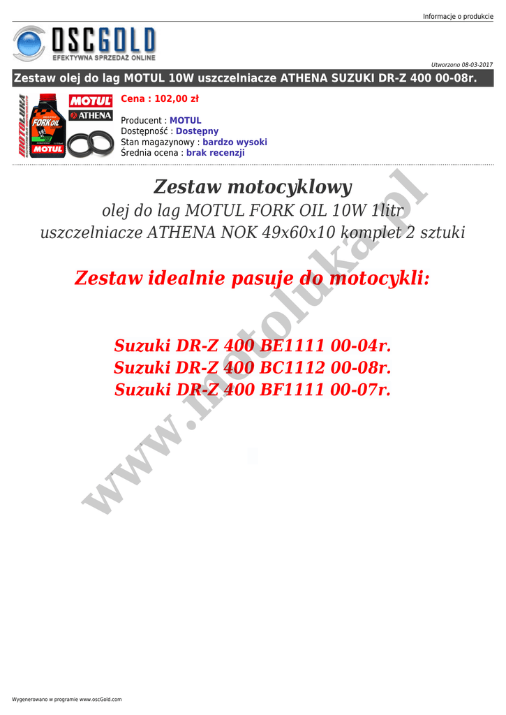 Informacje o produkcie Utworzono 08-03-2017 Zestaw olej do lag MOTUL 10W uszczelniacze ATHENA SUZUKI DR-Z 400 00-08r. Cena : 102,00 zł Producent : MOTUL Dostępność : Dostępny Stan magazynowy : bardzo wysoki Średnia ocena : brak recenzji a. pl Zestaw motocyklowy uk olej do lag MOTUL FORK OIL 10W 1litr uszczelniacze ATHENA NOK 49x60x10 komplet 2 sztuki ol Zestaw idealnie pasuje do motocykli: w w w .m ot Suzuki DR-Z 400 BE1111 00-04r. Suzuki DR-Z 400 BC1112 00-08r. Suzuki DR-Z 400 BF1111 00-07r. Wygenerowano w programie www.oscGold.com a. pl uk w w w .m ot ol Jeśli potrzebujesz innej lepkości oleju: wybierz 5W, 15W lub 20W i zaznacz w informacji przy zakupie.