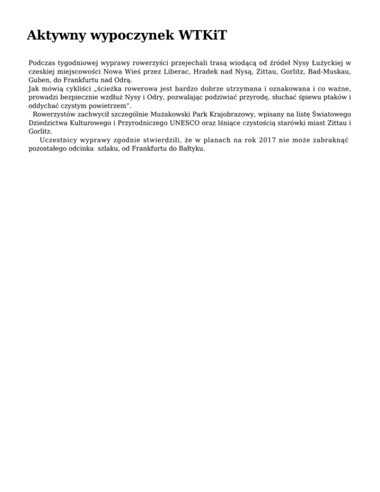 Aktywny wypoczynek WTKiT Podczas tygodniowej wyprawy rowerzyści przejechali trasą wiodącą od źródeł Nysy Łużyckiej w czeskiej miejscowości Nowa Wieś przez Liberac, Hradek nad Nysą, Zittau, Gorlitz, Bad-Muskau, Guben, do Frankfurtu nad Odrą. Jak mówią cykliści „ścieżka rowerowa jest bardzo dobrze utrzymana i oznakowana i co ważne, prowadzi bezpiecznie wzdłuż Nysy i Odry, pozwalając podziwiać przyrodę, słuchać śpiewu ptaków i oddychać czystym powietrzem”. Rowerzystów zachwycił szczególnie Mużakowski Park Krajobrazowy, wpisany na listę Światowego Dziedzictwa Kulturowego i Przyrodniczego UNESCO oraz lśniące czystością starówki miast Zittau i Gorlitz. Uczestnicy wyprawy zgodnie stwierdzili, że w planach na rok 2017 nie może zabraknąć pozostałego odcinka szlaku, od Frankfurtu do Bałtyku.
