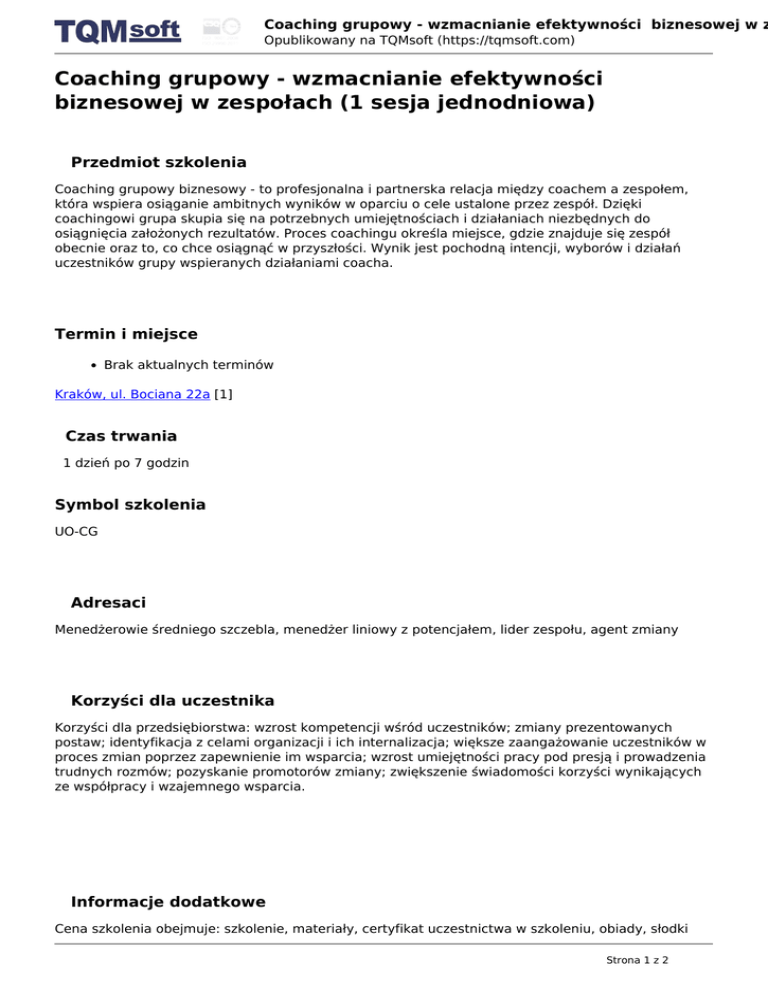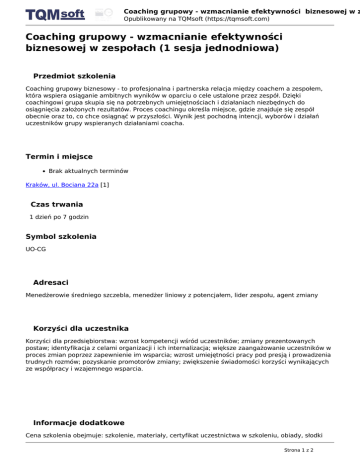 Coaching grupowy - wzmacnianie efektywności biznesowej w z Opublikowany na TQMsoft (https://tqmsoft.com) Coaching grupowy - wzmacnianie efektywności biznesowej w zespołach (1 sesja jednodniowa) Przedmiot szkolenia Coaching grupowy biznesowy - to profesjonalna i partnerska relacja między coachem a zespołem, która wspiera osiąganie ambitnych wyników w oparciu o cele ustalone przez zespół. Dzięki coachingowi grupa skupia się na potrzebnych umiejętnościach i działaniach niezbędnych do osiągnięcia założonych rezultatów. Proces coachingu określa miejsce, gdzie znajduje się zespół obecnie oraz to, co chce osiągnąć w przyszłości. Wynik jest pochodną intencji, wyborów i działań uczestników grupy wspieranych działaniami coacha. Termin i miejsce Brak aktualnych terminów Kraków, ul. Bociana 22a [1] Czas trwania 1 dzień po 7 godzin Symbol szkolenia UO-CG Adresaci Menedżerowie średniego szczebla, menedżer liniowy z potencjałem, lider zespołu, agent zmiany Korzyści dla uczestnika Korzyści dla przedsiębiorstwa: wzrost kompetencji wśród uczestników; zmiany prezentowanych postaw; identyfikacja z celami organizacji i ich internalizacja; większe zaangażowanie uczestników w proces zmian poprzez zapewnienie im wsparcia; wzrost umiejętności pracy pod presją i prowadzenia trudnych rozmów; pozyskanie promotorów zmiany; zwiększenie świadomości korzyści wynikających ze współpracy i wzajemnego wsparcia. Informacje dodatkowe Cena szkolenia obejmuje: szkolenie, materiały, certyfikat uczestnictwa w szkoleniu, obiady, słodki Strona 1 z 2 Coaching grupowy - wzmacnianie efektywności biznesowej w z Opublikowany na TQMsoft (https://tqmsoft.com) poczęstunek, możliwość bezpłatnych, krótkich konsultacji do 3 miesięcy po szkoleniu, pomoc w rezerwacji hotelu oraz bezpłatny dostęp do elektronicznych materiałów szkoleniowych w systemie Biblioteka TQMsoft. Drukuj [2] Pdf [3] Wyślij e-mail [4] Share [5] Share [6] Tweet [7] Share [8] Źródłowy URL: https://tqmsoft.com/pl/szkolenia/coaching-grupowy-wzmacnianie-efektywnoscibiznesowej-w-zespolach-1-sesja-jednodniowa Odnośniki [1] https://www.google.pl/maps/search/Kraków, ul. Bociana 22a [2] https://tqmsoft.com/print/11750 [3] https://tqmsoft.com/printpdf/11750 [4] mailto:?body=https%3A%2F%2Ftqmsoft.com%2Fpl%2Fprintpdf%2F11750 [5] https://www.linkedin.com/shareArticle?mini=true&source=TQMsoft.com&url=https%3A%2F%2Ft qmsoft.com%2Fpl%2Fprintpdf%2F11750 [6] https://www.facebook.com/sharer/sharer.php?u=https%3A%2F%2Ftqmsoft.com%2Fpl%2Fprintpd f%2F11750 [7] https://twitter.com/home?status=https%3A%2F%2Ftqmsoft.com%2Fpl%2Fprintpdf%2F11750 [8] https://plus.google.com/share?url=https%3A%2F%2Ftqmsoft.com%2Fpl%2Fprintpdf%2F11750 Strona 2 z 2