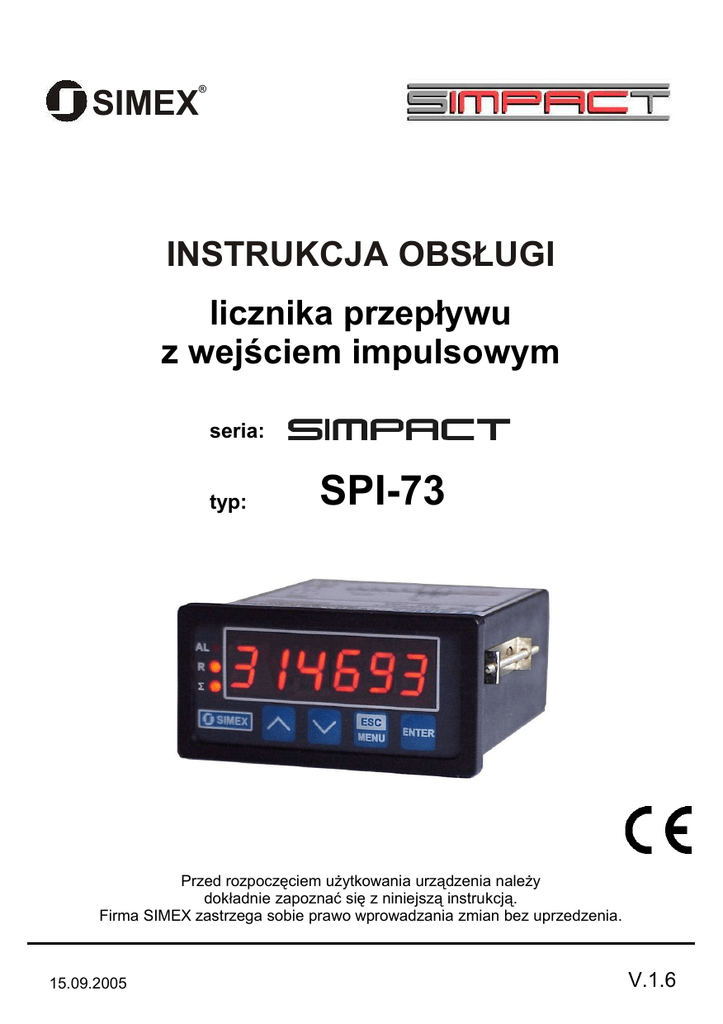 ® SIMEX INSTRUKCJA OBSŁUGI licznika przepływu z wejściem impulsowym seria: typ: SPI-73 Przed rozpoczęciem użytkowania urządzenia należy dokładnie zapoznać się z niniejszą instrukcją. Firma SIMEX zastrzega sobie prawo wprowadzania zmian bez uprzedzenia. 15.09.2005 V.1.6 Instrukcja obsługi licznika przepływu z wejściem impulsowym SPI-73 SPIS TREŚCI 1. PODSTAWOWE WYMAGANIA I BEZPIECZEŃSTWO UŻYTKOWANIA.................................................3 2. CHARAKTERYSTYKA OGÓLNA...............................................................................................................4 3. DANE TECHNICZNE...................................................................................................................................5 4. INSTALACJA URZĄDZENIA......................................................................................................................6 4.1. ROZPAKOWANIE..............................................................................................................................6 4.2. MONTAŻ.............................................................................................................................................7 4.3. SPOSÓB PODŁĄCZENIA..................................................................................................................8 4.4. KONSERWACJA..............................................................................................................................11 5. OPIS PŁYTY CZOŁOWEJ........................................................................................................................12 6. ZASADA DZIAŁANIA................................................................................................................................12 6.1. TRYB POMIAROWY........................................................................................................................12 6.2. REGULACJA....................................................................................................................................14 7. PROGRAMOWANIE URZĄDZENIA.........................................................................................................16 7.1. EDYCJA PARAMETRÓW................................................................................................................17 7.1.1. Parametry numeryczne...........................................................................................................17 7.1.2. Parametry przełącznikowe (typu “LISTA”)..............................................................................17 7.2. OPIS MENU......................................................................................................................................17 7.2.1. Menu “rELAy”..........................................................................................................................17 7.2.2. Menu “inPut”............................................................................................................................19 7.2.3. Menu “Flouu”...........................................................................................................................20 7.2.4. Menu “totAL”............................................................................................................................21 7.2.5. Menu ”SECu”...........................................................................................................................21 7.2.6. Menu “rS-485”.........................................................................................................................22 7.2.7. Menu “SErv”............................................................................................................................22 7.3. STRUKTURA MENU........................................................................................................................23 8. OBSŁUGA PROTOKOŁU MODBUS........................................................................................................24 8.1. ODCZYT STATUSU POMIARU.......................................................................................................24 8.2. WYKAZ REJESTRÓW.....................................................................................................................24 8.3. OBSŁUGA BŁĘDÓW TRANSMISJI.................................................................................................26 8.4. PRZYKŁADY RAMEK ZAPYTAŃ /ODPOWIEDZI...........................................................................27 9. LISTA USTAWIEŃ UŻYTKOWNIKA........................................................................................................29 Znaczenie symboli używanych w instrukcji: - symbol ten zwraca uwagę na szczególnie istotne wskazówki dotyczące instalacji oraz obsługi urządzenia. Nie stosowanie się do uwag oznaczonych tym symbolem może być przyczyną wypadku, uszkodzenia lub zniszczenia urządzenia. W PRZYPADKU UŻYTKOWANIA URZĄDZENIA NIEZGODNIE Z INSTRUKCJĄ ODPOWIEDZIALNOŚĆ ZA POWSTAŁE SZKODY PONOSI UŻYTKOWNIK - symbol ten zwraca uwagę na szczególnie istotne opisy dotyczące właściwości urządzenia. Zalecne jest dokładne zapoznanie się z uwagami oznaczonymi tym symbolem. 2 Instrukcja obsługi licznika przepływu z wejściem impulsowym SPI-73 1. PODSTAWOWE WYMAGANIA I BEZPIECZEŃSTWO UŻYTKOWANIA Producent nie ponosi odpowiedzialności za szkody wynikłe z niewłaściwego zainstalowania, nieutrzymywania we właściwym stanie technicznym oraz użytkowania urządzenia niezgodnie z jego przeznaczeniem. - Instalacja powinna być przeprowadzona przez wykwalifikowany personel posiadający uprawnienia wymagane do instalacji urządzeń elektrycznych. Podczas instalacji należy uwzględnić wszystkie dostępne wymogi ochrony. Na instalatorze spoczywa obowiązek wykonania instalacji zgodnie z niniejszą instrukcją oraz przepisami i nor