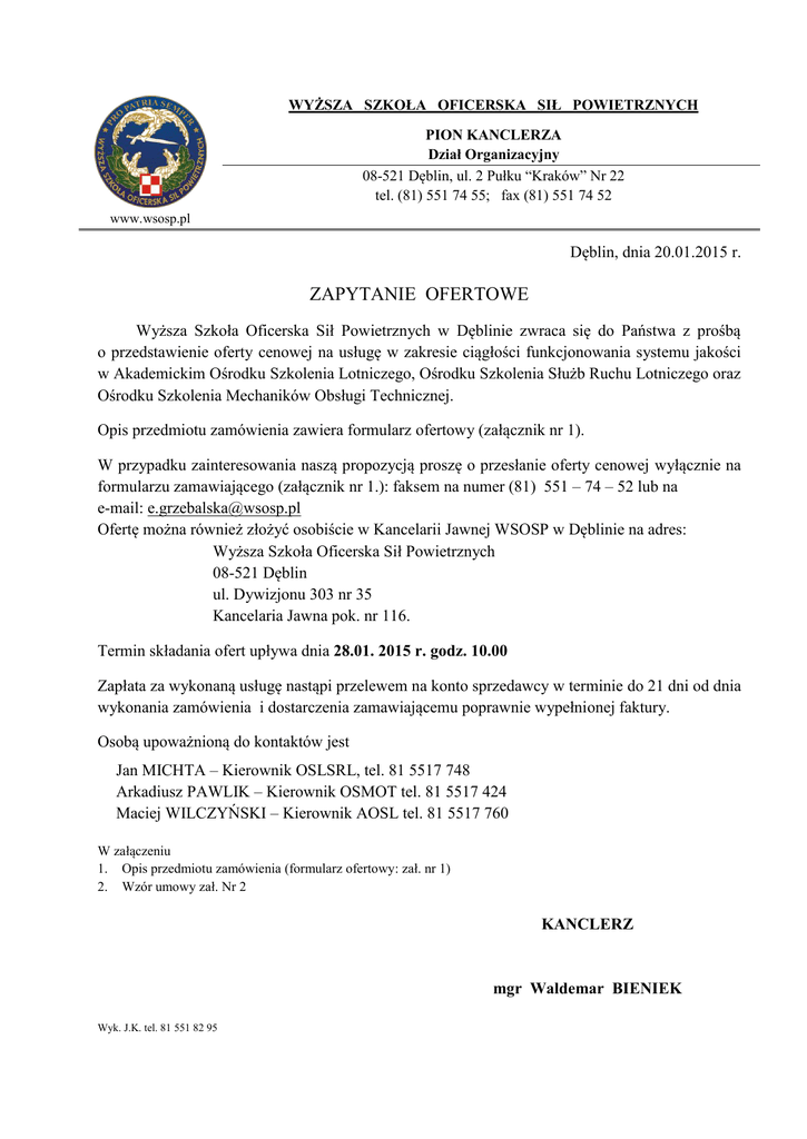 WYŻSZA SZKOŁA OFICERSKA SIŁ POWIETRZNYCH PION KANCLERZA Dział Organizacyjny 08-521 Dęblin, ul. 2 Pułku “Kraków” Nr 22 tel. (81) 551 74 55; fax (81) 551 74 52 www.wsosp.pl Dęblin, dnia 20.01.2015 r. ZAPYTANIE OFERTOWE Wyższa Szkoła Oficerska Sił Powietrznych w Dęblinie zwraca się do Państwa z prośbą o przedstawienie oferty cenowej na usługę w zakresie ciągłości funkcjonowania systemu jakości w Akademickim Ośrodku Szkolenia Lotniczego, Ośrodku Szkolenia Służb Ruchu Lotniczego oraz Ośrodku Szkolenia Mechaników Obsługi Technicznej. Opis przedmiotu zamówienia zawiera formularz ofertowy (załącznik nr 1). W przypadku zainteresowania naszą propozycją proszę o przesłanie oferty cenowej wyłącznie na formularzu zamawiającego (załącznik nr 1.): faksem na numer (81) 551 – 74 – 52 lub na e-mail: [email protected] Ofertę można również złożyć osobiście w Kancelarii Jawnej WSOSP w Dęblinie na adres: Wyższa Szkoła Oficerska Sił Powietrznych 08-521 Dęblin ul. Dywizjonu 303 nr 35 Kancelaria Jawna pok. nr 116. Termin składania ofert upływa dnia 28.01. 2015 r. godz. 10.00 Zapłata za wykonaną usługę nastąpi przelewem na konto sprzedawcy w terminie do 21 dni od dnia wykonania zamówienia i dostarczenia zamawiającemu poprawnie wypełnionej faktury. Osobą upoważnioną do kontaktów jest Jan MICHTA – Kierownik OSLSRL, tel. 81 5517 748 Arkadiusz PAWLIK – Kierownik OSMOT tel. 81 5517 424 Maciej WILCZYŃSKI – Kierownik AOSL tel. 81 5517 760 W załączeniu 1. Opis przedmiotu zamówienia (formularz ofertowy: zał. nr 1) 2. Wzór umowy zał. Nr 2 KANCLERZ mgr Waldemar BIENIEK Wyk. J.K. tel. 81 551 82 95 Załącznik nr 1 FORMULARZ OFERTOWY W odpowiedzi na zapytanie składamy ofertę. Szczegółowy opis przedmiotu zamówienia Przedmiotem zamówienia jest: A. W zakresie zapewnienia w 2015 r. ciągłości funkcjonowania systemu jakości w Ośrodku Szkolenia Personelu Służb Ruchu Lotniczego: 1. Zapewnienie funkcjonowania systemu jakości zgodnie z Instrukcją Systemu Jakości oraz Instrukcją Szkolenia obowiązującą w CAPTO WSOSP. 2. Przeprowadzenie auditów wewnętrznych systemu zarządzania jakością zgodnie z przepisami ESARR-5 i krajowymi przepisami lotniczymi dotyczącymi licencjonowania personelu lotniczego. 3. Przeprowadzenie szkolenia z zakresu wymagań systemu zarządzania jakością określonych w procedurach wewnętrznych Ośrodka Szkolenia Personelu Służb Ruchu Lotniczego. 4. Opracowanie celów jakościowych Ośrodka Szkolenia Personelu Służb Ruchu Lotniczego na rok 2015. 5. Udział w dwóch konferencjach poświęconych ocenie systemu zarządzania oraz przygotowania pisemnych sprawozdań z przeglądów systemu zarządzania. 6. Udział w auditach/inspekcjach nadzoru, prowadzonych przez władze lotnicze (Urząd Lotnictwa Cywilnego – ULC; Europejska Agencja Bezpieczeństwa Lotniczego – EASA). B. W zakresie zapewnienia w 2015 r. ciągłości funkcjonowania systemu jakości w Ośrodku Szkolenia Mechaników Obsługi Technicznej: 1. Przeprowadzenie auditów wewnętrznych systemu zarządzania jakością zgodnie z przepisami PART 147. 2. Przeprowadzenie szkolenia z zakresu wymagań systemu zarządzania jakością określonych w przepisach PART 147 oraz w procedurach wewnętrznych Ośrodka Szkolenia Mechaników Obsługi Technicznej. 3. Opracowanie celów jakościowych Ośrodka Szkolenia Mechaników Obsługi Technicznej na rok 2015. 4. Przygotowanie pisemnych sprawozdań z przeglądów systemu zarządzania. 5. Udział w auditach/inspekcjach nadzoru, prowadzonych przez władze lotnicze (Urząd Lotnictwa Cywilnego – ULC; Europejska Agencja Bezpieczeństwa Lotniczego – EASA). C. W zakresie zapewnienia w 2015 r. ciągłości funkcjonowania systemów jakości, zarządzania i monitorowania zgodności w Akademickim Ośrodku Szkolenia Lotniczego: 1. Przeprowadzenie auditów wewnętrznych systemów zarządzania, zarządzania jakością oraz monitorowania zgodności zgodnie z przepisami JAR-FCL 1/2, PART-FCL, PART-ORA, CSFSTD A/H, JAR-FSTD A/H. 2. Przeprowadzenie szkolenia z zakresu wymagań systemu zarządzania jakością określonych w przepisach JAR-FCL 1/2, PART-FCL, PART-ORA, CS-FSTD A/H, JAR-FSTD A/H oraz procedurach wewnętrznych Akademickiego Ośrodka Szkolenia Lotniczego. 3. Opracowanie celów jakościowych Akademickiego Ośrodka Szkolenia Lotniczego na rok 2015. 4. Opracowanie systemów zarządzania oraz monitorowania zgodności ośrodka. 5. Udział w dwóch konferencjach poświęconych ocenie systemu zarządzania oraz przygotowania pisemnych sprawozdań z przeglądów systemu zarządzania. 6. Udział w auditach/inspekcjach nadzoru, prowadzonych przez władze lotnicze (Urząd Lotnictwa Cywilnego – ULC; Europejska Agencja Bezpieczeństwa Lotniczego – EASA). Termin realizacji: od dnia podpisania umowy do dnia 31.12.2015 r. Cena netto: …………………………. Vat % ……… Cena brutto: …………………………… Wszystkie koszty poniesione w związku z wykonaniem przedmiotu zamówienia wliczone w cenę usługi. Termin płatności: płatność w ciągu 21 dni od daty otrzymania faktury. Zobowiązuję się wykonać usługę zgodnie z umową i/lub formularzem ofertowym. ……………………………….…… Miejscowość , data …………………………….. Wykonawca