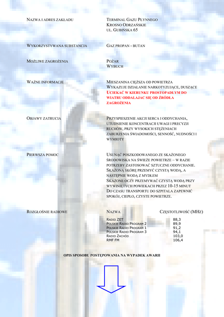 NAZWA I ADRES ZAKŁADU TERMINAL GAZU PŁYNNEGO KROSNO ODRZAŃSKIE UL. GUBIŃSKA 65 WYKORZYSTYWANA SUBSTANCJA GAZ PROPAN - BUTAN MOŻLIWE ZAGROŻENIA POŻAR WYBUCH WAŻNE INFORMACJE MIESZANINA CIĘŻSZA OD POWIETRZA WYKAZUJE DZIAŁANIE NARKOTYZUJĄCE, DUSZĄCE UCIEKAĆ W KIERUNKU PROSTOPADŁYM DO WIATRU ODDALAJAC SIĘ OD ŹRÓDŁA ZAGROŻENIA OBJAWY ZATRUCIA PRZYSPIESZENIE AKCJI SERCA I ODDYCHANIA, UTUDNIENIE KONCENTRACJI UWAGI I PRECYZJI RUCHÓW, PRZY WYSOKICH STĘŻENIACH ZABURZENIA ŚWIADOMOŚCI, SENNOŚĆ, NUDNOŚCI I WYMIOTY PIERWSZA POMOC USUNĄĆ POSZKODOWANEGO ZE SKAŻONEGO ŚRODOWISKA NA ŚWIEŻE POWIETRZE – W RAZIE POTRZEBY ZASTOSOWAĆ SZTUCZNE ODDYCHANIE. SKAŻONĄ SKÓRĘ PRZEMYĆ CZYSTĄ WODĄ, A NASTĘPNIE WODĄ Z MYDŁEM SKAŻONE OCZY PRZEMYWAĆ CZYSTĄ WODĄ PRZY WYWINIĘTYCH POWIEKACH PRZEZ 10-15 MINUT DO CZASU TRANSPORTU DO SZPITALA ZAPEWNIĆ SPOKÓJ, CIEPŁO, CZYSTE POWIETRZE. ROZGŁOŚNIE RADIOWE NAZWA CZĘSTOTLIWOŚĆ (MHZ) RADIO ZET POLSKIE RADIO PROGRAM 2 POLSKIE RADIO PROGRAM 1 POLSKIE RADIO PROGRAM 3 RADIO ZACHÓD RMF FM OPIS SPOSOBU POSTĘPOWANIA NA WYPADEK AWARII 88,3 89,9 91,2 94,1 103,0 106,4 Gdy usłyszysz syren wycie By ratować swoje życie Do tych rad zastosuj się należycie: - ZAMKNIJ OKNO, DRZWI I BALKON, - WŁĄCZ W MIG ULUBIONE RADIO, - WŁĄCZ I KANAŁ TELEWIZJI, GDZIE INFORMACJE BIEŻĄCE SĄ NA WIZJI, - ZAMIAST NA STRAŻ CZY POLICJĘ DZWONIĆ, SWĄ RODZINĘ I ZNAJOMYCH SPRÓBUJ POWIADOMIĆ BY NIE TERAZ, NIE W TEJ CHWILI CI ODWIEDZIN NIE CZYNILI, -KOMUNIKATÓW PRZEZ MEGAFON NADAWANYCH POTRZEBA NASŁUCHIWAĆ BYŚ WIEDZIAŁ, W RAZIE KONIECZNOŚCI, DOKĄD ZMYKAĆ, GDZIE AUTOBUS SĄSIADOM I TOBIE PODSTAWIĄ, DOKĄD ZAWIOZĄ I GDZIE NA NOC ZOSTAWIĄ. CZY ZABRAĆ TELEFON I DOKUMENTY MASZ ZE SOBĄ, CZY MOŻE RÓWNIEŻ TERMOS Z CIEPŁĄ WODĄ. A MOŻE USŁYSZYSZ, PRAWDOPODOBNE TO WIELCE, ŻE W DOMU MASZ POZOSTAĆ, NP. W ŁAZIENCE, LUB INNYM POMIESZCZENIU, PORZĄDNIE USZCZELNIONYM BY TOKSYCZNYM DYMEM NIE BYĆ PODRAŻNIONYM. A GDY JUŻ W LOKUM ZOSTANIESZ OWYM, PAMIĘTAJ CIĄGLE O RADIO SWOIM, BO PRZECIEŻ DOWIESZ SIĘ NA PEWNO Z NIEGO KIEDY NIEBEZPIECZEŃSTWO MINĘŁO.