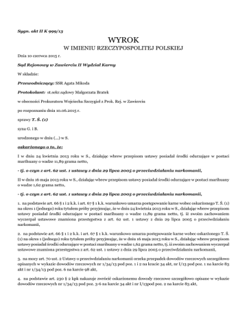 Sygn. akt II K 999/13 WYROK W IMIENIU RZECZYPOSPOLITEJ POLSKIEJ Dnia 10 czerwca 2015 r. Sąd Rejonowy w Zawierciu II Wydział Karny W składzie: Przewodniczący: SSR Agata Mikoda Protokolant: st.sekr.sądowy Małgorzata Bratek w obecności Prokuratora Wojciecha Szczygieł z Prok. Rej. w Zawierciu po rozpoznaniu dnia 10.06.2015 r. sprawy T. Ś. (1) syna G. i B. urodzonego w dniu (...) w S. oskarżonego o to, że: I w dniu 24 kwietnia 2013 roku w S., działając wbrew przepisom ustawy posiadał środki odurzające w postaci marihuany o wadze 11,89 grama netto, - tj. o czyn z art. 62 ust. 1 ustawy z dnia 29 lipca 2005 o przeciwdziałaniu narkomanii, II w dniu 16 maja 2013 roku w S., działając wbrew przepisom ustawy posiadał środki odurzające w postaci marihuany o wadze 1,62 grama netto, - tj. o czyn z art. 62 ust. 1 ustawy z dnia 29 lipca 2005 o przeciwdziałaniu narkomanii, 1. na podstawie art. 66 § 1 i 2 k.k. i art. 67 § 1 k.k. warunkowo umarza postępowanie karne wobec oskarżonego T. Ś. (1) na okres 1 (jednego) roku tytułem próby przyjmując, że w dniu 24 kwietnia 2013 roku w S., działając wbrew przepisom ustawy posiadał środki odurzające w postaci marihuany o wadze 11,89 grama netto, tj. iż swoim zachowaniem wyczerpał ustawowe znamiona przestępstwa z art. 62 ust. 1 ustawy z dnia 29 lipca 2005 o przeciwdziałaniu narkomanii, 2. na podstawie art. 66 § 1 i 2 k.k. i art. 67 § 1 k.k. warunkowo umarza postępowanie karne wobec oskarżonego T. Ś. (1) na okres 1 (jednego) roku tytułem próby przyjmując, że w dniu 16 maja 2013 roku w S., działając wbrew przepisom ustawy posiadał środki odurzające w postaci marihuany o wadze 1,62 grama netto, tj. iż swoim zachowaniem wyczerpał ustawowe znamiona przestępstwa z art. 62 ust. 1 ustawy z dnia 29 lipca 2005 o przeciwdziałaniu narkomanii, 3. na mocy art. 70 ust. 2 Ustawy o przeciwdziałaniu narkomanii orzeka przepadek dowodów rzeczowych szczegółowo opisanych w wykazie dowodów rzeczowych nr 1/34/13 pod poz. 1 i 2 na kracie 34 akt, nr I/13 pod poz. 1 na karcie 83 akt i nr 1/34/13 pod poz. 6 na karcie 98 akt, 4. na podstawie art. 230 § 2 kpk nakazuje zwrócić oskarżonemu dowody rzeczowe szczegółowo opisane w wykazie dowodów rzeczowych nr 1/34/13 pod poz. 3-6 na karcie 34 akt i nr I/13pod poz. 2 na karcie 83 akt, 5. na podstawie art. 627 k.p.k. w zw. z art. 629 kpk i art. 7 ustawy z dnia 23 czerwca 1973r. o opłatach w sprawach karnych zasądza od oskarżonego na rzecz Skarbu Państwa wydatki postępowania w kwocie 936, 36 (dziewięćset trzydzieści sześć 36/100) złotych oraz opłatę sądową w wysokości 60 (sześćdziesiąt) złotych. UZASADNIENIE W dniu 24.04.2013r. około godziny 18.45 funkcjonariusze policji w trakcie kontroli parkingu przy torowisku w rejonie ul. (...) w S. zauważyli pojazd marki S. (...) o nr rej. (...), który na ich widok gwałtownie ruszył drogą gruntową w głąb masywu leśnego. Pojazd kierowany przez oskarżonego T. Ś. (1) został zatrzymany, w pojeździe znajdowały się środki odurzające w postaci marihuany o wadze 11,89 grama netto (dowód: notatka urzędowa k: 1, protokół przeszukania samochodu k: 5-7, protokół oględzin k: 18-19, zeznania M.W. k: 15, P. K. k: 17, wyjaśnienia T. Ś. k:166). Oskarżony został przeszukany i zatrzymany (dowód: protokół zatrzymania osoby k: 2, protokół przeszukania osoby k: 3-4). W dniu 16.05.2013r. około godziny 20.40 w M. na ulicy (...) funkcjonariusze policji zatrzymali do kontroli drogowej samochód S. (...) nr rej. (...), którym kierował oskarżony T. Ś. (1). W samochodzie ujawniono środki odurzające w postaci marihuany o wadze 1,62 grama netto (dowód: notatka urzędowa k: 65, protokół zatrzymania osoby k: 66, protokół przeszukania osoby k: 67-68, protokół przeszukania pojazdu k: 69-71, protokół oględzin k: 75-77, zeznania P. K. k: 73, wyjaśnienia T. Ś. k:166). Biegli z Laboratorium Kryminalistycznego w K. ustalili że znaleziony dwa razy materiał roślinny to ziele konopi innych niż włókniste, tzn. że jest to środek odurzający w rozumieniu Ustawy o przeciwdziałaniu narkomanii (dowód: opinie k: 95,97). Oskarżony T. Ś. (1) (k: 27-28,107-108,166-167) na etapie postępowania przygotowawczego nie przyznał się do popełnienia zarzucanych mu czynów i odmówił złożenia wyjaśnień. Na rozprawie przyznał się do popełnienia zarzucanych mu czynów i wyjaśnił, że posiadał marihuanę na własny użytek, była wyłącznie dla niego, żałuje tego, nie ma już problemu z marihuaną. Wcześniej nie przyznawał się bo bał się konsekwencji, które nie wiedział jakie mogą być. Po raz drugi miał marihuanę, ale wówczas miał problem, był uzależniony, było to spowodowane stresem. Od tych zdarzeń nie używa już narkotyków. Analizując całokształt zebranego w sprawie materiału dowodowego Sąd dał wiarę wyjaśnieniom oskarżonego przyznającego się do winy. Sąd za zgodą stron na rozprawie w dniu 10.06.2015r. (k: 167) odczytał zeznania świadków P. K. (2) (k: 17,72-74) i M. W. (k: 15-16), uznając iż bezpośrednie przesłuchanie świadków nie jest niezbędne, bowiem zeznają na okoliczności nie kwestionowane przez oskarżonego i na podstawie także zeznań tych świadków poczynił ustalenia faktyczne w sprawie. W tym stanie rzeczy analizując całokształt zebranego w sprawie materiału dowodowego Sąd uznał, iż okoliczności czynów zostały wyjaśnione i nie budzą żadnych wątpliwości, a wina oskarżonego została udowodniona natomiast nie zachodzą żadne okoliczności, które by tę winę wyłączały, a tym samym nie zachodzą przesłanki wyłączające odpowiedzialność karną. Oskarżony T. Ś. (1) w dniu 24 kwietnia 2013r. w S., działając wbrew przepisom ustawy posiadał środki odurzające w postaci marihuany o wadze 11,89 grama netto, zaś w dniu 16 maja 2013r. w S., działając wbrew przepisom ustawy posiadał środki odurzające w postaci marihuany o wadze 1,