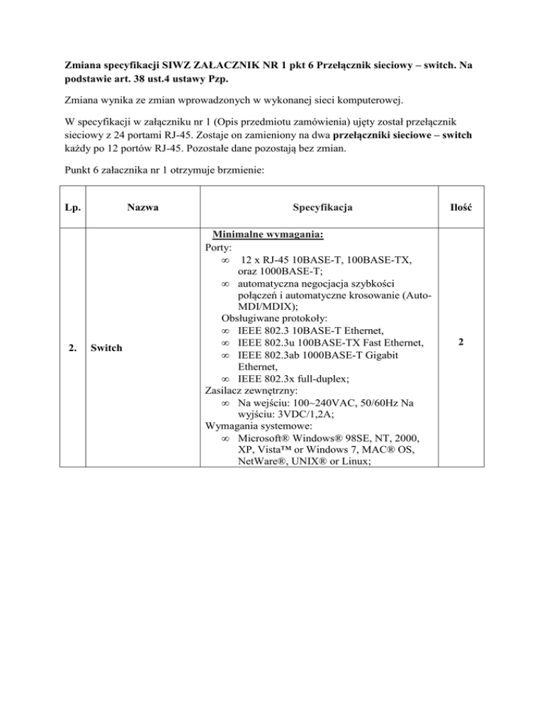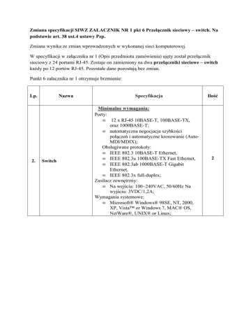 Zmiana specyfikacji SIWZ ZAŁACZNIK NR 1 pkt 6 Przełącznik sieciowy – switch. Na podstawie art. 38 ust.4 ustawy Pzp. Zmiana wynika ze zmian wprowadzonych w wykonanej sieci komputerowej. W specyfikacji w załączniku nr 1 (Opis przedmiotu zamówienia) ujęty został przełącznik sieciowy z 24 portami RJ-45. Zostaje on zamieniony na dwa przełączniki sieciowe – switch każdy po 12 portów RJ-45. Pozostałe dane pozostają bez zmian. Punkt 6 załacznika nr 1 otrzymuje brzmienie: Lp. 2. Nazwa Switch Specyfikacja Minimalne wymagania: Porty: • 12 x RJ-45 10BASE-T, 100BASE-TX, oraz 1000BASE-T; • automatyczna negocjacja szybkości połączeń i automatyczne krosowanie (AutoMDI/MDIX); Obsługiwane protokoły: • IEEE 802.3 10BASE-T Ethernet, • IEEE 802.3u 100BASE-TX Fast Ethernet, • IEEE 802.3ab 1000BASE-T Gigabit Ethernet, • IEEE 802.3x full-duplex; Zasilacz zewnętrzny: • Na wejściu: 100~240VAC, 50/60Hz Na wyjściu: 3VDC/1,2A; Wymagania systemowe: • Microsoft® Windows® 98SE, NT, 2000, XP, Vista™ or Windows 7, MAC® OS, NetWare®, UNIX® or Linux; Ilość 2