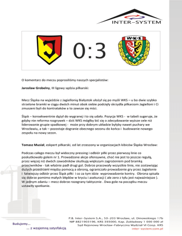 O komentarz do meczu poprosiliśmy naszych specjalistów: Jarosław Grobelny, III ligowy sędzia piłkarski: Mecz Śląska na wyjeździe z Jagiellonią Białystok ułożył się po myśli WKS – u bo dwie szybko strzelone bramki w ciągu dwóch minut obok siebie podcięły skrzydła piłkarzom Jagielloni i Ci zmuszeni byli do kontrataków a to zawsze się mści. Śląsk – konsekwentnie dążył do wygranej i to się udało. Pozycja WKS - w tabeli sugeruje, że gdyby nie reforma rozgrywek – dziś WKS mógłby bić się o zdecydowanie wyższe cele niż liderowanie grupie spadkowej - może przy dobrym układzie byłyby nawet puchary we Wrocławiu, a tak – pozostaje dogranie obecnego sezonu do końca i budowanie nowego zespołu na nowy sezon. Tomasz Musiał, eskpert piłkarski, od lat zrzeszony w organizacjach kibiców Śląska Wrocław: Podczas całego meczu był widoczny pressing i odbiór piłki przez pierwszą linie co poskutkowało golem nr 1. Prowadzone akcje ofensywne, choć nie jest to jeszcze regułą, przez więcej niż dwóch zawodników skutkują większym zagrożeniem pod bramką przeciwników - tak właśnie padł drugi gol. Dobrze pracowały wszystkie linie, nie zostawiając dużych przestrzeni między pomocą a obroną, ograniczało prowadzenie gry przez Jagielonie i łatwiejszy odbiór przez Śląsk piłki i co za tym idzie wyprowadzenie kontry. Obrona spisała się dobrze pomimo małych błędów w kryciu i asekuracji ( ale zero z tyłu jest najważniejsze ). W jednym zdaniu – mecz dobrze rozegrany taktycznie . Dwa gole na początku meczu ustawiły spotkanie.