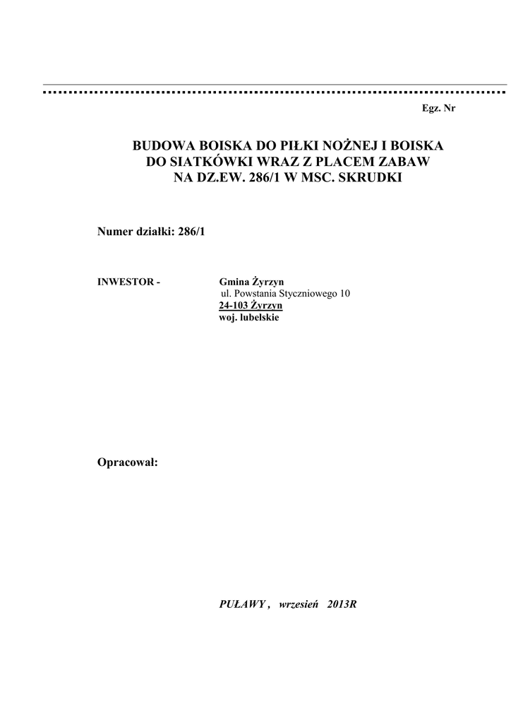 Egz. Nr BUDOWA BOISKA DO PIŁKI NOŻNEJ I BOISKA DO SIATKÓWKI WRAZ Z PLACEM ZABAW NA DZ.EW. 286/1 W MSC. SKRUDKI Numer działki: 286/1 INWESTOR - Gmina Żyrzyn ul. Powstania Styczniowego 10 24-103 Żyrzyn woj. lubelskie Opracował: PUŁAWY , wrzesień 2013R I. Specyfikacja techniczna wykonania i odbioru robót związanych z realizacją zadania: BUDOWA BOISKA DO PIŁKI NOŻNEJ I BOISKA DO SIATKÓWKI WRAZ Z PLACEM ZABAW NA DZ.EW. 286/1 W MSC. SKRUDKI II. Przedmiot SST Przedmiotem niniejszej szczegółowej specyfikacji technicznej są wymagania dotyczące wykonania i odbioru robót związanych z wykonaniem robót związanych z budową boiska do piłki nożnej i boiska do siatkówki wraz z placem zabaw na dz.ew. 286/1 w msc. Skrudki III. Zakres stosowania Szczegółowa specyfikacja techniczna stanowi dokument przetargowy przy zleceniu i realizacji robót związanych z realizacją zadania określonego w pkt. I IV. Zakres robót objętych SST Ustalenia zawarte w niniejszej dokumentacji dotyczą zasad prowadzenia robót związanych z budową boiska do piłki nożnej i boiska do siatkówki wraz z placem zabaw na dz.ew. 286/1 w msc. Skrudki Roboty te obejmują: 1. Wykonanie nawierzchni trawiastej boisk i placu zabaw zgodnie z dokumentacją projektową. 2. Dostawę i montaż bramek aluminiowych 5x2m do piłki nożnej. 3. Dostawę i montaż słupków ze stanowiskiem sędziowskim i siatką do gry do siatkówki. 4. Dostawę i montaż piłko chwytów za bramkami o wys. 5,0m. 5. Dostawę i montaż urządzeń placu zabaw. 6. Dostawę i montaż ławek i koszy na śmieci. V. MATERIAŁY Zastosowane materiały powinny być zgodne z dokumentacją techniczną, niżej przedstawionym opisem, oraz właściwymi normami: Urządzenie na plac zabaw typu KACPER Urządzenie przeznaczone jest dla dzieci w wieku od 36 miesięcy do 12 roku. W skład obiektu do zabawy wchodzą: 1. Pochylnia nr 1; wymiary: 1,04x0,99x0,56 m (długość x szerokość x wysokość). Pochylnia składa się z jedenastu desek mocowanych za pomocą metalowych wkrętów. Pochylnia nr 1 umożliwia wejście na belkę wiszącą. 2. Belka wisząca; wymiary: 2,11x0,77x0,50 m (dł x szer x wys). Belka mocowana jest na dziesięciu łańcuchach. 3. Pochylnia nr 2; wymiary: 1,17x1,00x0,37 m (dl x szer x wys). Pochylnia składa się z dwunastu półokraglaków mocowanych za pomocą metalowych wkrętów. Pochylnia nr 2 umożliwia wejście na podest nr 1. 4.Podest nr 1; wymiary: 0,99x0,75x0,51 m (dł x szer x wys). Podest składa się z jedenastu półokrąglaków mocowanych za pomocą metalowych wkrętów . Podest wyposażono w poręcz boczną zabezpieczającą przed wypadnięciem. Podest nr 1 umożliwia wejście na podest nr 2 lub belkę wiszącą. 5. Pochylnia nr 3;wymiary: 1,79x1,00x1,24 m ( dł x szer x wys). Podest składa się z dziewiętnastu półokrąglaków mocowanych za pomocą metalowych wkrętów. Pochylnia została wyposażona w środki antypoślizgowe w postaci wałków. Pochylnia nr 3 umożliwia wejście na most wiszący. 6. Drewniany most wiszący; wymiary: 1,87x1,00 m ( dł x szer). Most składa się z siedemnastu półokrąglaków mocowanych za pomocą czterech łańcuchów do poręczy bocznych. Most został wyposażony w cztery poręcze boczne zabezpieczające przed wypadnięciem. Most umożliwia przejście pomiędzy pochylnią nr 3, a podestem nr2. 7. Podest nr 2; wymiary: 0,99x1,00x0,89m (dł x szer x wys). Podest składa się z dziesięciu półokrąglaków mocowanych za pomocą metalowych wkrętów. Podest został wyposażony w osłonę z poręczą boczną zabezpieczającą przed wypadnięciem. Podest nr2 umożliwia przejście na podest nr 3, zejście na podest nr 1 oraz wejście na most wiszący. 8. Wieża, na którą składają się: Podest nr 3; wymiary: 1,00x1,00x1,25 m (dł x szer x wys). Podest składa się z dziesięciu półokrąglaków mocowanych za pomocą metalowych wkrętowych. Podest nr 3 wyposażony jest w dwie osłony boczne z poręczami zabezpieczające przed wypadnięciem. Daszek; umieszczony nad podestem nr 3 na wysokości 2,24 m. Daszek składa się z osiemnastu półokrąglaków mocowanych za pomocą wkrętów do czterech belek nośnych, przytwierdzonych na dwóch zielonych belkach poprzecznych. Wysokość szczytu daszka mierzona od podłoża wynosi 3,48 m. 9. Ścianka wspinaczkowa łańcuchowa; wymiary: 2,24x2,34 m (dł x wys). Ścianka mocowana jest na drewnianej ramie z belek o średnicy 0,12 m. 10. Dwustronna drewniana drabinka; wymiary: 1,96x1,03 m (dł x szer)- strona szersza, 0,77x2,12 m (dł x szer)- strona węższa. Drabinka składa się z dwunastu drewnianych szczebli mocowanych za pomocą wkretów oraz na wpust. Urządzenie musi być zakotwione na stałe do podłoża. Całość obiektu montujemy za pomocą metalowych kotew, zabetonowanych na głębokości 75 cm, drewno nie styka się bezpośrednio z gruntem i nie jest narażone na wilgoć pochodzącą z ziemi, co pozwala na uniknięcie butwienia i gnicia drewna. Karuzela krzyżowa: Wykonana z rury o średnicy 105 mm, wysokości 0,45 m, krzyżak osadzony na łożysku wykonany z rury o średnicy 80 mm i długości ramion 1,80 m. Siedziska gumowane z poręczami. Elementy metalowe malowane proszkowo. Piaskownica: Wykonana z półokrąglaków o średnicy 10 cm, na narożnikach siedziska wykonane z deski. Wymiary 2,5m/2,5m/0,30m. Całość impregnowana ciśnieniowo dodatkowo malowana kolorowym impregnatem. Przykrycie wykonane z plandeki umieszczonej na drewnianym stelażu. Huśtawka ważka: Wykonana z okrąglaka o średnicy 12 cm, długość 3m/ szerokość 0,40m/ wysokość 0,55m. Wyposażona w siedziska wykonane z blachy powlekane gumą. Uchwyty do trzymania zamocowane w kolorowej sklejce wodoodpornej. Impregnowana ciśnieniowo, malowana kolorowymi impregnatami do drewna. Huśtawka dwustanowiskowa: Wymiary długość 3,7m/ szerokość 1,85m/ wysokość 2,4m. Wykonana z okrąglaków o średnicy 12cm, impregnowane ciśnieniowo malowane kolorowymi impregnatami