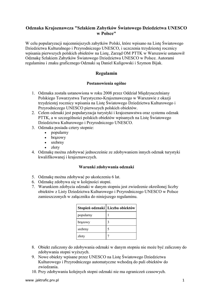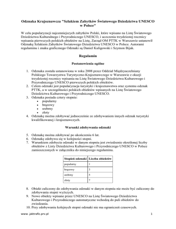 Odznaka Krajoznawcza "Szlakiem Zabytków Światowego Dziedzictwa UNESCO w Polsce" W celu popularyzacji najcenniejszych zabytków Polski, które wpisano na Listę Światowego Dziedzictwa Kulturalnego i Przyrodniczego UNESCO, i uczczenia trzydziestej rocznicy wpisania pierwszych polskich obiektów na Listę, Zarząd OM PTTK w Warszawie ustanowił Odznakę Szlakiem Zabytków Światowego Dziedzictwa UNESCO w Polsce. Autorami regulaminu i znaku graficznego Odznaki są Daniel Kuligowski i Szymon Bijak. Regulamin Postanowienia ogólne 1. Odznaka została ustanowiona w roku 2008 przez Oddział Międzyuczelniany Polskiego Towarzystwa Turystyczno-Krajoznawczego w Warszawie z okazji trzydziestej rocznicy wpisania na Listę Światowego Dziedzictwa Kulturowego i Przyrodniczego UNESCO pierwszych polskich obiektów. 2. Celem odznaki jest popularyzacja turystyki i krajoznawstwa oraz systemu odznak PTTK, a w szczególności polskich obiektów wpisanych na Listę Światowego Dziedzictwa Kulturowego i Przyrodniczego UNESCO. 3. Odznaka posiada cztery stopnie: popularny brązowy srebrny złoty 4. Odznakę można zdobywać jednocześnie ze zdobywaniem innych odznak turystyki kwalifikowanej i krajoznawczych. Warunki zdobywania odznaki 5. Odznakę można zdobywać po ukończeniu 6 lat. 6. Odznakę zdobywa się w kolejności stopni. 7. Warunkiem zdobycia odznaki w danym stopniu jest zwiedzenie określonej liczby obiektów z Listy Dziedzictwa Kulturowego i Przyrodniczego UNESCO w Polsce zamieszczonych w załączniku do niniejszego regulaminu. Stopień odznaki Liczba obiektów popularny 1 brązowy 3 srebrny 5 złoty 7 8. Obiekt zaliczony do zdobywania odznaki w danym stopniu nie może być zaliczony do zdobywania stopni wyższych. 9. Nowe obiekty wpisane przez UNESCO na Listę Światowego Dziedzictwa Kulturowego i Przyrodniczego automatyczne wchodzą do puli obiektów do zwiedzania. 10. Przy zdobywaniu kolejnych stopni odznaki nie ma ograniczeń czasowych. www .jaktrafic.prv.pl 1 Weryfikacja 11. Podstawą do weryfikacji odznaki jest kronika zwiedzanych obiektów, którą można prowadzić w dowolnej formie. W przypadku formy elektronicznej kronikę należy zapisać na trwałym nośniku, np. płyta CD. 12. W kronice powinny znaleźć się następujące informacje: imię i nazwisko oraz data i miejsce urodzenia zdobywającego, nazwa obiektu oraz potwierdzenie zwiedzania w dowolnej formie np. zdjęcia na tle obiektu, pieczątka, bilet wstępu lub podpis członka kadry programowej PTTK, w szczególności Instruktora Krajoznawstwa PTTK. 13. Odznakę weryfikują i przyznają zatwierdzone przez Komisję Krajoznawczą ZG PTTK zespoły weryfikacyjne mające prawo nadawania Regionalnej Odznaki Krajoznawczej PTTK. Postanowienia końcowe 14. Dystrybucję odznak prowadzi Oddział Międzyuczelniany PTTK w Warszawie (adres korespondencyjny Senatorska 11, 00-075 Warszawa). 15. Interpretacja niniejszego regulaminu przysługuje Zarządowi Oddziału Międzyuczelnianego PTTK w Warszawie Regulamin zatwierdzony przez ZG PTTK 29 marca 2009 r. www .jaktrafic.prv.pl 2