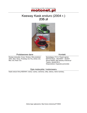 Keeway Kask enduro (2004 r.) 235 zł Podstawowe dane Rodzaj motocykla: Cross / Enduro, Rok produkcji: 2004, Stan: Nowy, Przebieg: b/d, Poj. silnika: b/d, Moc: b/d, Kolor: b/d Kontakt Sprzedający: P.H.U. Paweł Ligman MOTOCYKLE - SKUTERY - QUADY Strona WWW: http://skutery.motonet.pl Telefon: 0542874514 Województwo: Kujawsko-pomorskie Opis motocykla / motoroweru Kaski enduro firmy KEEWAY, kolory: czarny, czerwony, żółty, zielony, różne rozmiary, Adres tego ogłoszenia: http://www.motonet.pl/?10934