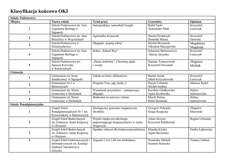 Klasyfikacja końcowa OKI Szkoły Podstawowe Miejsce 1 2 3 4 5 Nazwa szkoły Szkoła Podstawowa im. Gen. Zygmunta Berlinga w Sępopolu Szkoła Podstawowa im. Jana Brzechwy w Wojciechach Szkoła Podstawowa w Dzietrzychowie Szkoła Podstawowa im. Gen. Zygmunta Berlinga w Sępopolu Szkoła Podstawowa im. Janusza Korczaka w Krawczykach Tytuł pracy Samojeżdżący samochód Google Uczestnicy Rafał Tucki Aleksander Piluk Opiekun Krzysztof Łuszczyk Zgniatarka do puszek Maciej Dziadczyk Dominik Mitura Michał Skomorok Nikodem Maciejewski Sebastian Bartoszewicz Maciej Jarzynka Krzysztof Osowski „Ptasia stołówka”. Chronimy ptaki i owady. Damian Tomaszewski Krzysztof Owczarek Zbigniew Mielnik Gimnazjum im. Ireny Sendlerowej w Sępopolu Gimnazjum Nr 2 w Bartoszycach Gimnazjum im. Straży Granicznej w Bezledach Gimnazjum im. Straży Granicznej w Bezledach Szkoła na karty zbliżeniowe Bartek Jusiak Jakub Krzyszkowski Patryk Urbański Michał Szaknis Karolina Gładkowska Agata Kozłowska Marek Pietras Rafał Siemiński Krzysztof Łuszczyk Mariusz Rydel Zespół Szkół Ponadgimnazjalnych Nr 1 im. Kresowiaków w Bartoszycach Zespół Szkół Budowlanych im. Żołnierzy Armii Krajowej w Olsztynie Zespół Szkół Budowlanych im. Żołnierzy Armii Krajowej w Olsztynie Zespół Szkół Elektronicznych i Informatycznych im. Komisji Edukacji Narodowej w Giżycku Ekologiczny generator magnetyczny EkoMaG. Grzegorz Pokojski Kinga Rzepecka Zbigniew Murawski Projekt słupka przydrożnego poprawiającego bezpieczeństwo w ruchu drogowym Spodnie robocze dla brukarza/posadzkarza Adam Jarzyna Krzysztof Kibitlewski Regina Urbaniak Klaudia Kiszko Agata Skrzyńska Emilia Łątkowska Zegarek CAA Call-An-Ambulance Dominika Mielnik Szymon Sielawko Tomasz Gabruś Długopis „kopiuj-wklej” Robot ,,School Boy” Magdalena Magdziak Krzysztof Łuszczyk Gimnazja 1 2 3 4 Program True_app_build_2 Wynalazek przyszłości – samopiszący długopis. Bankomat na surowce wtórne Halina Jędrzejewska Halina Jędrzejewska Szkoły Ponadgimnazjalne 1 2 3 4