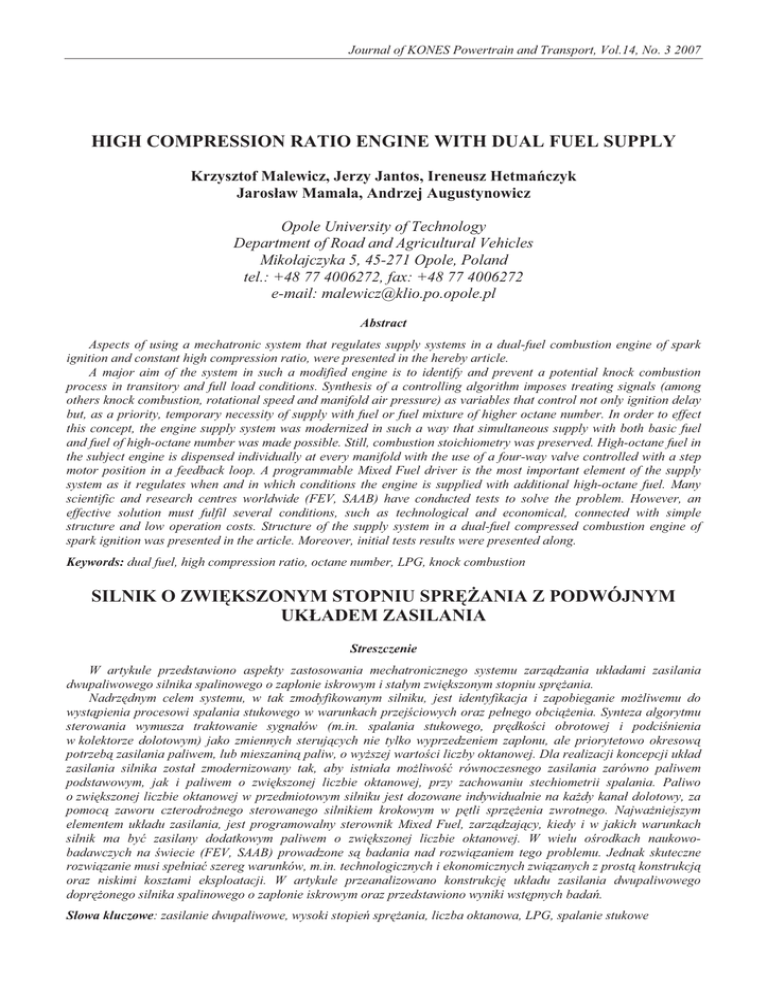 Journal of KONES Powertrain and Transport, Vol.14, No. 3 2007 HIGH COMPRESSION RATIO ENGINE WITH DUAL FUEL SUPPLY Krzysztof Malewicz, Jerzy Jantos, Ireneusz HetmaĔczyk Jarosáaw Mamala, Andrzej Augustynowicz Opole University of Technology Department of Road and Agricultural Vehicles Mikoáajczyka 5, 45-271 Opole, Poland tel.: +48 77 4006272, fax: +48 77 4006272 e-mail: [email protected] Abstract Aspects of using a mechatronic system that regulates supply systems in a dual-fuel combustion engine of spark ignition and constant high compression ratio, were presented in the hereby article. A major aim of the system in such a modified engine is to identify and prevent a potential knock combustion process in transitory and full load conditions. Synthesis of a controlling algorithm imposes treating signals (among others knock combustion, rotational speed and manifold air pressure) as variables that control not only ignition delay but, as a priority, temporary necessity of supply with fuel or fuel mixture of higher octane number. In order to effect this concept, the engine supply system was modernized in such a way that simultaneous supply with both basic fuel and fuel of high-octane number was made possible. Still, combustion stoichiometry was preserved. High-octane fuel in the subject engine is dispensed individually at every manifold with the use of a four-way valve controlled with a step motor position in a feedback loop. A programmable Mixed Fuel driver is the most important element of the supply system as it regulates when and in which conditions the engine is supplied with additional high-octane fuel. Many scientific and research centres worldwide (FEV, SAAB) have conducted tests to solve the problem. However, an effective solution must fulfil several conditions, such as technological and economical, connected with simple structure and low operation costs. Structure of the supply system in a dual-fuel compressed combustion engine of spark ignition was presented in the article. Moreover, initial tests results were presented along. Keywords: dual fuel, high compression ratio, octane number, LPG, knock combustion SILNIK O ZWIĉKSZONYM STOPNIU SPRĉĩANIA Z PODWÓJNYM UKàADEM ZASILANIA Streszczenie W artykule przedstawiono aspekty zastosowania mechatronicznego systemu zarządzania ukáadami zasilania dwupaliwowego silnika spalinowego o zapáonie iskrowym i staáym zwiĊkszonym stopniu sprĊĪania. NadrzĊdnym celem systemu, w tak zmodyfikowanym silniku, jest identyfikacja i zapobieganie moĪliwemu do wystąpienia procesowi spalania stukowego w warunkach przejĞciowych oraz peánego obciąĪenia. Synteza algorytmu sterowania wymusza traktowanie sygnaáów (m.in. spalania stukowego, prĊdkoĞci obrotowej i podciĞnienia w kolektorze dolotowym) jako zmiennych sterujących nie tylko wyprzedzeniem zapáonu, ale priorytetowo okresową potrzebą zasilania paliwem, lub mieszaniną paliw, o wyĪszej wartoĞci liczby oktanowej. Dla realizacji koncepcji ukáad zasilania silnika zostaá zmodernizowany tak, aby istniaáa moĪliwoĞü równoczesnego zasilania zarówno paliwem podstawowym, jak i paliwem o zwiĊkszonej liczbie oktanowej, przy zachowaniu stechiometrii spalania. Paliwo o zwiĊkszonej liczbie oktanowej w przedmiotowym silniku jest dozowane indywidualnie na kaĪdy kanaá dolotowy, za pomocą zaworu czterodroĪnego sterowanego silnikiem krokowym w pĊtli sprzĊĪenia zwrotnego. NajwaĪniejszym elementem ukáadu zasilania, jest programowalny sterownik Mixed Fuel, zarządzający, kiedy i w jakich warunkach silnik ma byü zasilany dodatkowym paliwem o zwiĊkszonej liczbie oktanowej. W wielu oĞrodkach naukowobadawczych na Ğwiecie (FEV, SAAB) prowadzone są badania nad rozwiązaniem tego problemu. Jednak skuteczne rozwiązanie musi speániaü szereg warunków, m.in. technologicznych i ekonomicznych związanych z prostą konstrukcją oraz niskimi kosztami eksploatacji. W artykule przeanalizowano konstrukcjĊ ukáadu zasilania dwupaliwowego doprĊĪonego silnika spalinowego o zapáonie iskrowym oraz przedstawiono wyniki wstĊpnych badaĔ. Sáowa kluczowe: zasilanie dwupaliwowe, wysoki stopieĔ sprĊĪania, liczba oktanowa, LPG, spalanie stukowe K. Malewicz, J. Jantos, I. HetmaĔczyk, J. Mamala, A. Augustynowicz 1. WstĊp Stosowanie paliw alternatywnych zarówno do silników o zapáonie iskrowym jak i samoczynnym jest znane od kilkudziesiĊciu lat [1, 2, 3]. Przy wprowadzaniu coraz ostrzejszych wymagaĔ odnoĞnie emisji substancji szkodliwych zyskują one coraz wiĊksze znaczenie. Wykorzystanie paliw alternatywnych wymaga jednak opracowania odpowiedniego systemu zasilania wraz z algorytmami zarządzającymi, aby uzyskaü wyĪsze lub przynajmniej porównywalne wskaĨniki pracy silnika spalinowego (moc, moment obrotowy, sprawnoĞü). Znane paliwa alternatywne, stosowane do zasilania silników o zapáonie iskrowym, takie jak: mieszanina propanu i butanu oraz metan, ze wzglĊdu na mniejszą wartoĞü opaáową (tab. 1), powodują obniĪenie tych wskaĨników pracy. JednakĪe znacznie wyĪsza liczba oktanowa tych paliw gazowych w stosunku do benzyny daje potencjaá zwiĊkszenia sprawnoĞci silnika o zapáonie iskrowym, a co za tym idzie zmniejszenia zuĪycia paliwa, przy niewielkiej modyfikacji technicznej. Podstawowe wielkoĞci charakterystyczne paliw gazowych i benzyny przedstawiono w tabeli 1. Tab. 1. WáasnoĞci paliw wĊglowodorowych [1, 8] Tab. 1. Comparison of hydrocarbon fuels [1, 8] Paliwo Benzyna WáaĞciwoĞci fizyko-chemiczne WartoĞü opaáowa WartoĞü opaáowa paliwa mieszanki stechiom. [MJ/m3] [MJ/m3] 43,6-45 3,44-3,91 Liczba oktanowa (LOB) 95-98 Propan - butan 50,4 3,35 106-110 Propan 83 3,3 110 Metan 55,5 3,4 130 Rozwiązaniem problemu, proponowanym przez autorów artykuáu, jest uzyskanie staáego wysokiego stopnia sprĊĪania silnika o zapáonie iskrowym i stworzenie odpowiedniego systemu zasilania „Mixed Fuel” bazującego na instalacji paliwa gazowego. Staáy stopieĔ sprĊĪania 