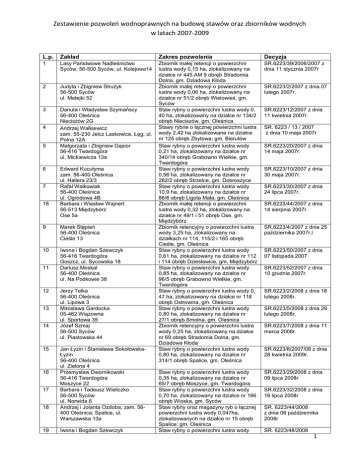 Zestawienie pozwoleń wodnoprawnych na budowę stawów oraz zbiorników wodnych w latach 2007-2009 L.p. Zakład Zakres pozwolenia Decyzja 1 Lasy Państwowe Nadleśnictwo Syców; 56-500 Syców, ul. Kolejowa14 SR.6223/39/2006/2007 z dnia 11 stycznia 2007r 2 Judyta i Zbigniew Strużyk 56-500 Syców ul. Matejki 52 3 Danuta i Władysław Szymańscy 56-400 Oleśnica Nieciszów 2G Andrzej Wałkiewicz zam. 55-230 Jelcz Laskowice, Łęg; ul. Polna 12A Małgorzata i Zbigniew Gąsior 56-416 Twardogóra ul. Mickiewicza 13a Zbiornik małej retencji o powierzchni lustra wody 0,15 ha, zlokalizowany na działce nr 445 AM 9 obręb Stradomia Dolna, gm. Dziadowa Kłoda Zbiornik małej retencji o powierzchni lustra wody 0,06 ha, zlokalizowany na działce nr 51/2 obręb Wielowieś, gm. Syców Staw rybny o powierzchni lustra wody 0, 40 ha, zlokalizowany na działce nr 134/2 obręb Nieciszów, gm. Oleśnica Stawy rybne o łącznej powierzchni lustra wody 2,42 ha zlokalizowane na działce nr 125 obręb Zbytowa; gm. Bierutów Staw rybny o powierzchni lustra wody 0,21 ha, zlokalizowany na działce nr 340/14 obręb Grabowno Wielkie, gm. Twardogóra Staw rybny o powierzchni lustra wody 0,56 ha, zlokalizowany na działce nr 282/2 obręb Strzelce, gm. Dobroszyce Staw rybny o powierzchni lustra wody 10,9 ha, zlokalizowany na działce nr 86/6 obręb Ligota Mała, gm. Oleśnica Zbiornik małej retencji o powierzchni lustra wody 0,32 ha, zlokalizowany na działce nr 49/1 i 51 obręb Ose, gm. Międzybórz Zbiornik retencyjny o powierzchni lustra wody 3,25 ha, zlokalizowany na działkach nr 114, 115/2 i 165 obręb Cieśle, gm. Oleśnica Staw rybny o powierzchni lustra wody 0,61 ha, zlokalizowany na działce nr 112 i 114 obręb Dziesławice, gm. Międzybórz Staw rybny o powierzchni lustra wody 0,85 ha, zlokalizowany na działce nr 96/5 obręb Grabowno Wielkie, gm. Twardogóra Staw rybny o powierzchni lustra wody 0, 47 ha, zlokalizowany na działce nr 118 obręb Ostrowina, gm. Oleśnica Staw rybny o powierzchni lustra wody 0,80 ha, zlokalizowany na działce nr 27/1 obręb Smolna, gm. Oleśnica Zbiornik retencyjny o powierzchni lustra wody 0,25 ha, zlokalizowany na działce nr 69 obręb Stradomia Dolna, gm. Dziadowa Kłoda Staw rybny o powierzchni lustra wody 0,80 ha, zlokalizowany na działce nr 314/1 obręb Spalice, gm. Oleśnica Staw rybny o powierzchni lustra wody 0,35 ha, zlokalizowany na działce nr 65/7 obręb Moszyce, gm. Twardogóra Staw rybny o powierzchni lustra wody 0,70 ha, zlokalizowany na działce nr 166 obręb Wioska, gm. Syców Staw rybny oraz magazyny ryb o łącznej powierzchni lustra wody 0,047ha, zlokalizowanych na działce nr 15 obręb Spalice; gm. Oleśnica Staw rybny o powierzchni lustra wody SR.6223/29/2008 z dnia 09 lipca 2008r 4 5 6 7 18 Edward Kucułyma zam. 56-400 Oleśnica ul. Hallera 23/3 Rafał Walkowiak 56-400 Oleśnica ul. Ogrodowa 4B Barbara i Wiesław Wajnert 56-513 Międzybórz Ose 5a 9 Marek Stępień 56-400 Oleśnica Cieśle 13 10 Iwona i Bogdan Szewczyk 56-416 Twardogóra Goszcz, ul. Sycowska 18 Dariusz Moskal 56-400 Oleśnica ul. Na Podkowie 38 11 12 13 14 15 16 17 18 19 Jerzy Telka 56-400 Oleśnica ul. Lipowa 3 Mirosława Gardocka 05-462 Wiązowna ul. Sportowa 35 Józef Szmaj 56-500 Syców ul. Piastowska 44 Jan Łyzin i Stanisława SokołowskaŁyzin 56-400 Oleśnica ul. Zielona 4 Przemysław Dwornikowski 56-416 Twardogóra Moszyce 22 Barbara i Tadeusz Wieliczko 56-500 Syców ul. Norwida 6 Andrzej i Jolanta Ozdoba; zam. 56400 Oleśnica; Spalice, ul. Warszawska 13a Iwona i Bogdan Szewczyk SR.6223/2/2007 z dnia 07 lutego 2007r. SR.6223/12/2007 z dnia 11 kwietnia 2007r. SR. 6223 / 13 / 2007 z dnia 10 maja 2007r SR.6223/20/2007 z dnia 14 maja 2007r. SR.6223/10/2007 z dnia 30 maja 2007r. SR.6223/30/2007 z dnia 24 lipca 2007r. SR.6223/44/2007 z dnia 14 sierpnia 2007r. SR.6223/4/2007 z dnia 25 października 2007r.l SR.6223/50/2007 z dnia 07 listopada 2007 SR.6223/52/2007 z dnia 10 grudnia 2007r. SR.6223/2/2008 z dnia 18 lutego 2008r. SR.6223/5/2008 z dnia 29 lutego 2008r. SR.6223/7/2008 z dnia 11 marca 2008r. SR.6223/8/2007/08 z dnia 28 kwietnia 2009r. SR.6223/32/2008 z dnia 16 lipca 2008r SR. 6223/44/2008 z dnia 08 października 2008r SR. 6223/48/2008 1 Zestawienie pozwoleń wodnoprawnych na budowę stawów oraz zbiorników wodnych w latach 2007-2009 20 21 zam. 56-416 Twardogóra, Goszcz, ul. Sycowska 18 Tomasz Bernacki, zam. 56-400 Oleśnica, ul. Sikorskiego 1c/9 Jadwiga Banach zam. 56-416 Twardogóra Drogoszowice 47 22 Lasy Państwowe Nadleśnictwo Syców; 56-500 Syców, ul. Kolejowa14 23 Ryszard Stemplewski zam. 56-400 Oleśnica, Boguszyce 84a 24 Adam Jarmołkowicz zam. 56-500 Syców, Wioska 37B Jacek Duryń, zam. 56-513 Międzybórz, ul. Wierzbowa 2 25 26 27 Tomasz Duryń zam. 56-513 Międzybórz ul. Wierzbowa 2 Lasy Państwowe Nadleśnictwo Syców; 56-500 Syców, ul. Kolejowa14 28 Ryszard Laszczyk zam. 51-170 Wrocław, ul. Torfowa 43 29 Ryszard Stemplewski zam. 56-400 Oleśnica, Boguszyce 84a 30 Paweł Olejarczyk, zam. 56-400 Oleśnica, ul. Klonowa 8a/5 Jan Smorawski 56-500 Syców Zawada 41 31 32 33 34 35 Witold Grzesiak zam. 52-416 Wrocław, ul. Solskiego 40/1 Adam Stryjek, zam. 56-400 Oleśnica, ul. Reymonta 1/5 Marek Myjkowski zam. 56-400 Oleśnica, Dąbrowa 20A Piotr Łaskawski zam. 56-410 Dobroszyce Łuczyna Wielka 25 36 Joanna Oczkowska zam. 56-416 Twardogóra, ul. Paderewskiego 6d/3 37 Andrzej Gnatkiewicz 1,09 ha, zlokalizowany na działce nr 127/4 obręb Goszcz; gm. Twardogóra Stawy rybne o łącznej powierzchni lustra wody 0,63 ha zlokalizowane na działce nr 191/6 obręb Dobra; gm. Dobroszyce z dnia 21 października 2008r SR. 6223/39/2008 z dnia 12 listopada 2008r Staw rybny o powierzchni lustra wody 1,62 ha, zlokalizowany na działce nr 334/12 obręb Drogoszowice; gm. Twardogóra Zbiornik małej retencji o powierzchni lustra wody 0,22 ha, zlokalizowany na działce nr 328 obręb Ose, gm. Międzybórz Zbiornik małej retencji o powierzchni lustra wody 0,22ha, zlokalizowany na