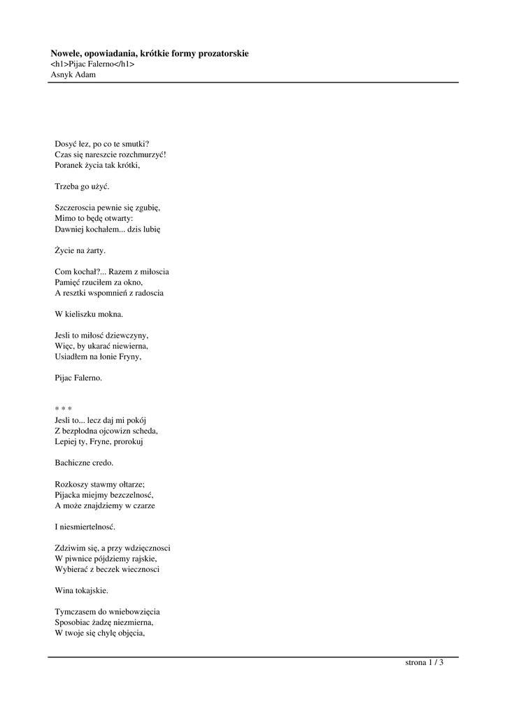 Nowele, opowiadania, krótkie formy prozatorskie <h1>Pijac Falerno</h1> Asnyk Adam Dosyć łez, po co te smutki? Czas się nareszcie rozchmurzyć! Poranek życia tak krótki, Trzeba go użyć. Szczeroscia pewnie się zgubię, Mimo to będę otwarty: Dawniej kochałem... dzis lubię Życie na żarty. Com kochał?... Razem z miłoscia Pamięć rzuciłem za okno, A resztki wspomnień z radoscia W kieliszku mokna. Jesli to miłosć dziewczyny, Więc, by ukarać niewierna, Usiadłem na łonie Fryny, Pijac Falerno. *** Jesli to... lecz daj mi pokój Z bezpłodna ojcowizn scheda, Lepiej ty, Fryne, prorokuj Bachiczne credo. Rozkoszy stawmy ołtarze; Pijacka miejmy bezczelnosć, A może znajdziemy w czarze I niesmiertelnosć. Zdziwim się, a przy wdzięcznosci W piwnice pójdziemy rajskie, Wybierać z beczek wiecznosci Wina tokajskie. Tymczasem do wniebowzięcia Sposobiac żadzę niezmierna, W twoje się chylę objęcia, strona 1 / 3 Nowele, opowiadania, krótkie formy prozatorskie <h1>Pijac Falerno</h1> Asnyk Adam Pijac Falerno. *** Winnice na grobach rosna, A zatem z tych winogradów Ożywiam wenę miłosna Prochem pradziadów. Życie nad smiercia przeważa, Bo taka istnienia kolej; Wypijmy zdrowie grabarza... Wina mi dolej! Kto jeszcze nie przestał szlochać, Ten pewnie z własnej swej winy Nie może już pić... ni kochać Ładnej dziewczyny. Niech się więc kruszy przed niebem, Gotujac się in aeterno, Pójdę za jego pogrzebem, Pijac Falerno. *** Kto mi przerywa?... to duchy... Znane mi kiedys przed chwila... Brzakaja w swoje łańcuchy, Mówić się sila. Chodzcie tu, moi najszczersi, Grzać się miłoscia i winem, Wszak nieraz piersia przy piersi Bylismy czynem. Dzis wy cieniami marnemi, Skrwawione chylicie usta, Mnie zas tu trzyma do ziemi Dziewczyna pusta. Więc klnijmy w pijanym szale Opatrznosć niemiłosierna... W łeb sobie jutro wypalę, strona 2 / 3 Nowele, opowiadania, krótkie formy prozatorskie <h1>Pijac Falerno</h1> Asnyk Adam Pijac Falerno. 29 pazdziernik 1867 bielizna Ledapol Piękne oczy zwodzą, piękne sółwka mamią. strona 3 / 3