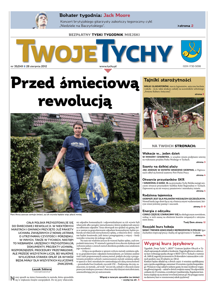Bohater tygodnia: Jack Moore Koncert brytyjskiego gitarzysty zakończy tegoroczny cykl „Niedziele na Baczyńskiego”. >strona 2 bezpŁatny tyski tygodnik Miejski 28 sierpnia 2012 www.tychy.pl ISSN 1730-5098 Walki gladiatorów, starcia legionistów, antyczna kuchnia i szkoła – m.in. takie atrakcje czekały na uczestników sobotniego „Festynu Kultury Antycznej”. strona 8 Eliza Madej Przed śmieciową rewolucją Tajniki starożytności Eliza Madej nr 35/249 na Twoich stronach: Wakacje w... jeden dzień W miniony czwartek, w urzędzie miasta podpisano umowę na wykonanie projektu Parku Wodnego w Tychach. strona 3 Szanty na dzikiej plaży Jak zawsze w ostatni weekend sierpnia, w Paprocanach odbył się festiwal szantowy Port Pieśni Pracy. strona 4 Otwarcie przystanków SKR 1 września, o godz. 10, na przystanku Tychy Bielska nastąpi uroczyste otwarcie przystanków Szybkiej Kolei Regionalnej w Tychach. Zaproszeni są na nie wszyscy pasażerowie i mieszkańcy miasta. strona 4 Rodzinna tajemnica Sierpień jest dla Polaków miesiącem szczególnym. Niemal każdy jego dzień łączy się z historycznymi wydarzeniami, którym winni jesteśmy pamięć i szacunek. strony 8–9 Energia z odzysku Pani Anna zawsze sortuje śmieci, za ich wywóz będzie więc płacić mniej. Cała Polska przygotowuje się do śmieciowej rewolucji. W niektórych miastach i gminach przyjęto już pakiety uchwał związanych z nową ustawą o utrzymaniu czystości i porządku. w innych, także w Tychach, nastąpi to niebawem. Urzędnicy przygotowują dokumenty, projekty uchwał, rozporządzeń, procedury przetargowe, ale przede wszystkim liczą. Bo właśnie wyliczenia stawek opłat za wywóz będą miały dla wszystkich kluczowe znaczenie. Leszek Sobieraj [email protected] N owy sposób na śmieci komunalne to metoda, która sprawdziła się w większości krajów europejskich. Do tej pory właściciela- mi odpadów komunalnych i odpowiedzialnymi za ich wywóz byli właściciele albo zarządcy nieruchomości, którzy podpisywali umowy na odbieranie odpadów. Teraz obowiązek ten spadnie na gminę, która w zamian za gospodarowanie odpadami komunalnymi, będzie pobierała od właścicieli nieruchomości opłatę, a właściwie dwie – mniej nas będzie kosztowało, jeśli śmieci posegregujemy, a więcej – kiedy wszystko wrzucimy do jednego worka. Na razie nie wiadomo jeszcze ile wynosić będzie opłata, czyli tzw. podatek śmieciowy. W miastach i gminach trwa obecnie dyskusja nad wyborem jednej z czterech metod określenia podatku oraz ustaleniem jego wysokości. – 24 lipca na spotkaniu w sprawie wyboru metody ustalania opłaty za gospodarowanie odpadami komunalnymi, po kolejnej analizie wad i zalet proponowanych ustawą metod, podjęto decyzję o przygotowaniu projektów uchwał z zastosowaniem metody ustalania opłaty w oparciu o ilość mieszkańców zamieszkujących daną nieruchomość – powiedziała Ewa Grudniok, rzecznik UM. – Podejmując decyzję, zaznaczono, że metoda „od wody” nie jest zła, jednak w obecnym stanie prawa jest niedoprecyzowana i obarczona zbyt dużymi nieścisłościami, uniemożliwiającymi jej zastosowanie. Więcej o nowym sposobie na śmieci – czytaj na str. 5 Coraz częściej zwracamy się ku ekologicznym nowinkom, widząc w nich szansę na obniżenie kosztów związanych z utrzymaniem domu. Twój Dom strona 12 Rosyjski kurs hokeja Nowy trener hokejowej reprezentacji Polski Igor Zacharkin rozpoczął pracę z kadrą od zgrupowania w Tychach. strona 14 Wygraj kurs językowy Tygodnik „Twoje Tychy” i „BEST” Centrum Języków Obcych w Tychach zapraszają do udziału w konkursie. Nagroda główna to całoroczny kurs wybranego języka obcego w BEST CJO w Tychach o wartości ok. 1600 zł, nagrody pocieszenia to 20 słowników i samouczków z różnych języków oraz 20 rabatów po 100 zł. Konkurs będzie składał się z dwóch części: 4 września opublikujemy quiz z języka angielskiego, natomiast 18 września z języka hiszpańskiego. Wystarczy wziąć udział w jednym quizie, by mieć możliwość wygrania głównej nagrody – udział w dwóch zwiększa szansę! Na odpowiedzi czekamy do 25 września, a wyniki już 2 października. Regulamin konkursu znajduje się na stronie www.bestcentrum.pl. Nie przegap szansy na darmowy kurs w renomowanej szkole językowej! T woje 2 tychy 28 sierpni a 2012 www.tychy.pl idzie tydzień Bohater tygodnia FELIETON Bluesowy koniec lata Dogonić Europę Beata Kurek C zy wiecie, że tona makulatury pozwala oszczędzić 17 drzew; szkło można bez strat przetworzyć na opakowanie identyczne do tego, jakim było poprzednio; tworzywa sztuczne będą rozkładać się kilka tysięcy lat, tymczasem z odzyskanych opakowań PET można wyprodukować meble? Gminy przygotowują się do „śmieciowej rewolucji” (piszemy o niej na stronach 1 i 5). Na razie nie wiemy jeszcze, ile będziemy płacić za wywóz nieczystości i jak w codziennym życiu sprawdzą się nowe uregulowania. Jest jednak szansa, że zmiany, jakie niesie ze sobą nowa ustawa, pomogą raz na zawsze pozbyć się małych, nielegalnych wysypisk śmieci. O tym, że problem istnieje, nie trzeba chyba nikogo przekonywać. Worki z nieczystościami, leżące w przydrożnych rowach lub – o zgrozo – na leśnych ścieżkach, są widokiem wcale nierzadkim. I choć w ciągu ostatnich lat wiele się w tej kwestii zmieniło, wciąż mamy powody do wstydu. Zwłaszcza, jeśli chodzi o recykling. Europa jest dziesiątki lat przed nami... Dla przykładu, Szwedzi i Niemcy segregują ponad 90 proc. śmieci. Nowe regulacje mają wejść w życie najpóźniej w połowie przyszłego roku i wtedy – jak przekonują urzędnicy – nikomu nie będzie już opłacało się wyrzucać śmieci byle gdzie, albo palić ich w domowych piecach, skoro i tak opłaty za ich wywóz będą pobierane „od głowy”. Mało tego, ci, którzy zdecydują się sortować odpady, za wywóz śmieci mają obowiąz