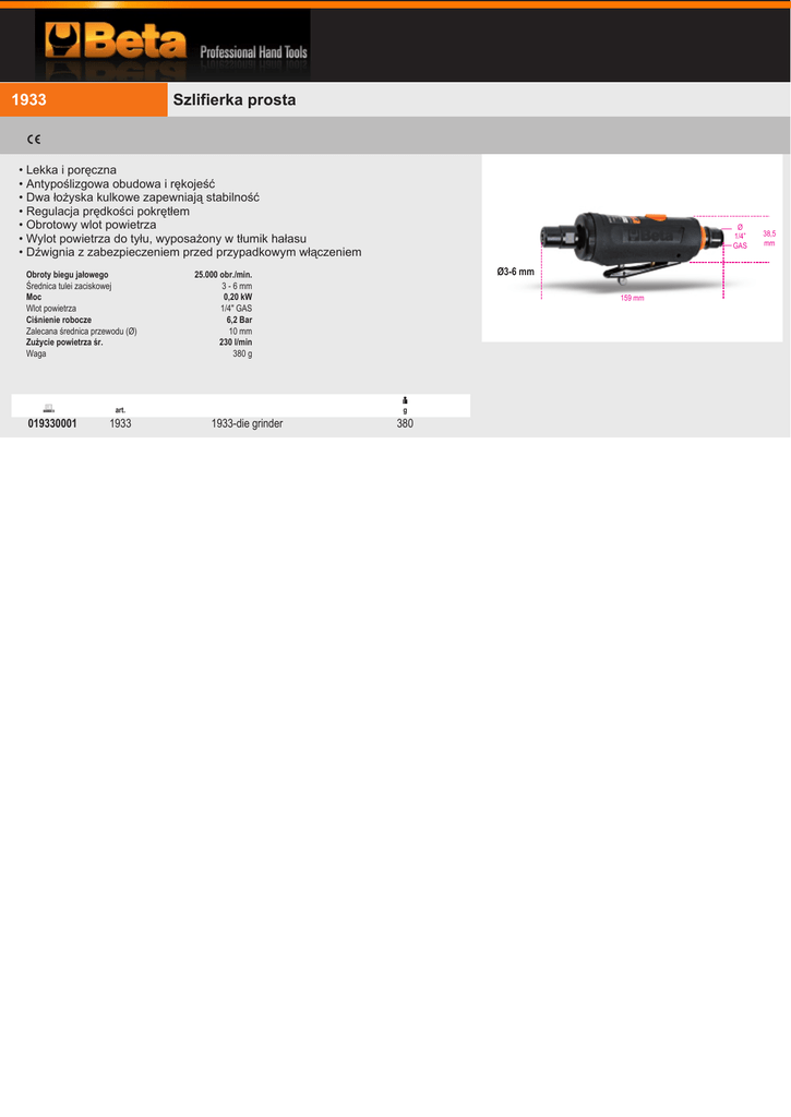 1933 Szlifierka prosta • Lekka i poręczna • Antypoślizgowa obudowa i rękojeść • Dwa łożyska kulkowe zapewniają stabilność • Regulacja prędkości pokrętłem • Obrotowy wlot powietrza • Wylot powietrza do tyłu, wyposażony w tłumik hałasu • Dźwignia z zabezpieczeniem przed przypadkowym włączeniem Obroty biegu jałowego Średnica tulei zaciskowej Moc Wlot powietrza Ciśnienie robocze Zalecana średnica przewodu (Ø) Zużycie powietrza śr. Waga 019330001 Ø3-6 mm 25.000 obr./min. 3 - 6 mm 0,20 kW 1/4" GAS 6,2 Bar 10 mm 230 l/min 380 g 159 mm g art. 1933 Ø 1/4” GAS 1933-die grinder 380 38,5 mm