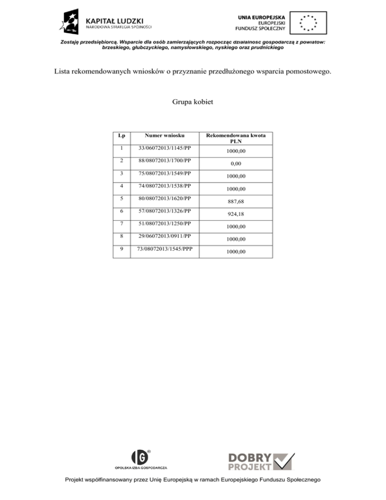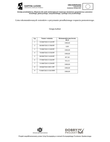 Zostaję przedsiębiorcą. Wsparcie dla osób zamierzających rozpocząć działalność gospodarczą z powiatów: brzeskiego, głubczyckiego, namysłowskiego, nyskiego oraz prudnickiego Lista rekomendowanych wniosków o przyznanie przedłużonego wsparcia pomostowego. Grupa kobiet Lp Numer wniosku 1 33/06072013/1145/PP 2 88/08072013/1700/PP 3 75/08072013/1549/PP 4 74/08072013/1538/PP 5 80/08072013/1620/PP 6 57/08072013/1326/PP 7 51/08072013/1250/PP 8 29/06072013/0911/PP 9 73/08072013/1545/PPP Rekomendowana kwota PLN 1000,00 0,00 1000,00 1000,00 887,68 924,18 1000,00 1000,00 1000,00 Projekt współfinansowany przez Unię Europejską w ramach Europejskiego Funduszu Społecznego Zostaję przedsiębiorcą. Wsparcie dla osób zamierzających rozpocząć działalność gospodarczą z powiatów: brzeskiego, głubczyckiego, namysłowskiego, nyskiego oraz prudnickiego Lista rekomendowanych wniosków o przyznanie przedłużonego wsparcia pomostowego. Grupa mężczyzn Lp. Numer wniosku Rekomendowana kwota PLN 1000,00 1 38/06072013/1300/PP 2 99/08072013/1805/PP 1000,00 3 03/04072013/1020/PP 1000,00 4 25/05072013/1634/PP 807,83 5 24/05072013/1652/PP 807,83 6 37/06072013/1236/PP 1000,00 7 02/04072013/1005/PP 996,18 8 94/08072013/1741/PP 936,16 9 42/08072013/0855/PP 991,18 10 52/08072013/1251/PP 0,00 11 08/04072013/1500/PP 1000,00 12 77/08072013/1552/PP 1000,00 13 76/08072013/1551/PP 672,26 14 61/08072013/1408/PP 781,53 Projekt współfinansowany przez Unię Europejską w ramach Europejskiego Funduszu Społecznego