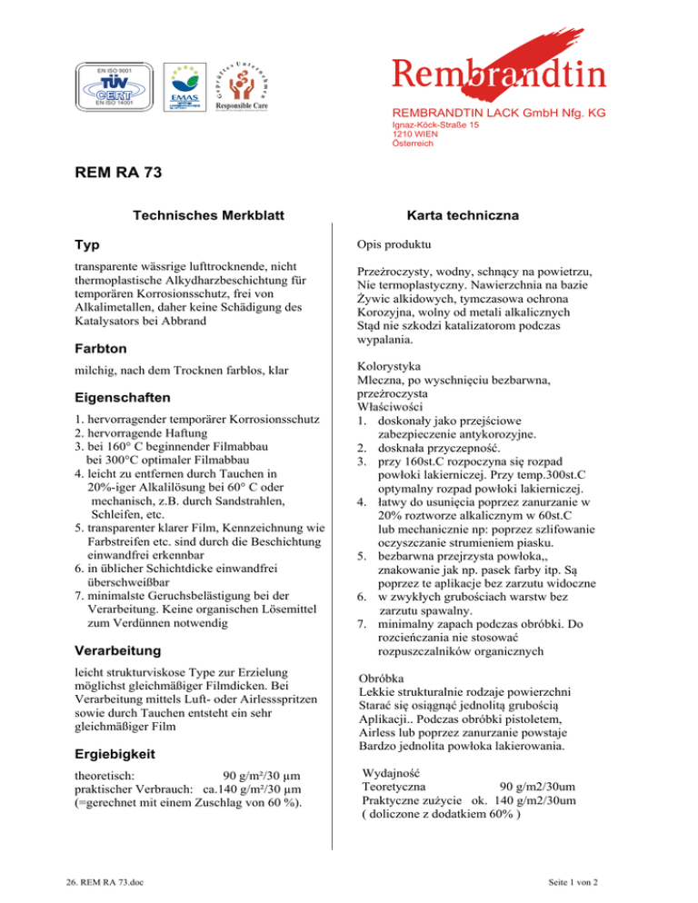 ft prü Unte r ehmen Ge es n EN ISO 9001 EN ISO 14001 Eine Initiative für Gesundheit, Sicherheit und Umwelt REMBRANDTIN LACK GmbH Nfg. KG Ignaz-Köck-Straße 15 1210 WIEN Österreich REM RA 73 Technisches Merkblatt Karta techniczna Typ Opis produktu transparente wässrige lufttrocknende, nicht thermoplastische Alkydharzbeschichtung für temporären Korrosionsschutz, frei von Alkalimetallen, daher keine Schädigung des Katalysators bei Abbrand Przeżroczysty, wodny, schnący na powietrzu, Nie termoplastyczny. Nawierzchnia na bazie Żywic alkidowych, tymczasowa ochrona Korozyjna, wolny od metali alkalicznych Stąd nie szkodzi katalizatorom podczas wypalania. Farbton milchig, nach dem Trocknen farblos, klar Eigenschaften 1. hervorragender temporärer Korrosionsschutz 2. hervorragende Haftung 3. bei 160° C beginnender Filmabbau bei 300°C optimaler Filmabbau 4. leicht zu entfernen durch Tauchen in 20%-iger Alkalilösung bei 60° C oder mechanisch, z.B. durch Sandstrahlen, Schleifen, etc. 5. transparenter klarer Film, Kennzeichnung wie Farbstreifen etc. sind durch die Beschichtung einwandfrei erkennbar 6. in üblicher Schichtdicke einwandfrei überschweißbar 7. minimalste Geruchsbelästigung bei der Verarbeitung. Keine organischen Lösemittel zum Verdünnen notwendig Verarbeitung leicht strukturviskose Type zur Erzielung möglichst gleichmäßiger Filmdicken. Bei Verarbeitung mittels Luft- oder Airlessspritzen sowie durch Tauchen entsteht ein sehr gleichmäßiger Film Ergiebigkeit theoretisch: 90 g/m²/30 µm praktischer Verbrauch: ca.140 g/m²/30 µm (=gerechnet mit einem Zuschlag von 60 %). 26. REM RA 73.doc Kolorystyka Mleczna, po wyschnięciu bezbarwna, przeżroczysta Właściwości 1. doskonały jako przejściowe zabezpieczenie antykorozyjne. 2. dosknała przyczepność. 3. przy 160st.C rozpoczyna się rozpad powłoki lakierniczej. Przy temp.300st.C optymalny rozpad powłoki lakierniczej. 4. łatwy do usunięcia poprzez zanurzanie w 20% roztworze alkalicznym w 60st.C lub mechanicznie np: poprzez szlifowanie oczyszczanie strumieniem piasku. 5. bezbarwna przejrzysta powłoka,, znakowanie jak np. pasek farby itp. Są poprzez te aplikacje bez zarzutu widoczne 6. w zwykłych grubościach warstw bez zarzutu spawalny. 7. minimalny zapach podczas obróbki. Do rozcieńczania nie stosować rozpuszczalników organicznych Obróbka Lekkie strukturalnie rodzaje powierzchni Starać się osiągnąć jednolitą grubością Aplikacji.. Podczas obróbki pistoletem, Airless lub poprzez zanurzanie powstaje Bardzo jednolita powłoka lakierowania. Wydajność Teoretyczna 90 g/m2/30um Praktyczne zużycie ok. 140 g/m2/30um ( doliczone z dodatkiem 60% ) Seite 1 von 2 Technisches Merkblatt Rembrandtin Lack Rozcienczanie Woda Verdünnung Wasser Trocknung bei 30 µm staubfrei griffest Technical Data Sheet ca. 30 Minuten ca. 2 Stunden Viskosität ca. 90 s DIN 4 mm Spez. Gewicht Schnięcie przy 30 um Bezpyłowy Dotykalny ok. 30min. ok. 2 godz. Lepkość Ok. 90 s DIN 4 mm Ciężar właściwy Ok. 1,0 g/cm3 ca. 1,0 g/cm³ Festkörper Ciała stałe ca.. 34% Volumen, 37% Gewicht Ok. 34% objętości, 37% ciężaru Anwendungseinschränkung Ograniczenia podczas obróbki nicht unter +8°C verarbeiten Nie obrabiać poniżej + 8st.C ! Lagerfähigkeit Składowanie in Originalgebinde 1 Jahr ab Herstellungsdatum Verpackung Hobbocks zu 25 kg Lagerung frostfrei VbF-Klassifizierung W oryginalnych pojemnikach 1 rok od daty Produkcji. Opakowania Hobbok 25kg Magazynowanie Powyżej 0st. C Klasyfikacja VbF Nie dotyczy entfällt Rembrandtin Lack GmbH Nfg. KG Ignaz-Köck-Straße 15 A-1210 Wien www.rembrandtin.com Mail: Tel: Fax: [email protected] +43 1 27702-0 +43 1 27702-40 24/08/05 26. REM RA 73.doc Seite 2 von 2