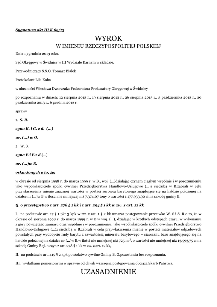 Sygnatura akt III K 69/13 WYROK W IMIENIU RZECZYPOSPOLITEJ POLSKIEJ Dnia 13 grudnia 2013 roku. Sąd Okręgowy w Świdnicy w III Wydziale Karnym w składzie: Przewodniczący S.S.O. Tomasz Białek Protokolant Lila Koba w obecności Wiesława Dworczaka Prokuratora Prokuratury Okręgowej w Świdnicy po rozpoznaniu w dniach: 12 sierpnia 2013 r., 19 sierpnia 2013 r., 26 sierpnia 2013 r., 3 października 2013 r., 30 października 2013 r., 6 grudnia 2013 r. sprawy 1. S. R. syna K. i G. z d. (...) ur. (...) w O. 2. W. S. syna E.i F.z d.(...) ur. (...)w B. oskarżonych o to, że: w okresie od sierpnia 1998 r. do marca 1999 r. w B., woj. (...)działając czynem ciągłym wspólnie i w porozumieniu jako współwłaściciele spółki cywilnej Przedsiębiorstwa Handlowo-Usługowe (...)z siedzibą w B.zabrali w celu przywłaszczenia mienie znacznej wartości w postaci surowca barytowego znajdujące się na hałdzie położonej na działce nr (...)w B.w ilości nie mniejszej niż 7.374.07 tony o wartości 1.177.933,90 zł na szkodę gminy B. tj. o przestępstwo z art. 278 § 1 kk i z art. 294 § 1 kk w zw. z art. 12 kk I. na podstawie art. 17 § 1 pkt 3 kpk w zw. z art. 1 § 2 kk umarza postępowanie przeciwko W. S.i S. R.o to, że w okresie od sierpnia 1998 r. do marca 1999 r. w B.w woj. (...), działając w krótkich odstępach czasu, w wykonaniu z góry powziętego zamiaru oraz wspólnie i w porozumieniu, jako współwłaściciele spółki cywilnej Przedsiębiorstwo Handlowo-Usługowe (...)z siedzibą w B.zabrali w celu przywłaszczenia mienie w postaci materiałów odpadowych powstałych przy wydobyciu rudy barytu z zawartością minerału barytowego – siarczanu baru znajdującego się na hałdzie położonej na działce nr (...)w B.w ilości nie mniejszej niż 725 m 3, o wartości nie mniejszej niż 13.593,75 zł na szkodę Gminy B.tj. o czyn z art. 278 § 1 kk w zw. z art. 12 kk, II. na podstawie art. 415 § 2 kpk powództwo cywilne Gminy B. G.pozostawia bez rozpoznania, III. wydatkami poniesionymi w sprawie od chwili wszczęcia postępowania obciąża Skarb Państwa. UZASADNIENIE Na podstawie zebranego w sprawie materiału dowodowego Sąd ustalił następujący stan faktyczny: Decyzją Wojewody (...)z dnia (...)stwierdzono nieodpłatne nabycie przez Gminę B.nieruchomości w postaci działki gruntu o nr (...)G., o powierzchni 0,3101 ha wraz ze znajdującą się na niej i stanowiącą część składową tej nieruchomości hałdą, położoną przy dawnym szybie (...) Kopalni (...)w B.. Hałda ta powstawała od 1840 r., kiedy to rozpoczęto wydobycie barytu. Na mapie z 1954 roku hałda ta była opisana jako „zwały kamienia”. Do dnia dzisiejszego działka na której usytuowana była hałda nie jest użytkowana, leżąc odłogiem, nie była wystawiana przez właściciela na sprzedaż, nikt też nie zgłaszał się z chęcią jej kupna. W planie zagospodarowania przestrzennego, zatwierdzonego uchwałą opublikowaną dnia (...)działka położona jest na terenie przeznaczonym do zabudowy mieszkaniowo – usługowej, brak jest natomiast w tym planie uwag i odniesień do hałd pokopalnianych. Dowód: decyzja Wojewody (...) wraz z załącznikami k 5344-5350, 6132-6139 pismo Urzędu Miasta w B.wraz z załącznikami k 5805-5813 zeznania świadków B. N.k 5782-5783 M. N. k 4760-4761, 4787-4788 mapa z 1954 r. k 6076 W dniu 12 czerwca 1995 r. oskarżeni W. S.i S. R.zawarli ze sobą umowę spółki cywilnej, obejmując w niej po 50 % udziałów. Przedmiotem działalności spółki było prowadzenie działalności gospodarczej, między innymi w zakresie świadczenia usług transportowych, handlu hurtowego i detalicznego, zakupu i sprzedaży złomu stalowego oraz prowadzenie wszelkiej działalności gospodarczej nie podlegającej koncesjonowaniu. Aneksem do tej umowy, sporządzonym dnia (...)., do spółki przystąpili D. R.i M. S., w rezultacie czego każdy ze wspólników objął po 25 % udziałów. Spółka ta została wpisana do ewidencji działalności gospodarczej pod nazwą Przedsiębiorstwo-Handlowo Usługowe (...) S Spółka Cywilnaz siedzibą w W.. Na mocy kolejnego aneksu z dnia (...)do przedmiotu działania spółki dodano przerób kopalin i obrót nimi. Dowód: umowa spółki cywilnej k 402-404 aneksy do umowy spółki k 405-406, 408, 409 zaświadczenie o wpisie do ewidencji działalności gospodarczej k 413 Na mocy aktu notarialnego z dnia (...)Kopalnia (...) Spółka z ograniczoną odpowiedzialnością, reprezentowana przez J. G.i V. Ł., sprzedała W. S., S. R., D. R.i M. S.prawo użytkowania wieczystego działki gruntu nr (...)o powierzchni 1 hektara 32 arów i 34 metrów kwadratowych wraz z własnością posadowionego na tej działce i stanowiącego odrębną nieruchomość budynku-warsztatu samochodowego. Dowód: akt notarialny k 390-394 Postanowieniem Sądu Rejonowego w Wałbrzychu z dnia 4 lipca 1997 r. , sygn. akt VI Ns 13/97 ogłoszono upadłość Kopalni (...) Spółki z ograniczoną odpowiedzialnościąw B., wyznaczając na syndyka masy upadłości R. S., zaś na jego zastępcę W. B.. Dowód: postanowienie Sądu Rejonowego w Wałbrzychu k 776 W dniu (...)spółka cywilna reprezentowana przez obu oskarżonych wygrała kwotą 364050 zł przetarg nieograniczony na sprzedaż działki nr (...), działki nr (...)oraz działki nr (...)wraz z zabudowaniami. W dniu (...)syndyk R. S.działający w imieniu Kopalni (...)w upadłości z/ś w B.zawarł w formie aktu notarialnego ze S. R., W. S., D. R.i M. S.umowę przedwstępną sprzedaży prawa użytkowania wieczystego działki nr (...)o powierzchni (...)m 2 położonej w B.przy ulicy (...)oraz własność stojącego na niej budynku użytkowego, stanowiącego odrębną nieruchomość, prawo użytkowania wieczystego działki nr (...)o powierzchni (...)m 2, położonej w B.przy ulicy (...)oraz własność budynków i budowli stojących na tej działce, stanowiących odrębną nieruchomość, prawo użytkowania wieczystego działki nr (...)o pow