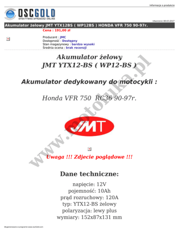 Informacje o produkcie Utworzono 08-03-2017 Akumulator żelowy JMT YTX12BS ( WP12BS ) HONDA VFR 750 90-97r. Cena : 191,00 zł Producent : JMC Dostępność : Dostępny Stan magazynowy : bardzo wysoki Średnia ocena : brak recenzji a. pl Akumulator żelowy JMT YTX12-BS ( WP12-BS ) uk Akumulator dedykowany do motocykli : w w w .m ot ol Honda VFR 750 RC36 90-97r. Uwaga !!! Zdjecie poglądowe !!! Dane techniczne: napięcie: 12V pojemność: 10Ah prąd rozruchowy: 120A typ: YTX12-BS żelowy polaryzacja: lewy plus wymiary: 152x87x131 mm Wygenerowano w programie www.oscGold.com w w w .m ot ol uk a. pl (szerokość/głębokość/wysokość) waga: 3.90 kg