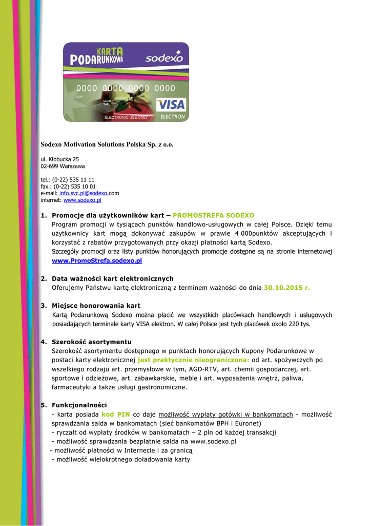 Sodexo Motivation Solutions Polska Sp. z o.o. ul. Kłobucka 25 02-699 Warszawa tel.: (0-22) 535 11 11 fax.: (0-22) 535 10 01 e-mail: [email protected] internet: www.sodexo.pl 1. Promocje dla użytkowników kart – PROMOSTREFA SODEXO Program promocji w tysiącach punktów handlowo-usługowych w całej Polsce. Dzięki temu użytkownicy kart mogą dokonywać zakupów w prawie 4 000punktów akceptujących i korzystać z rabatów przygotowanych przy okazji płatności kartą Sodexo. Szczegóły promocji oraz listy punktów honorujących promocje dostępne są na stronie internetowej www.PromoStrefa.sodexo.pl 2. Data ważności kart elektronicznych Oferujemy Państwu kartę elektroniczną z terminem ważności do dnia 30.10.2015 r. 3. Miejsce honorowania kart Kartą Podarunkową Sodexo można płacić we wszystkich placówkach handlowych i usługowych posiadających terminale karty VISA elektron. W całej Polsce jest tych placówek około 220 tys. 4. Szerokość asortymentu Szerokość asortymentu dostępnego w punktach honorujących Kupony Podarunkowe w postaci karty elektronicznej jest praktycznie nieograniczona: od art. spożywczych po wszelkiego rodzaju art. przemysłowe w tym, AGD-RTV, art. chemii gospodarczej, art. sportowe i odzieżowe, art. zabawkarskie, meble i art. wyposażenia wnętrz, paliwa, farmaceutyki a także usługi gastronomiczne. 5. Funkcjonalności - karta posiada kod PIN co daje możliwość wypłaty gotówki w bankomatach - możliwość sprawdzania salda w bankomatach (sieć bankomatów BPH i Euronet) - ryczałt od wypłaty środków w bankomatach – 2 pln od każdej transakcji - możliwość sprawdzania bezpłatnie salda na www.sodexo.pl - możliwość płatności w Internecie i za granicą - możliwość wielokrotnego doładowania karty